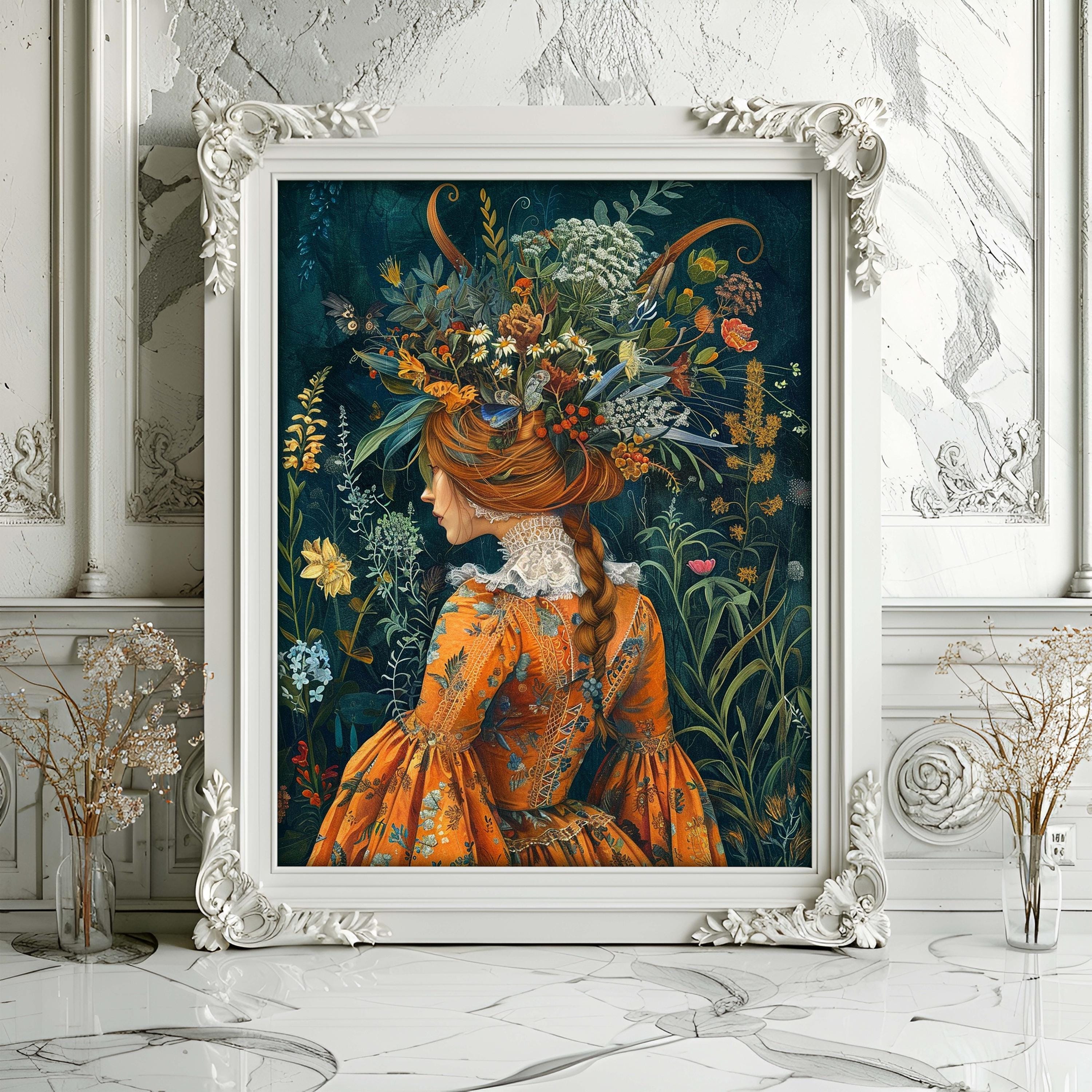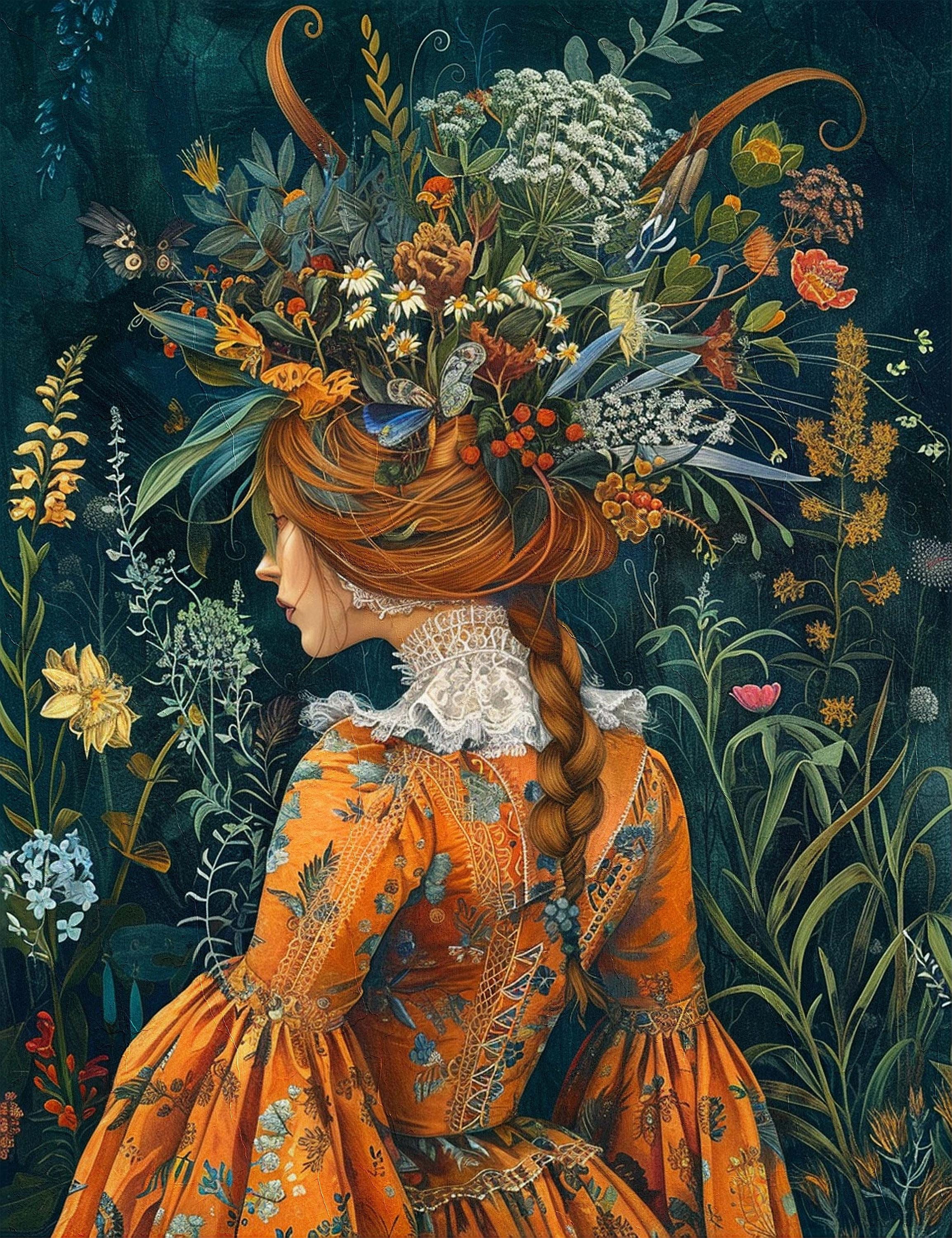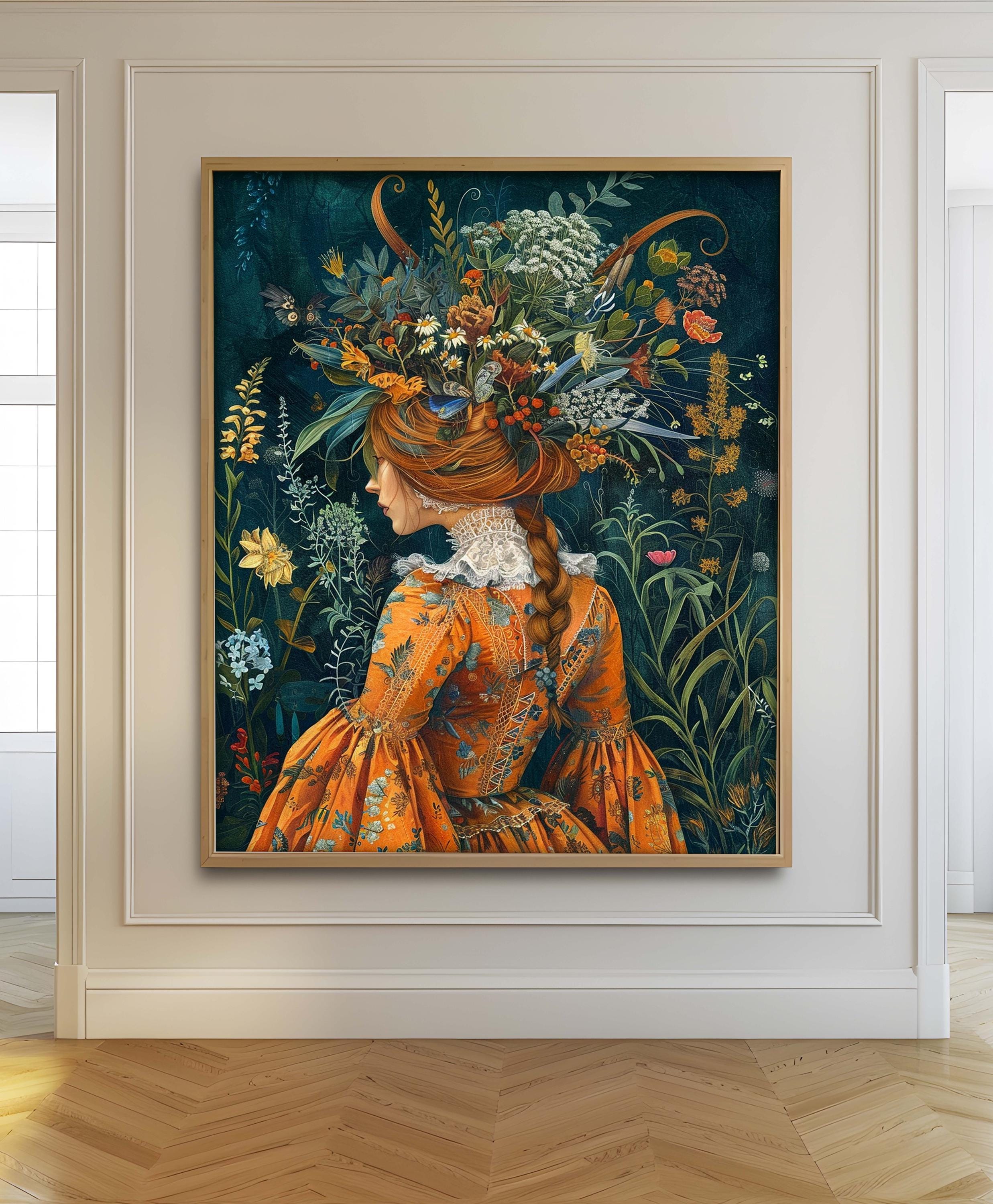She wears a hat made of wildflowers, including daisies, berries, and foliage, arranged with intricate detail. Her dress, a vibrant orange with floral embroidery, is painted in rich jewel tones and designed in a Renaissance style, complete with puffed sleeves and a lace collar.