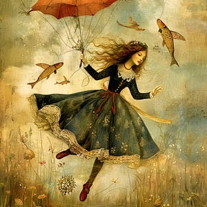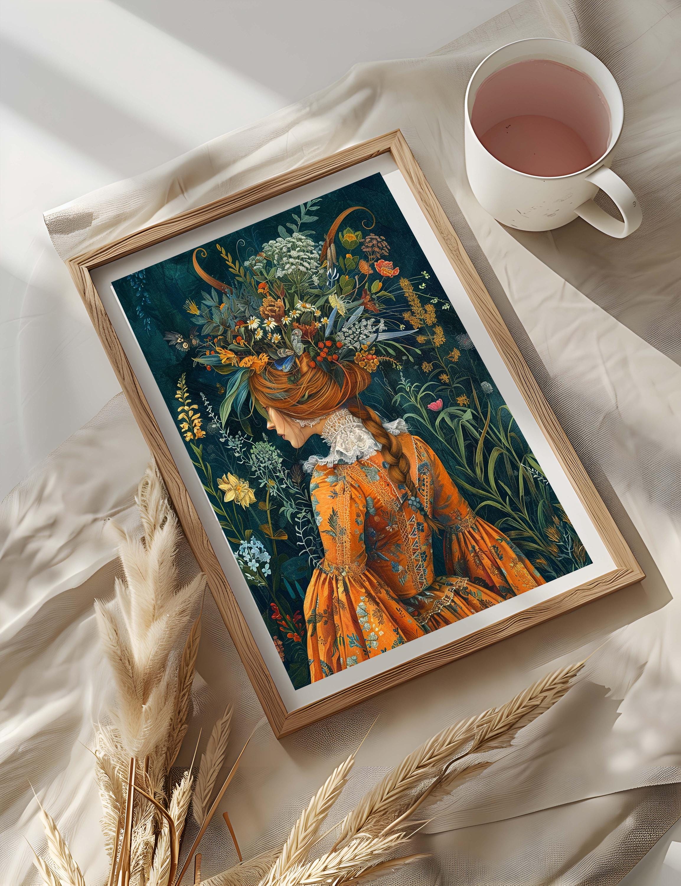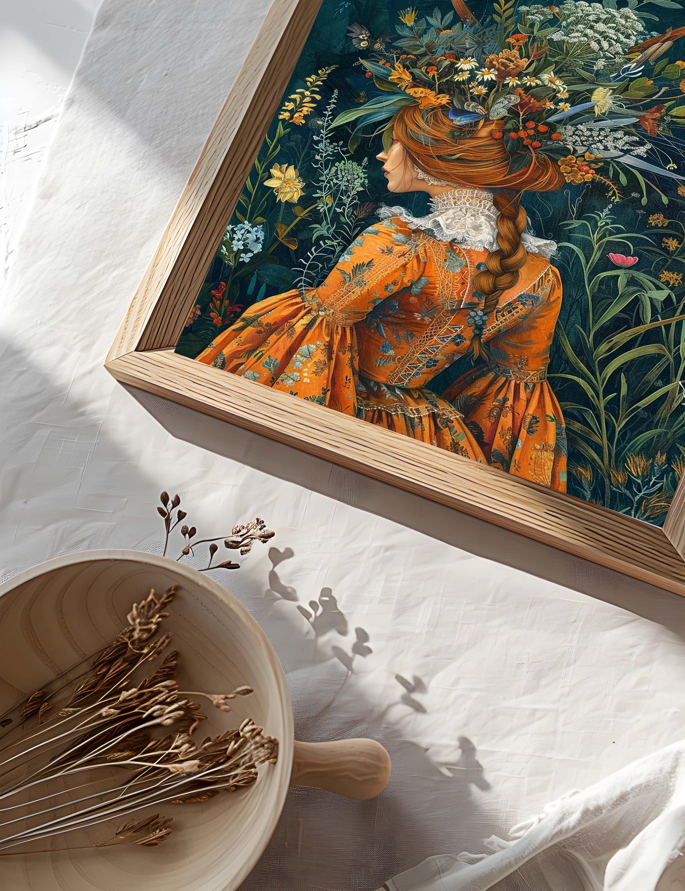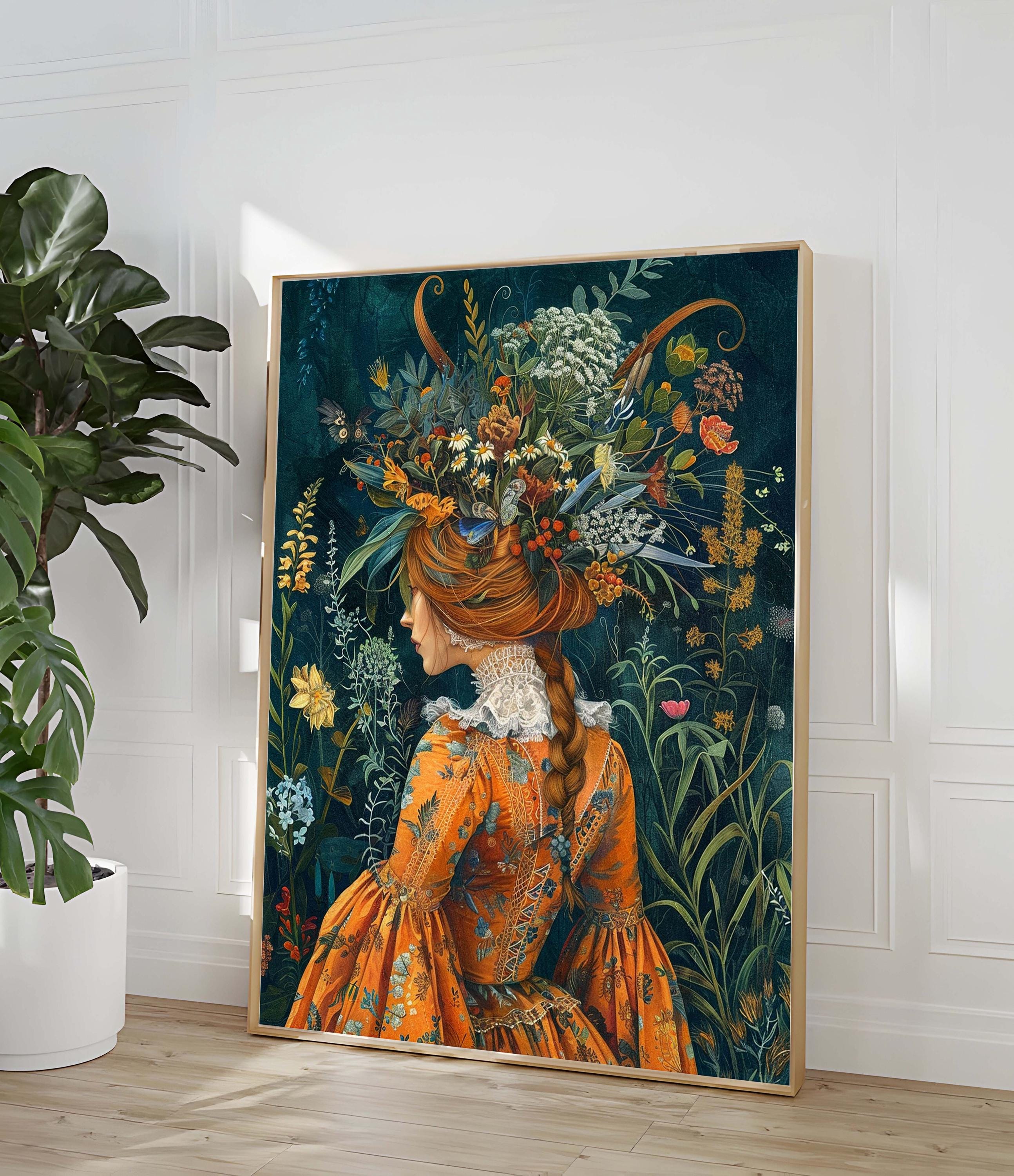 She wears a hat made of wildflowers, including daisies, berries, and foliage, arranged with intricate detail. Her dress, a vibrant orange with floral embroidery, is painted in rich jewel tones and designed in a Renaissance style, complete with puffed sleeves and a lace collar.