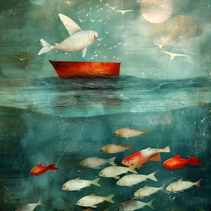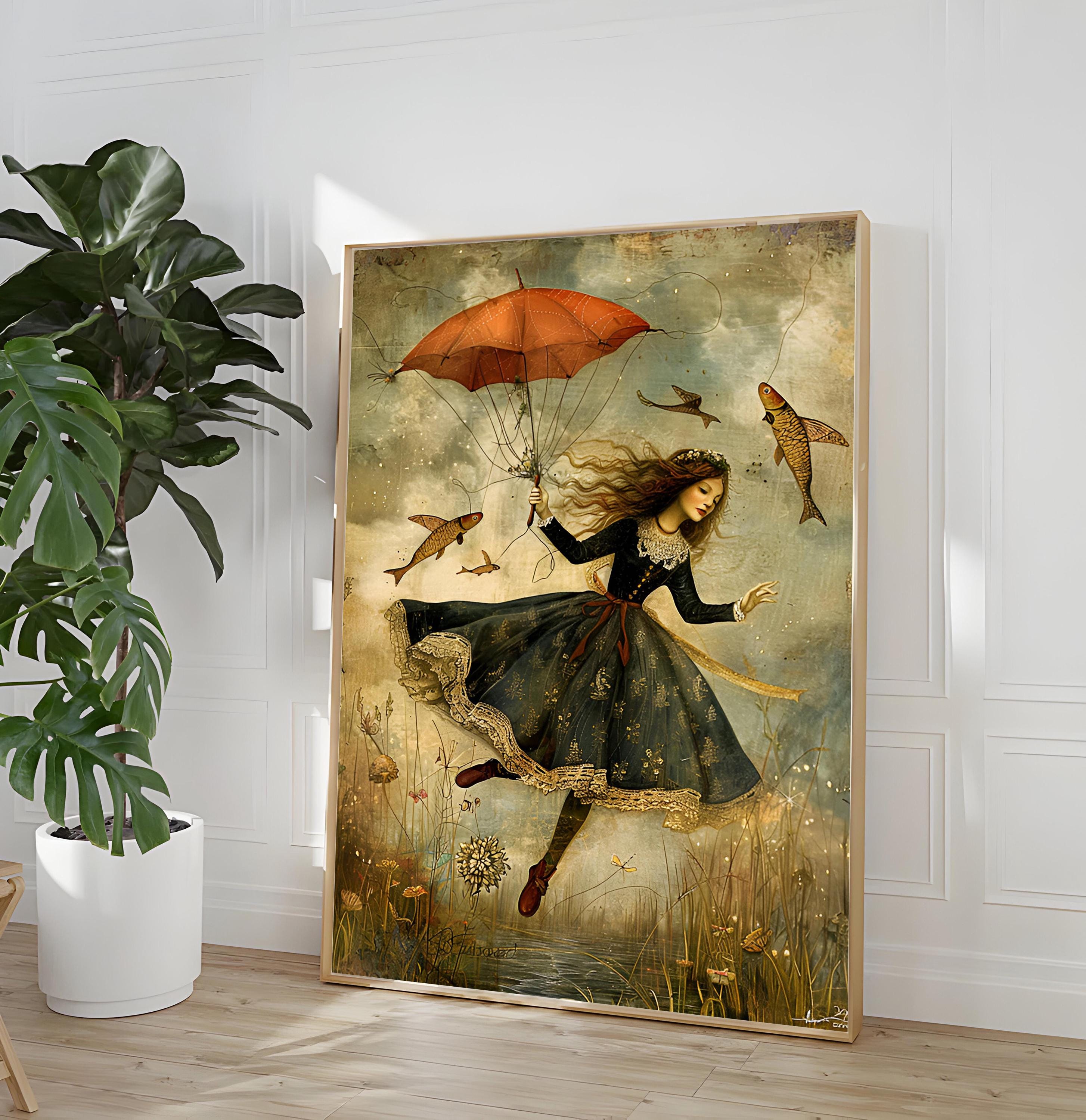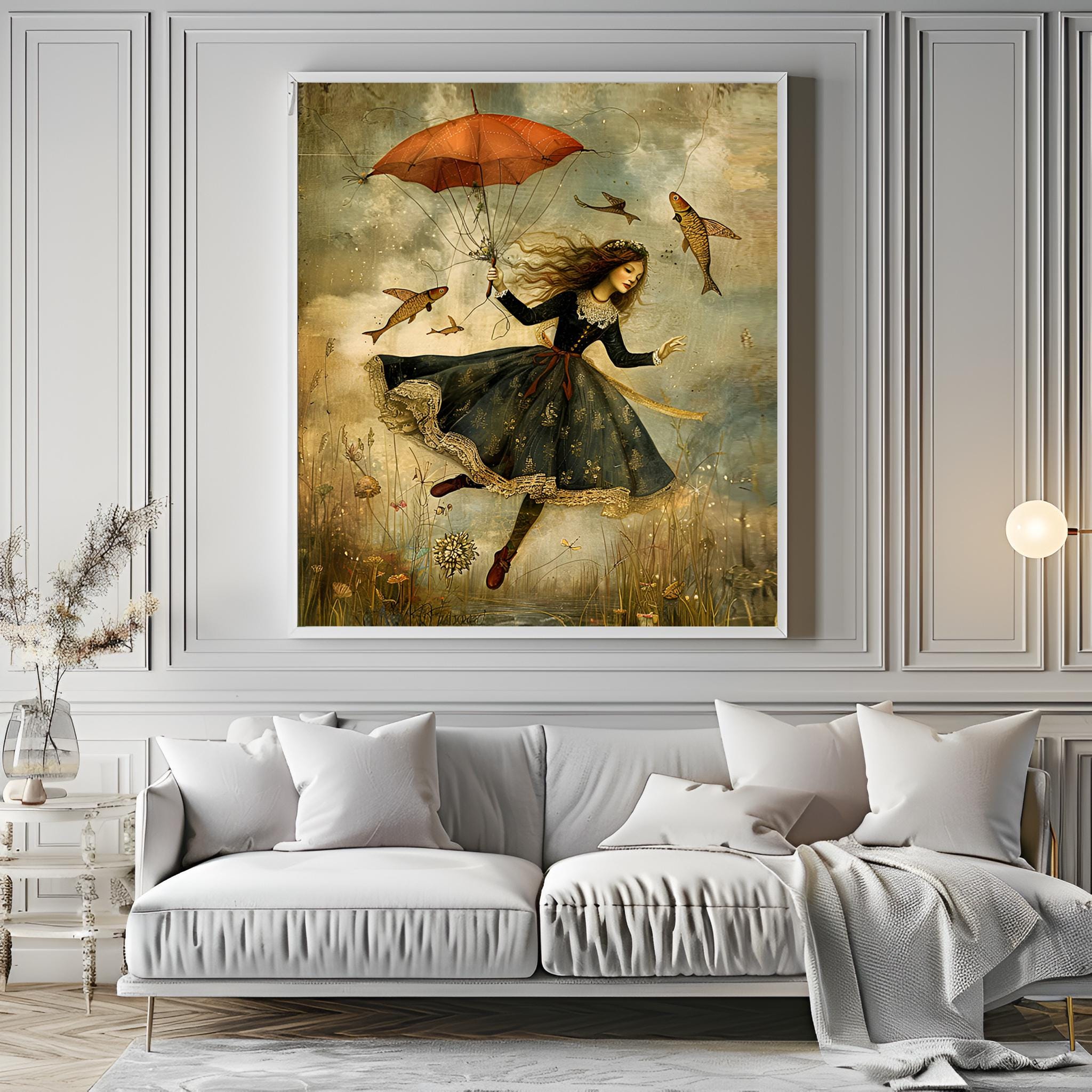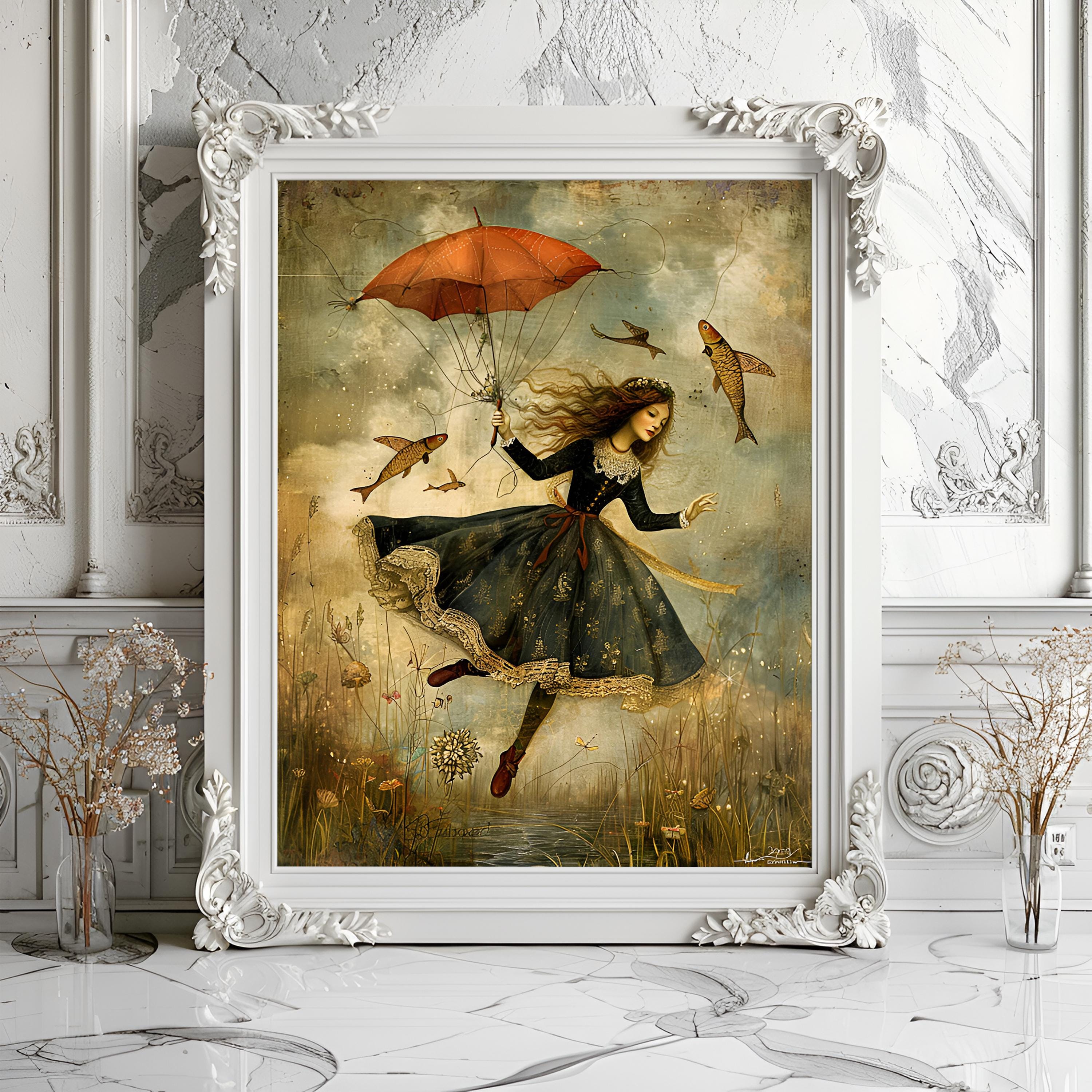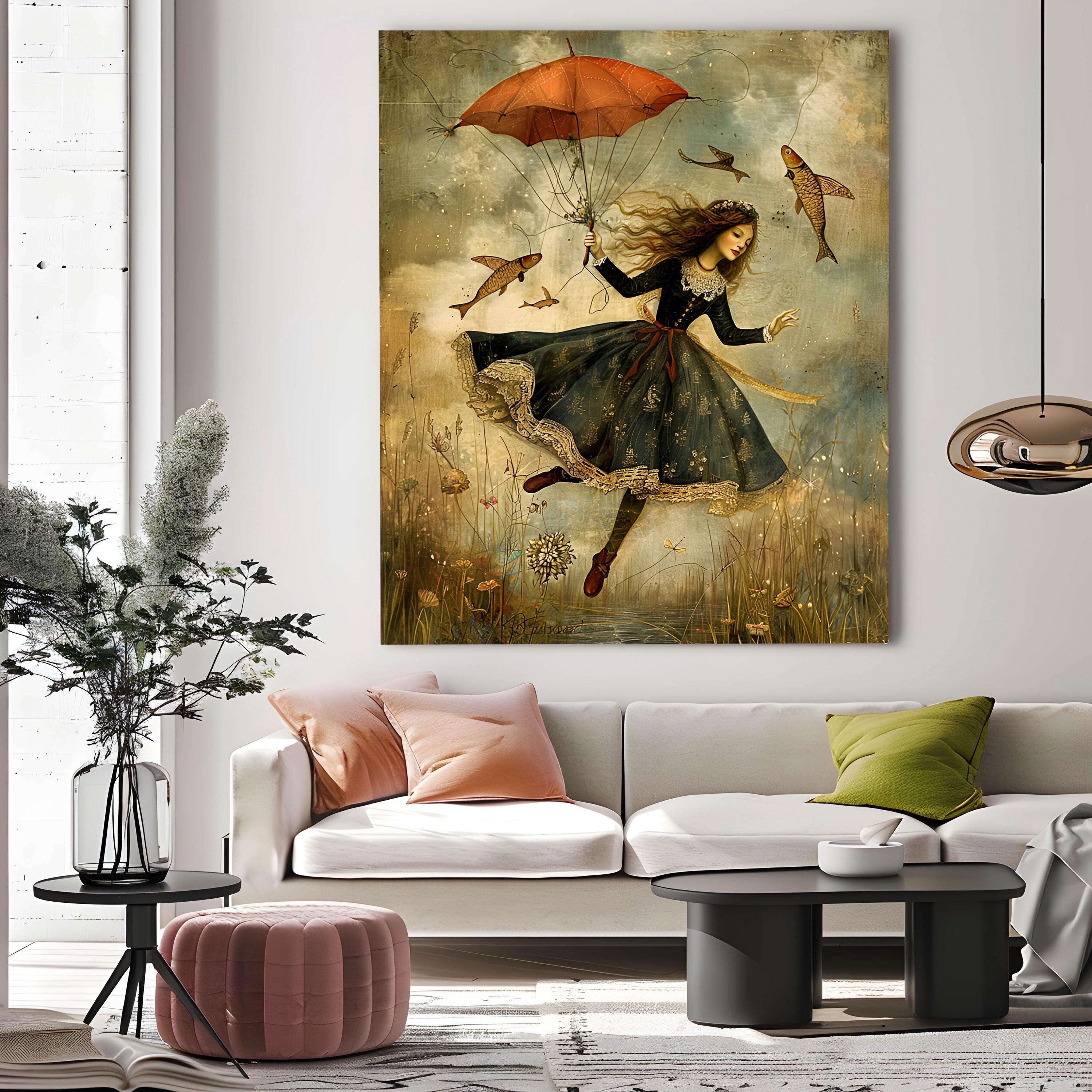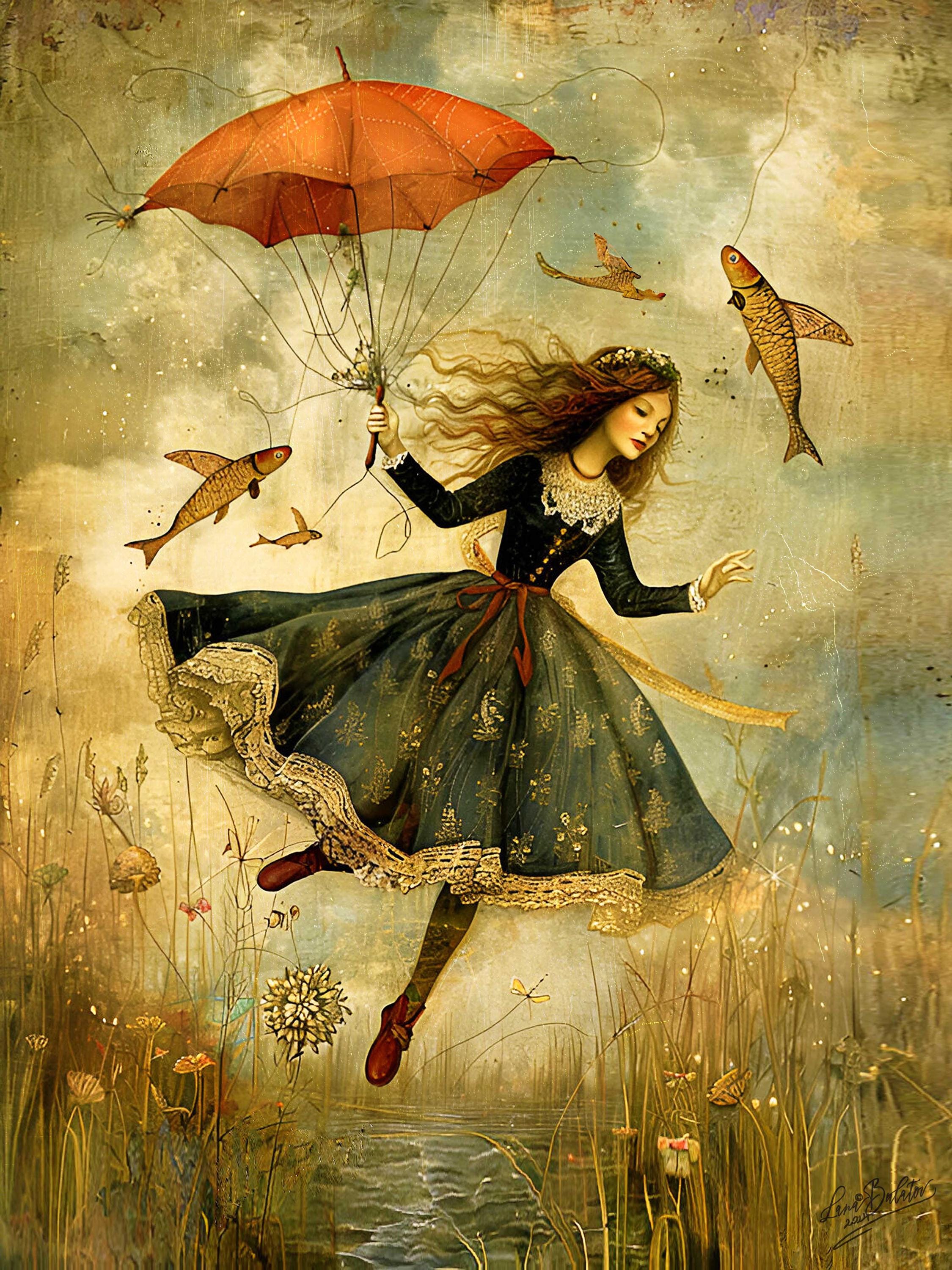 𝘛𝘩𝘪𝘴 𝘱𝘪𝘦𝘤𝘦 𝘧𝘦𝘢𝘵𝘶𝘳𝘦𝘴 𝘢 𝘺𝘰𝘶𝘯𝘨 𝘭𝘢𝘥𝘺 𝘧𝘭𝘺𝘪𝘯𝘨 𝘰𝘷𝘦𝘳 𝘨𝘰𝘭𝘥𝘦𝘯 𝘢𝘶𝘵𝘶𝘮𝘯 𝘧𝘪𝘦𝘭𝘥𝘴 𝘶𝘯𝘥𝘦𝘳 𝘢 𝘳𝘦𝘥 𝘶𝘮𝘣𝘳𝘦𝘭𝘭𝘢. 𝘉𝘦𝘭𝘰𝘸, 𝘵𝘩𝘦 𝘰𝘭𝘪𝘷𝘦-𝘨𝘳𝘦𝘦𝘯 𝘭𝘢𝘯𝘥𝘴𝘤𝘢𝘱𝘦 𝘴𝘩𝘪𝘮𝘮𝘦𝘳𝘴 𝘸𝘪𝘵𝘩 𝘳𝘪𝘤𝘩 𝘫𝘦𝘸𝘦𝘭 𝘵𝘰𝘯𝘦𝘴, 𝘦𝘷𝘰𝘬𝘪𝘯𝘨 𝘢 𝘥𝘳𝘦𝘢𝘮𝘭𝘪𝘬𝘦 𝘴𝘦𝘯𝘴𝘦 𝘰𝘧 𝘸𝘰𝘯𝘥𝘦𝘳. 𝘞𝘩𝘪𝘮𝘴𝘪𝘤𝘢𝘭 𝘧𝘪𝘴𝘩 𝘨𝘭𝘪𝘥𝘦 𝘵𝘩𝘳𝘰𝘶𝘨𝘩 𝘵𝘩𝘦 𝘢𝘪𝘳 𝘣𝘦𝘴𝘪𝘥𝘦 𝘩𝘦𝘳, 𝘢𝘥𝘥𝘪𝘯𝘨 𝘢 𝘮𝘢𝘨𝘪𝘤𝘢𝘭 𝘦𝘭𝘦𝘮𝘦𝘯𝘵 𝘵𝘰 𝘵𝘩𝘦 𝘴𝘤𝘦𝘯𝘦.