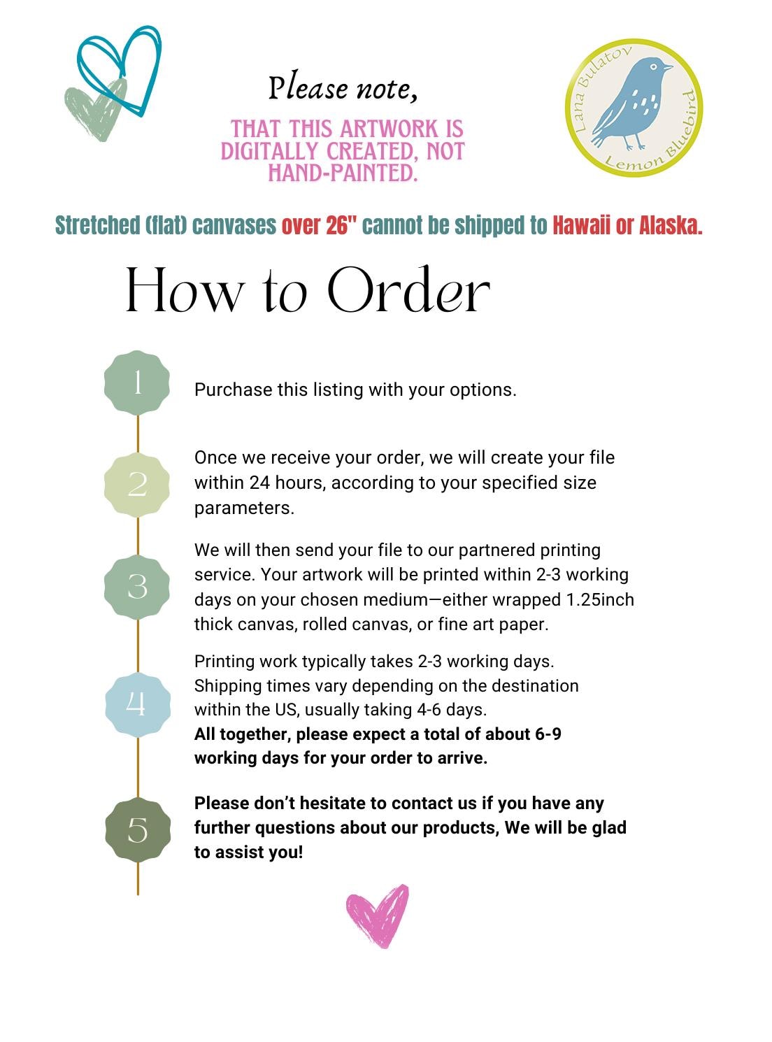 𝟑. Once we receive your order, we will create your file within 24 hours, according to your specified size parameters. We will then send your file to our partnered printing service. Your artwork will be printed within 2-3 working days on your chosen medium—either on a gallery-wrapped canvas with a solid 1.25-inch thick frame, ready to hang, rolled canvas, or on Fine Art Paper.