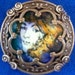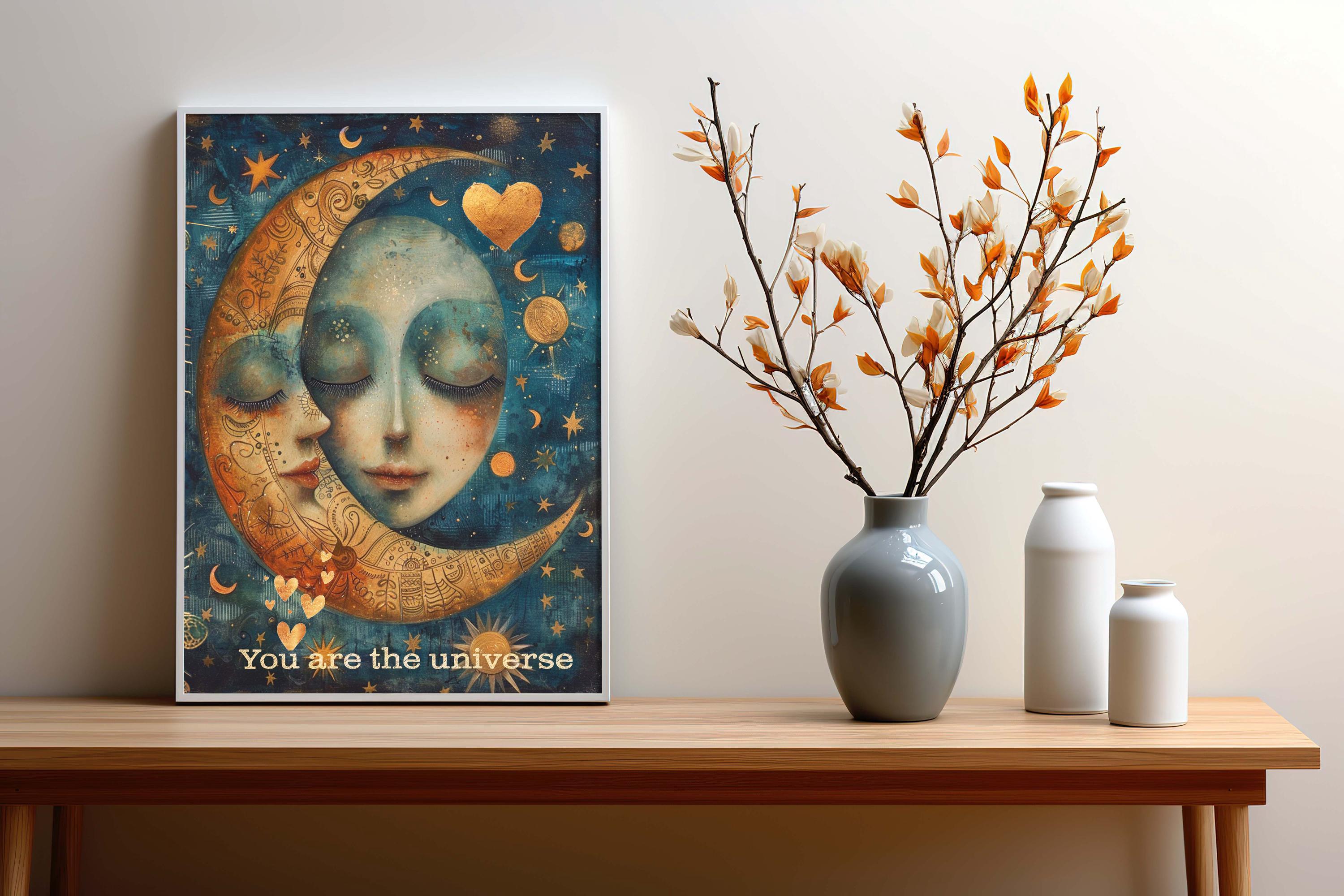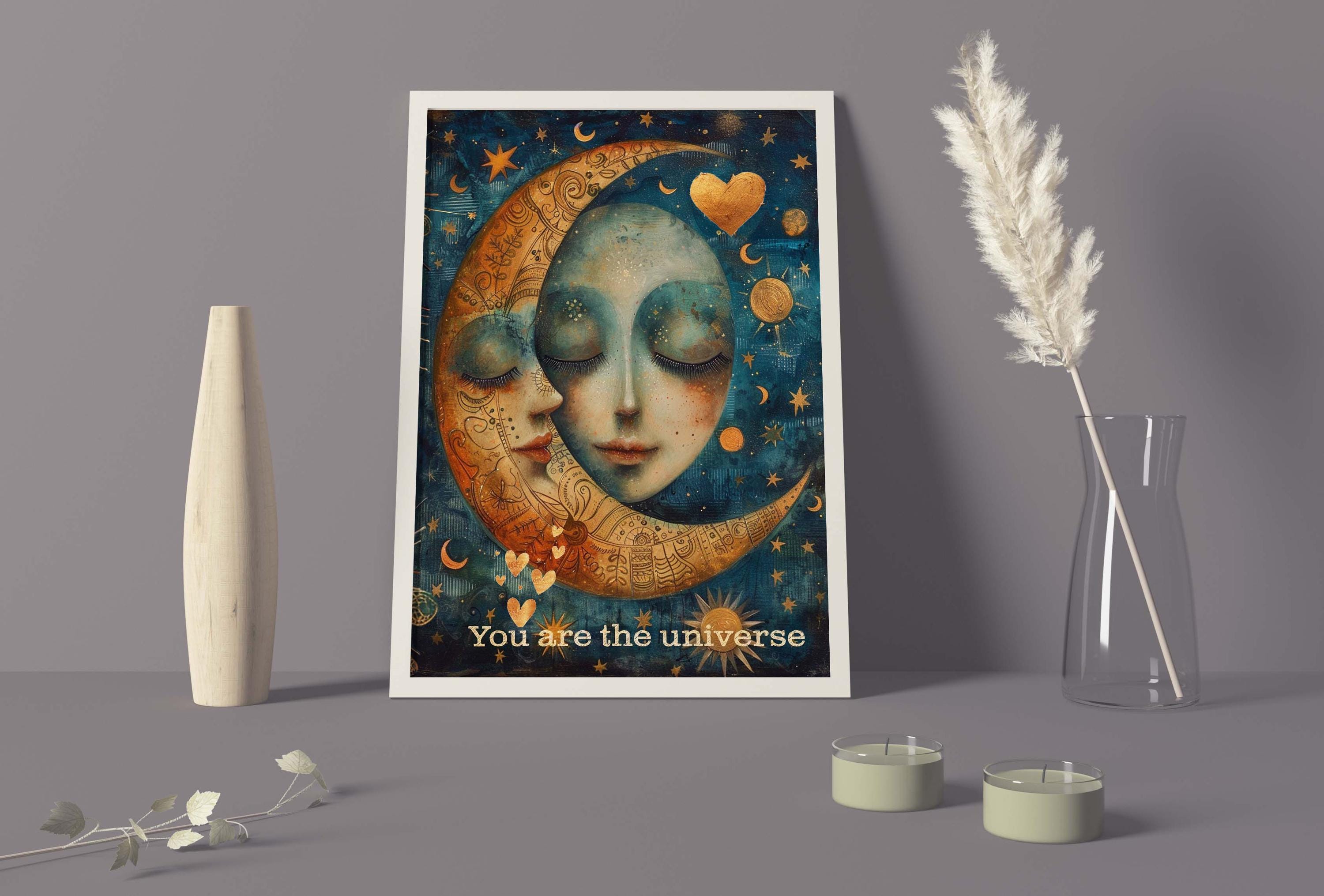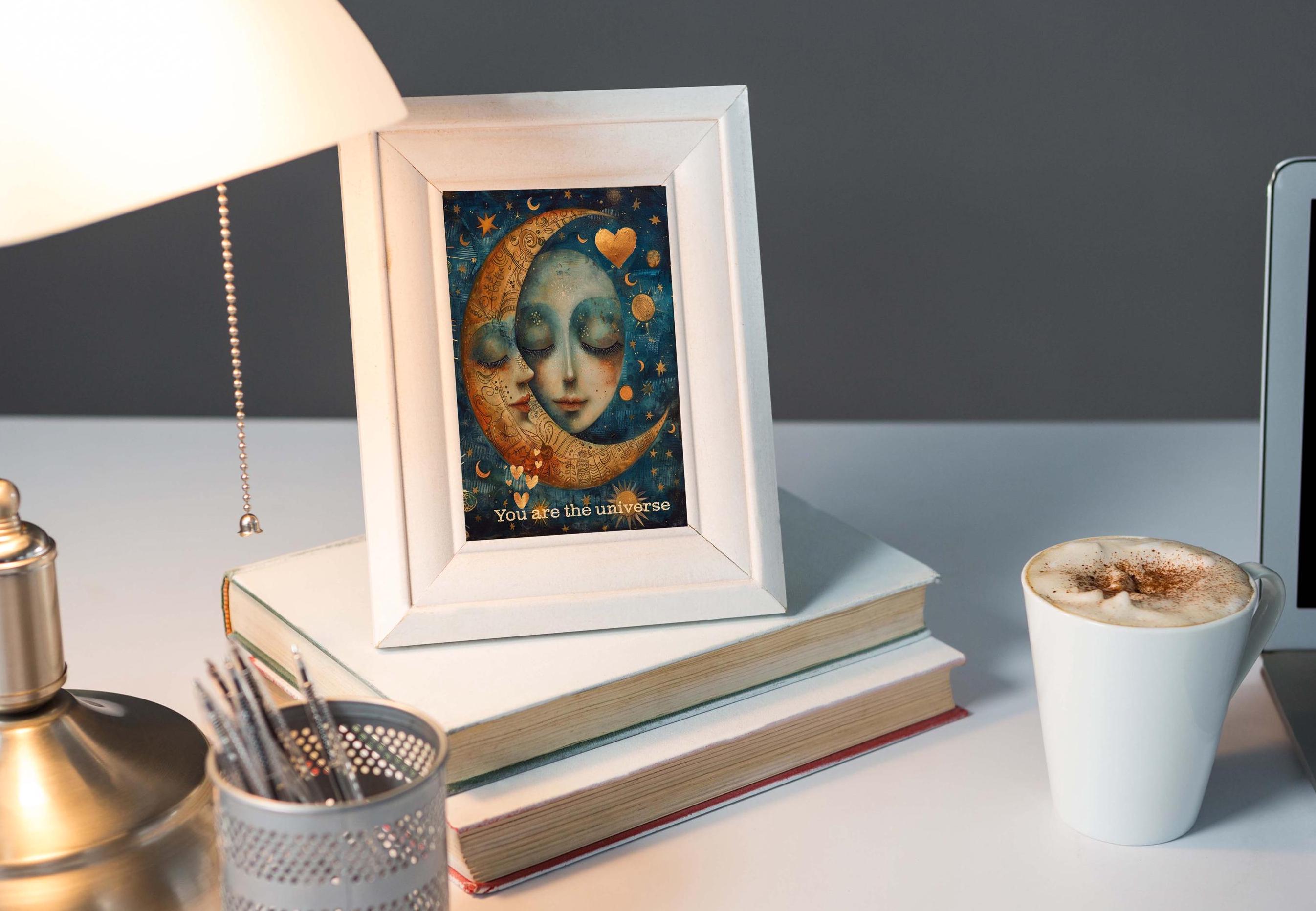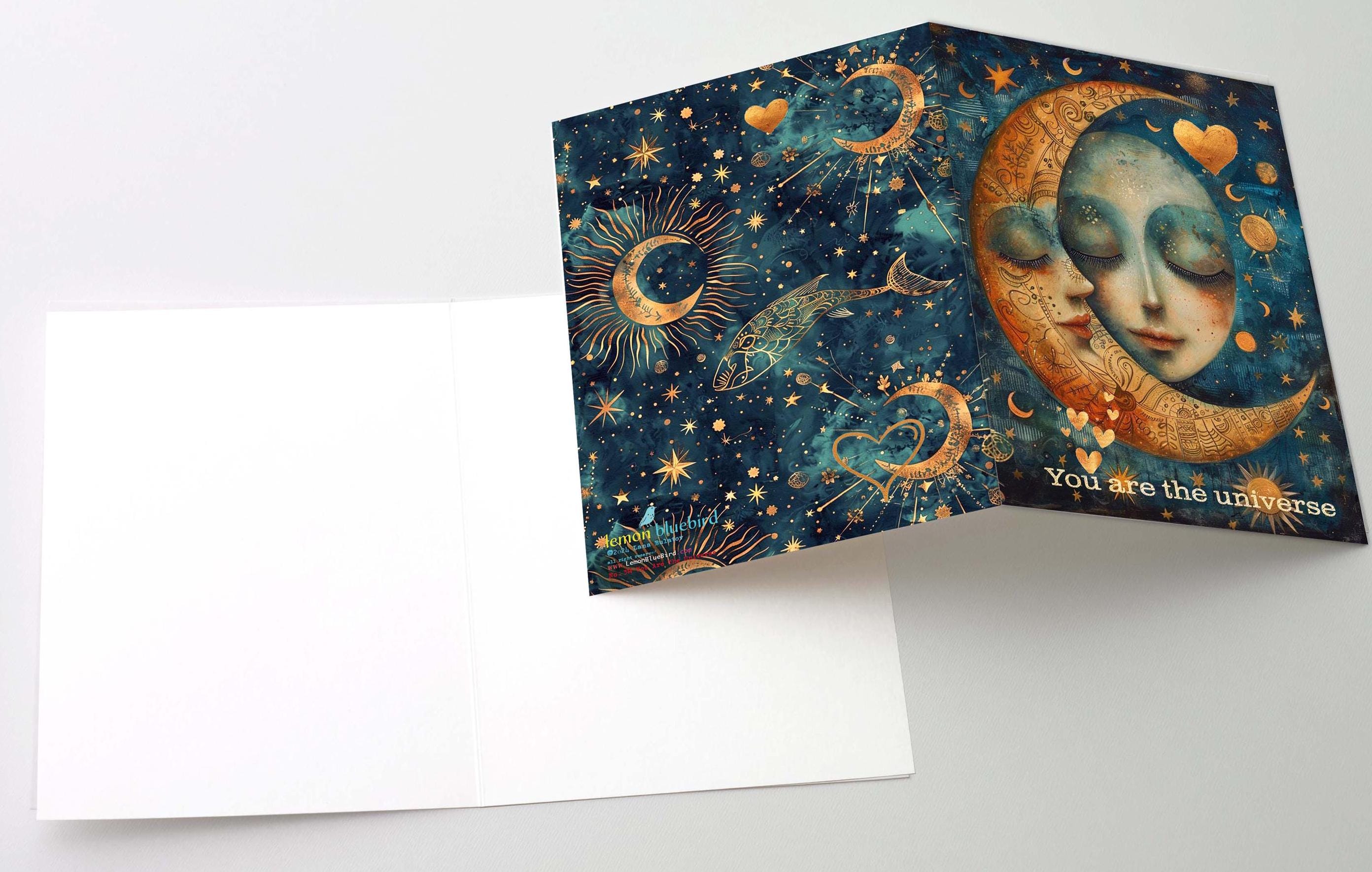 This enchanting greeting card features a celestial theme with a surreal illustration of a lady’s face beautifully merged into a half moon. Surrounding her are intricate details of a moons, stars, suns, and zodiac symbols, creating a mesmerizing universe-inspired design. The dark shades of deep blue and emerald green form a rich and mysterious backdrop, highlighting the golden and silvery accents of the celestial elements.
