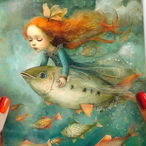 On the back, the story continues under a glowing full moon, where the girl is shown at night in a dreamy blue green ocean scene. Holding onto strings tied to a flock of birds, she is gently lifted into the night sky, symbolizing hope, courage, and the power of imagination.