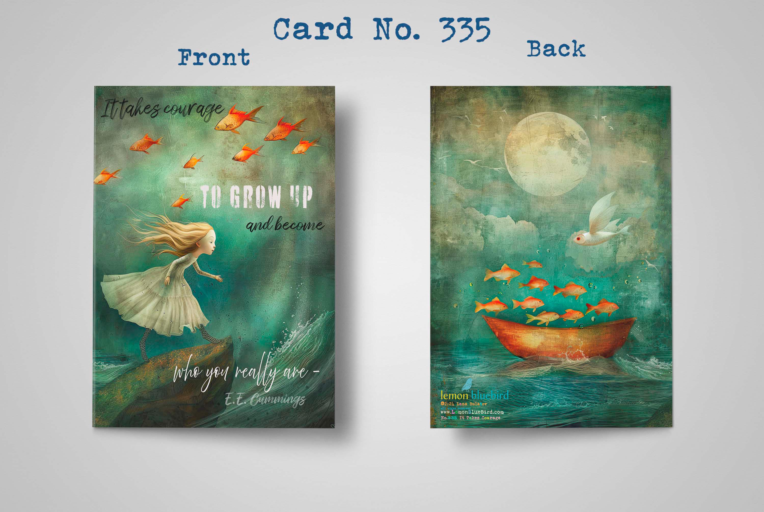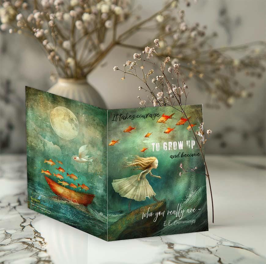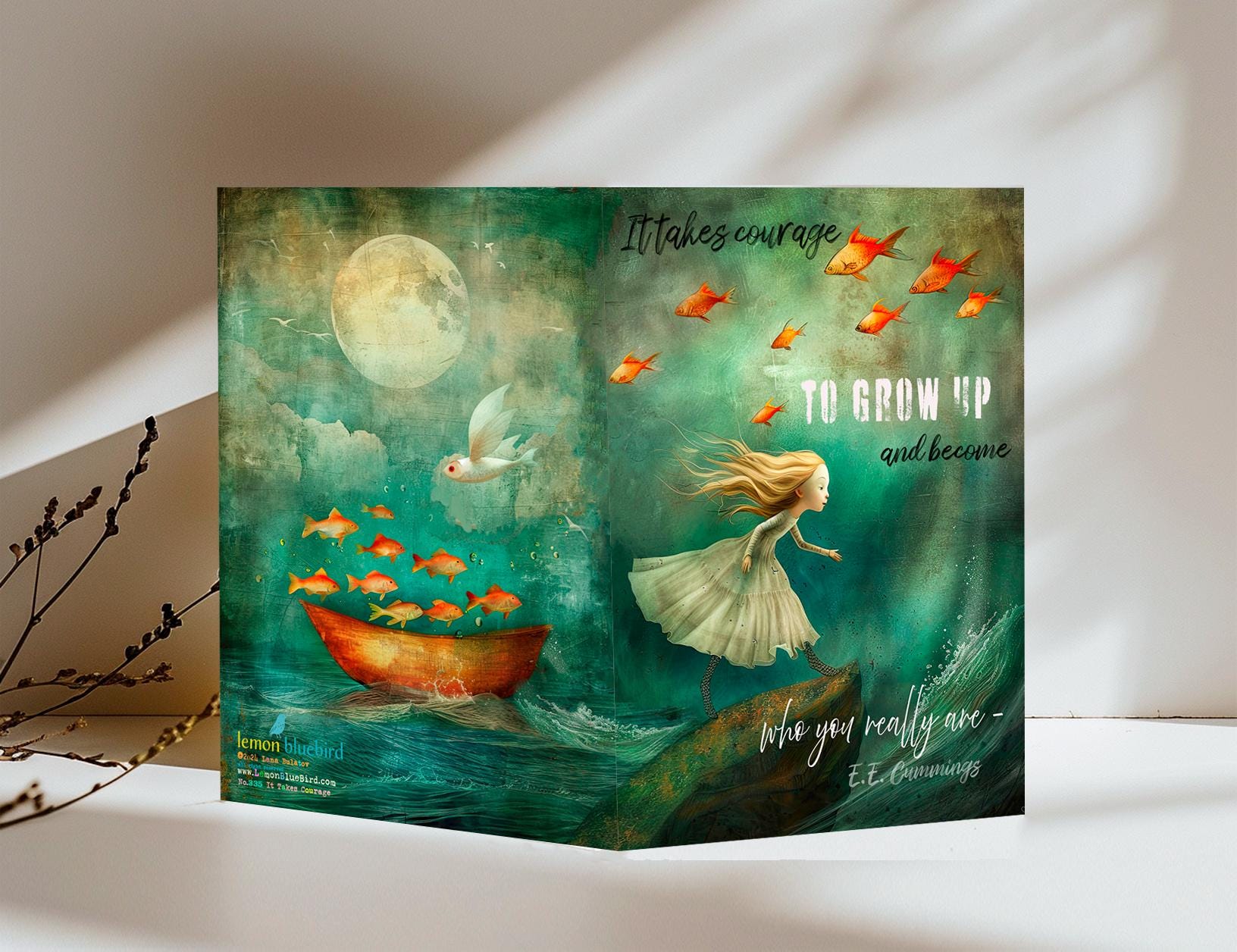 The card captures a whimsical moment in soft greens, teals, and golden yellows. A young girl in a flowing white dress runs with purpose, as she reaches the edge of a rock above the ocean waves. She is on the brink of leaping, her posture radiating courage and freedom. The waves below shimmer with blue-teal and golden highlights, while above her, a flock of red fish flies through the sky, adding a magical, dreamlike quality. The handwritten message, "It takes courage to grow up and become who you really are,"complementing the sense of adventure and self-discovery in the scene.