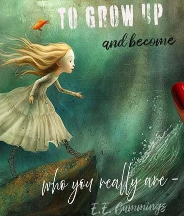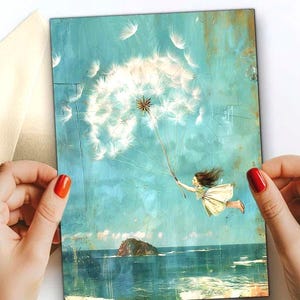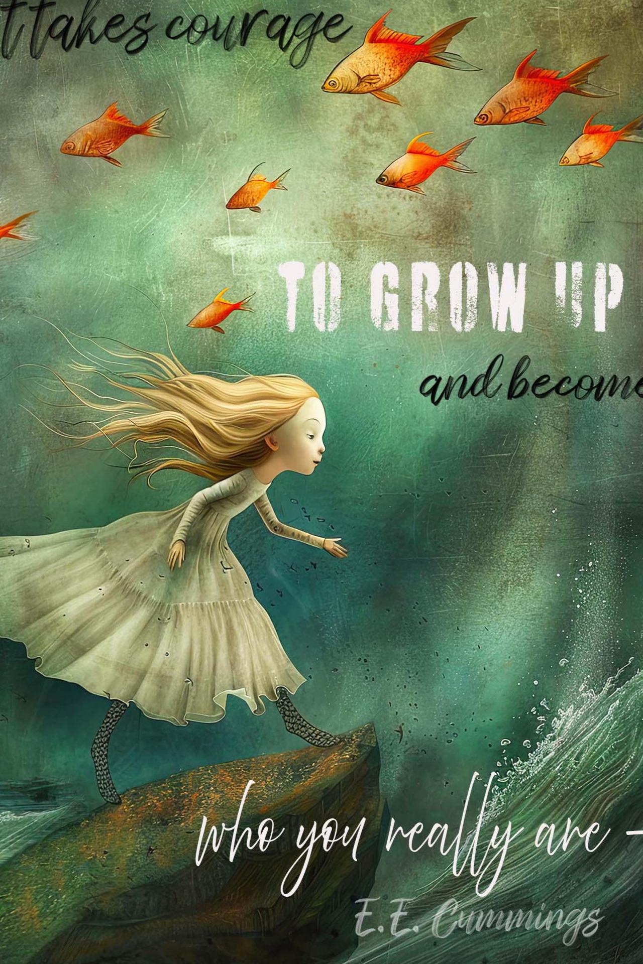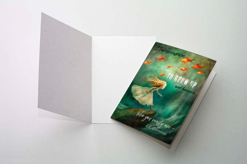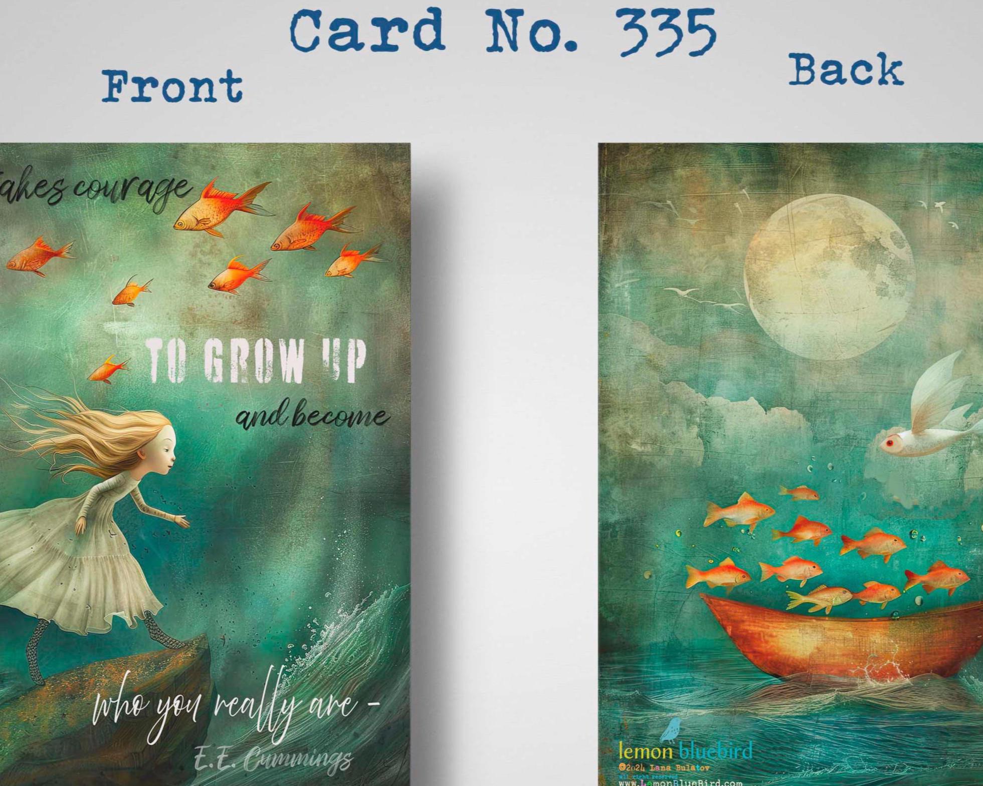 The card captures a whimsical moment in soft greens, teals, and golden yellows. A young girl in a flowing white dress runs with purpose, as she reaches the edge of a rock above the ocean waves. She is on the brink of leaping, her posture radiating courage and freedom. The waves below shimmer with blue-teal and golden highlights, while above her, a flock of red fish flies through the sky, adding a magical, dreamlike quality. The handwritten message, "It takes courage to grow up and become who you really are,"complementing the sense of adventure and self-discovery in the scene.