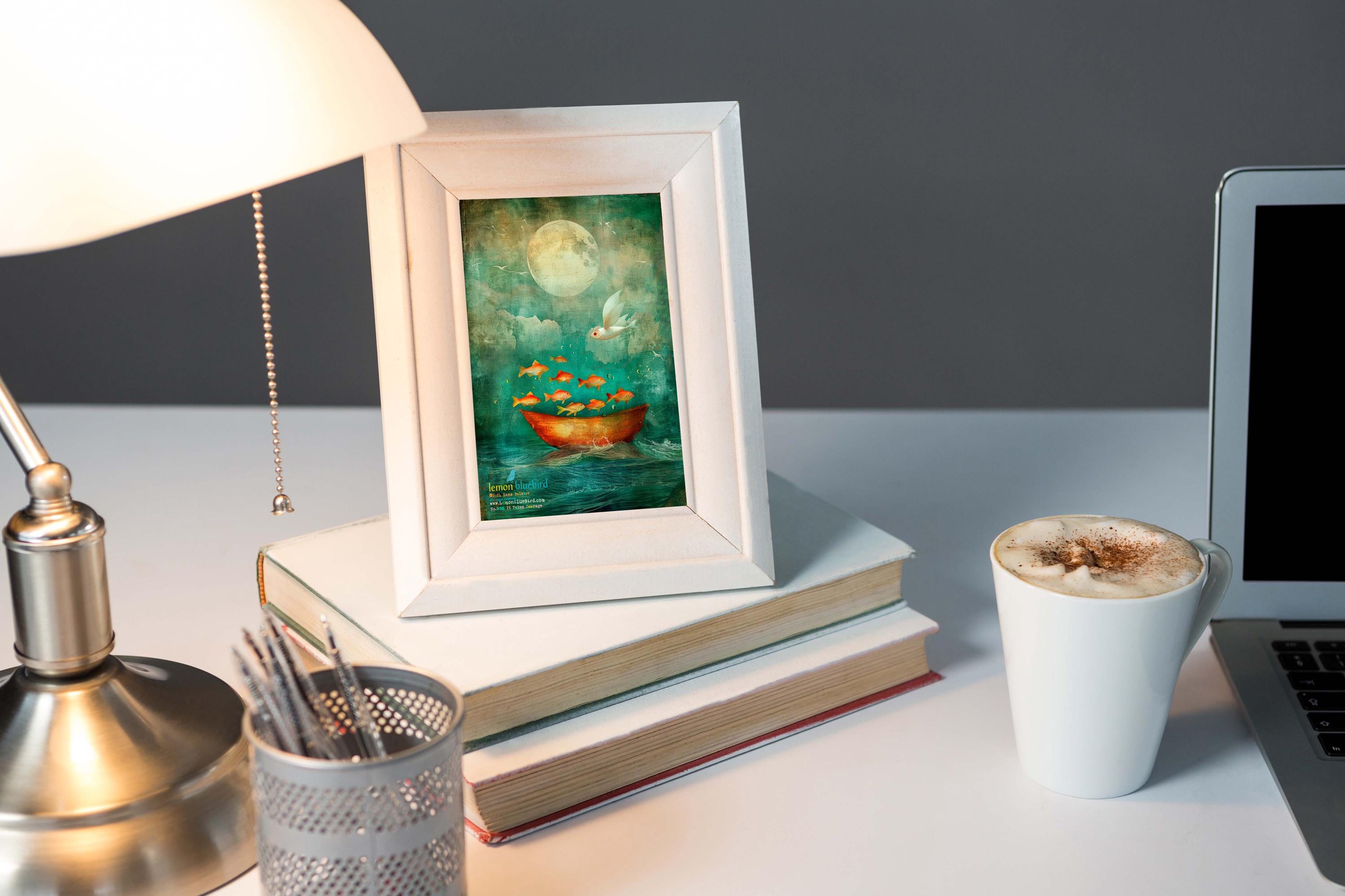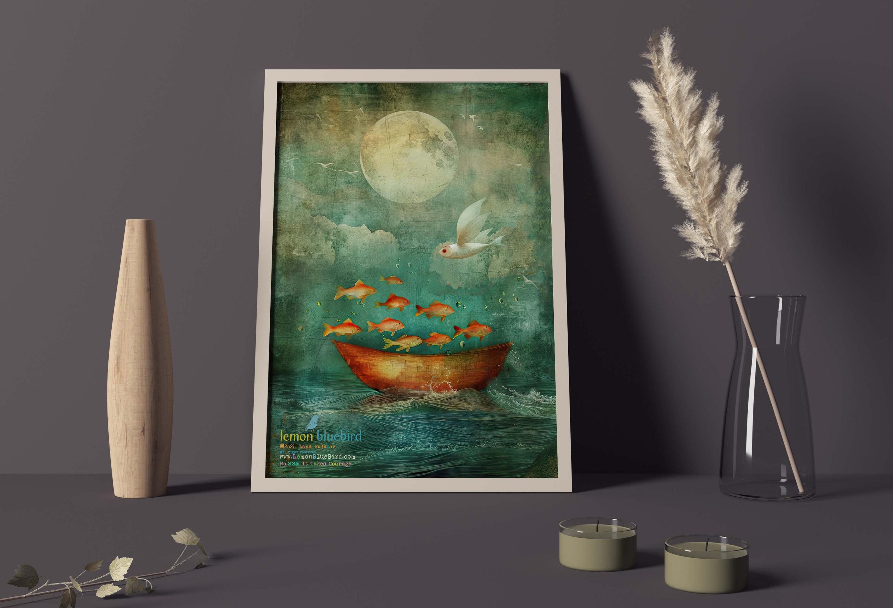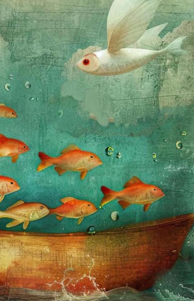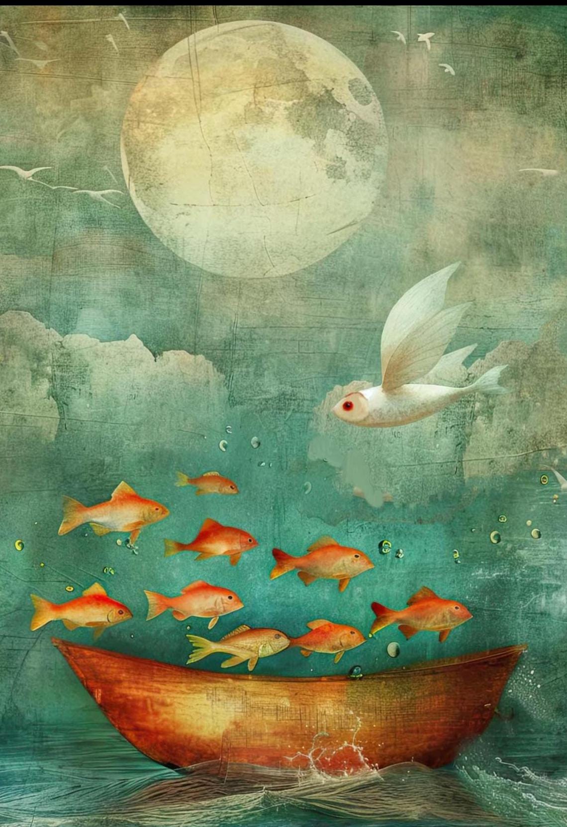 On the back a red boat floats, above it, the flock of red fish continues its path across the sky, but one white fish flies against the flow, mirroring the bravery of the girl on the front. Both the girl and the white fish embody the courage to break free, to leap into the unknown, and to chart their own course.