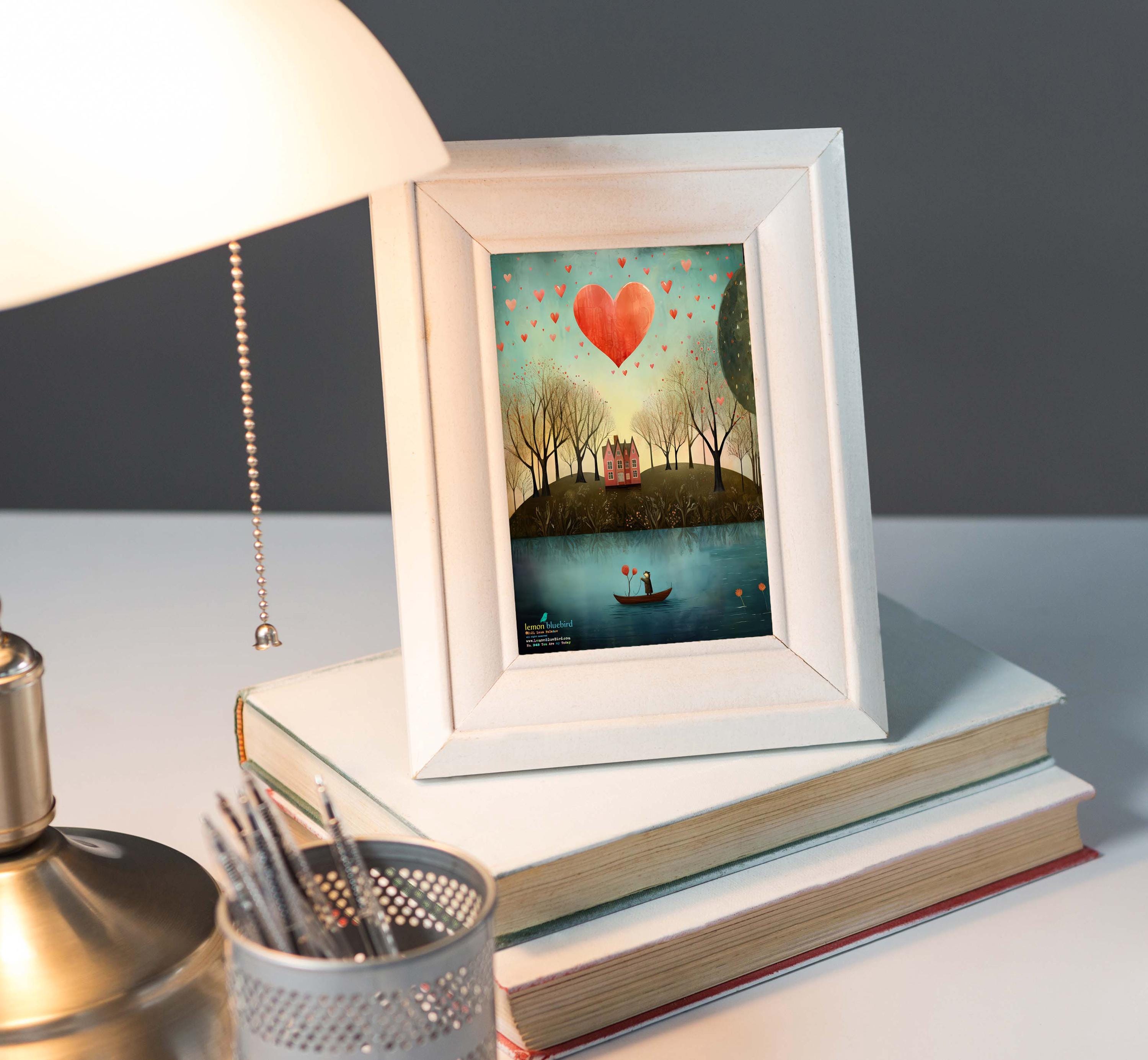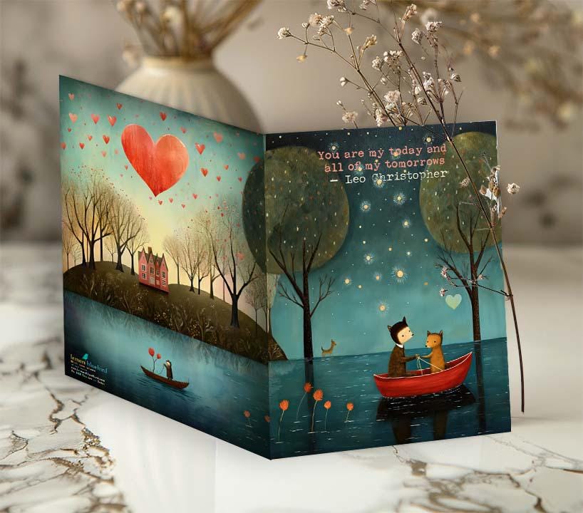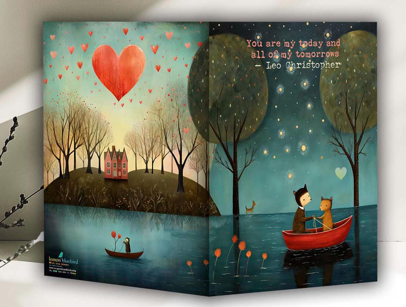 Celebrate your love with this enchanting Valentineโs Day card featuring a pair of whimsical animals holding hands as they sail together in a bright red boat on a tranquil lake. The sweet couple is surrounded by cheerful colors of blue, green, and orange-red. The back page of this folded card shows their cozy pink house rests peacefully on the lakeโs shore, adorned with one large red heart floating above and smaller hearts surrounding it, creating a heartwarming scene.