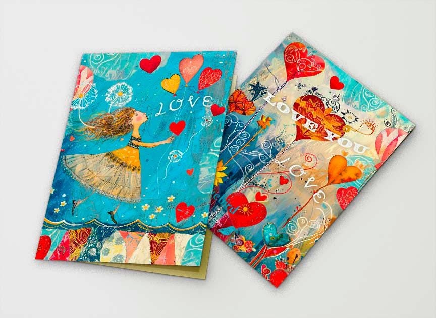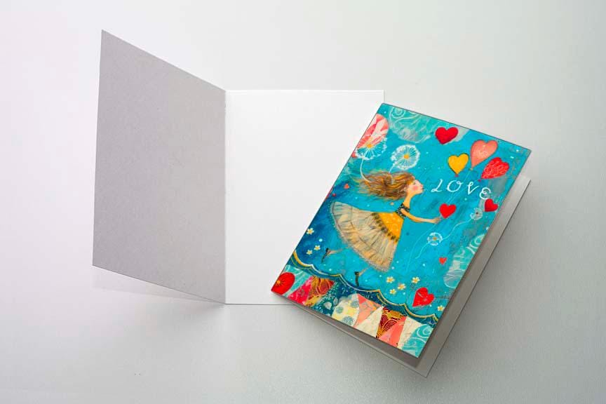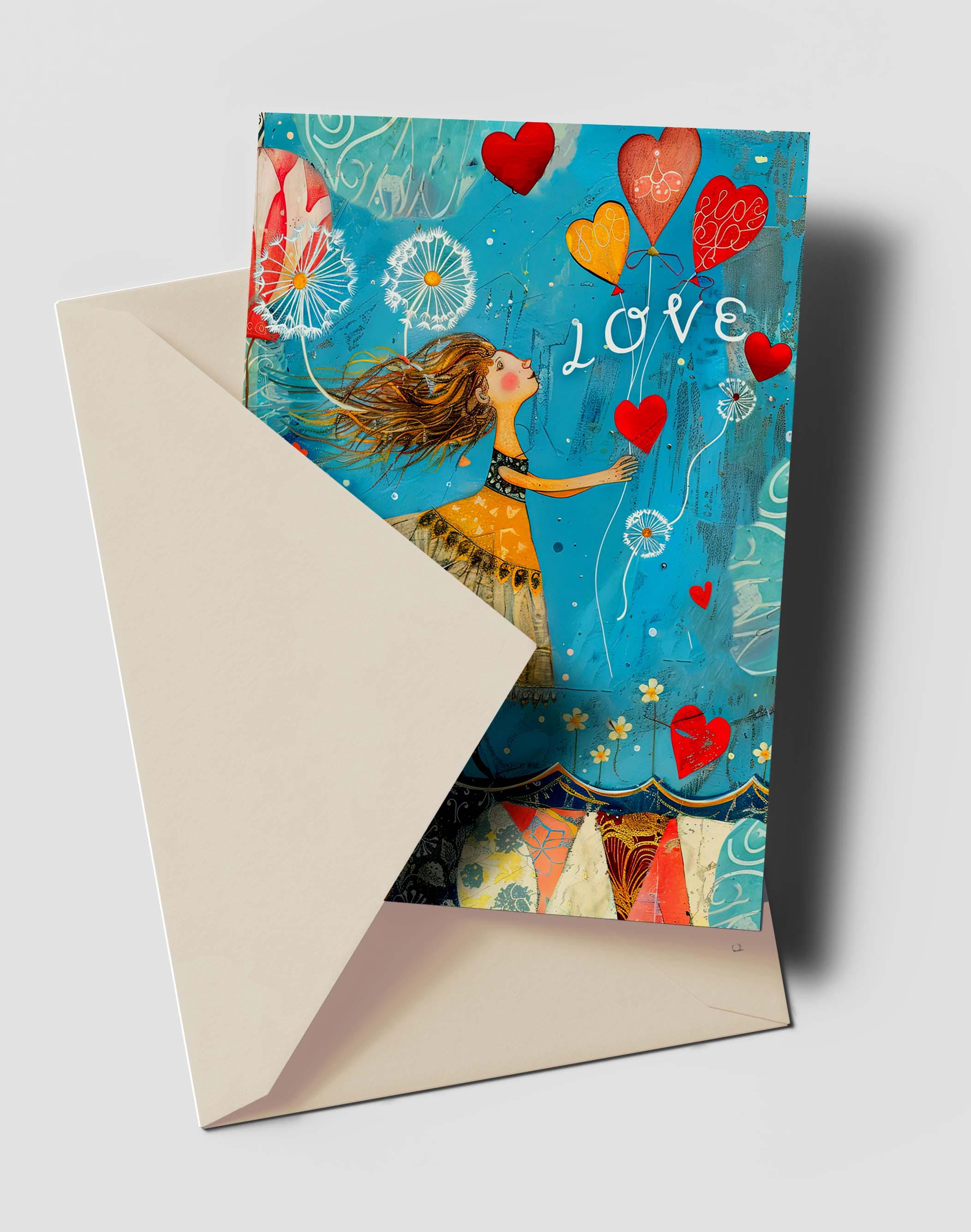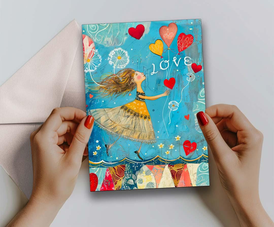 This enchanting greeting card captures the magic of love and care. On the front, a joyful girl floats through the sky, her arms outstretched as she is carried by the bunch of hearts. She wears a simple, flowing dress in soft yellows.