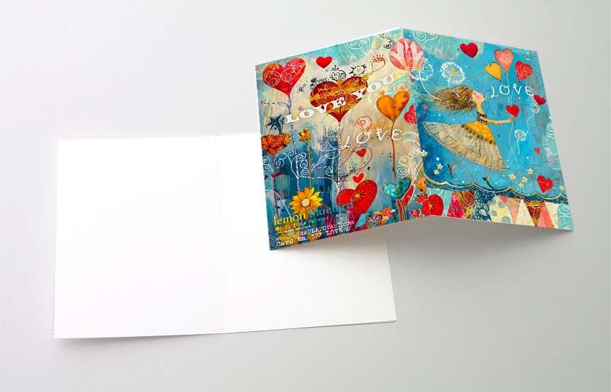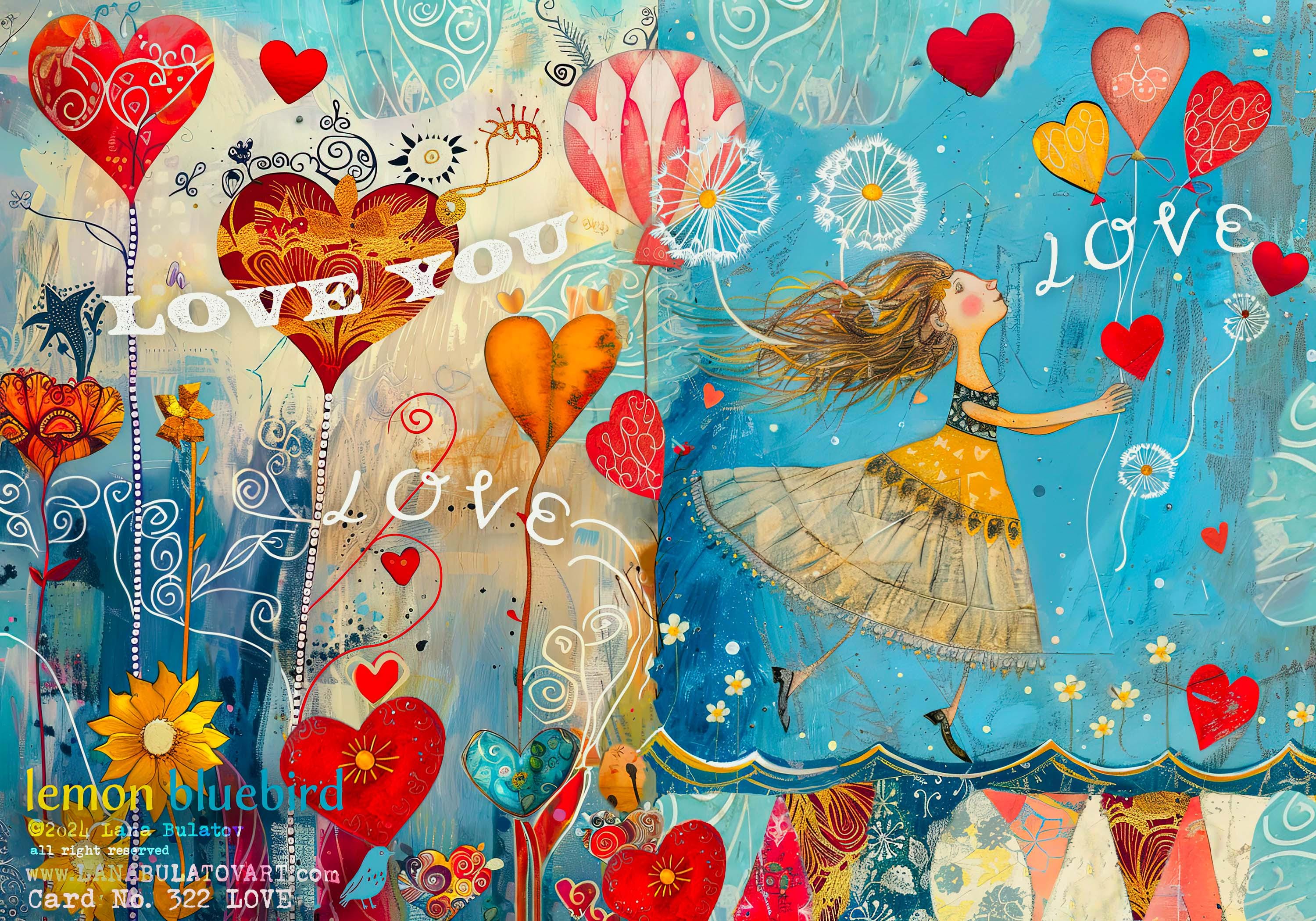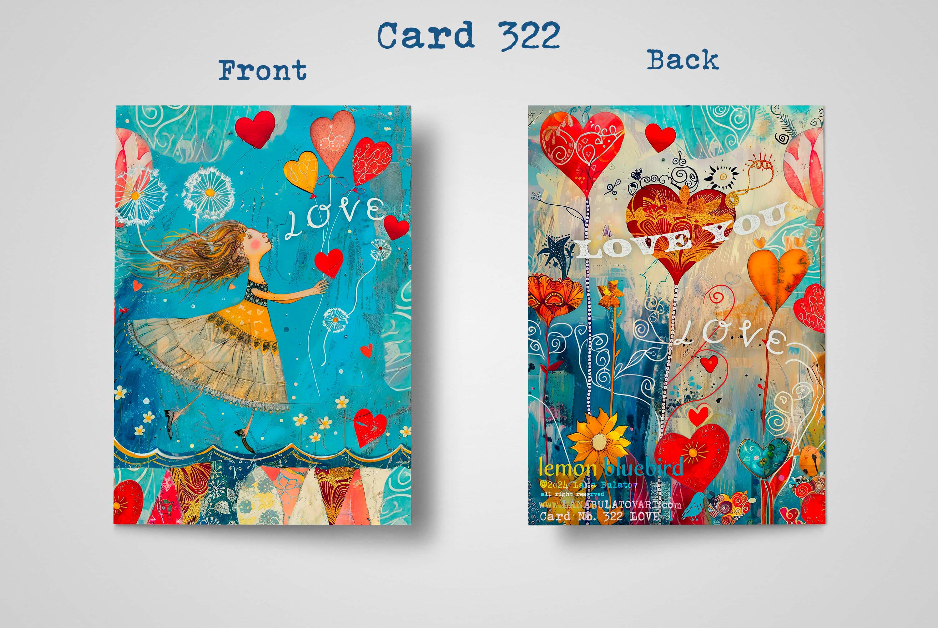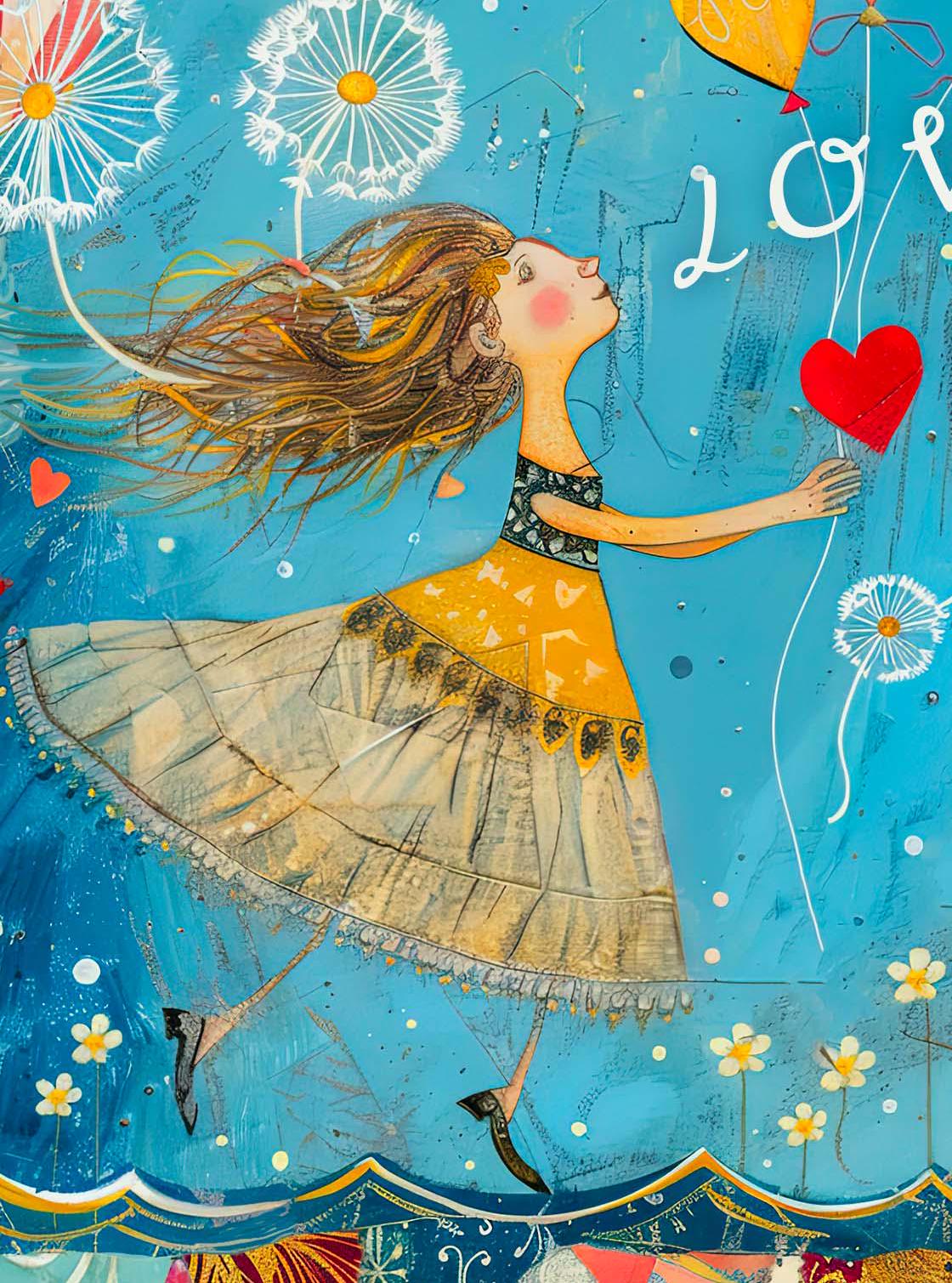 This enchanting greeting card captures the magic of love and care. On the front, a joyful girl floats through the sky, her arms outstretched as she is carried by the bunch of hearts. She wears a simple, flowing dress in soft yellows.