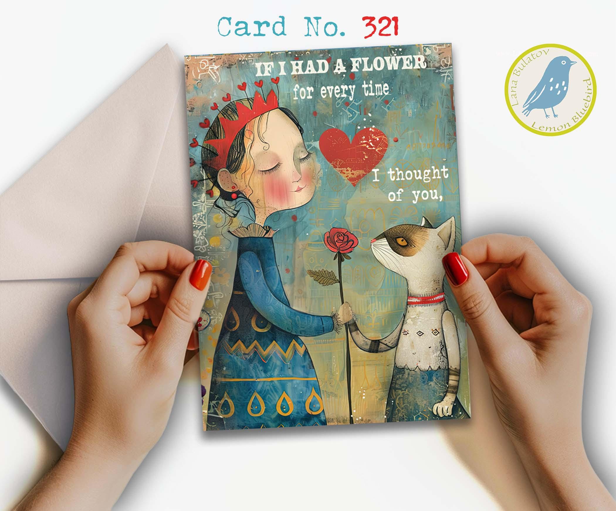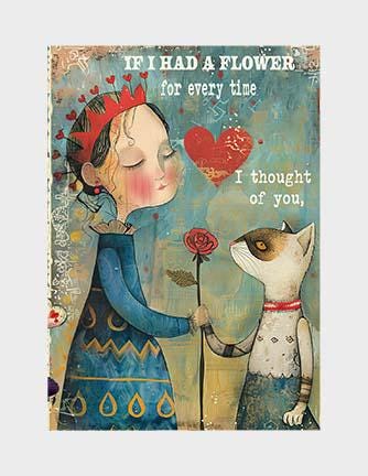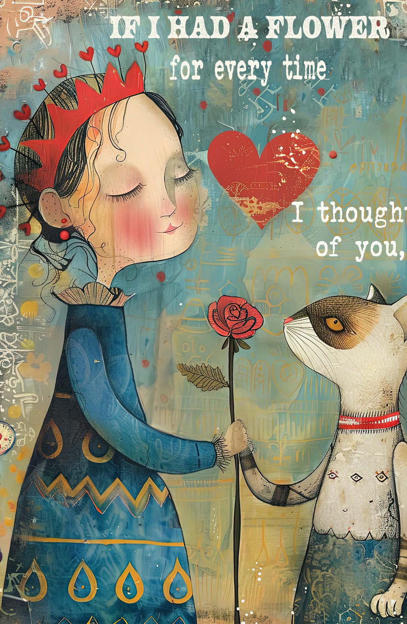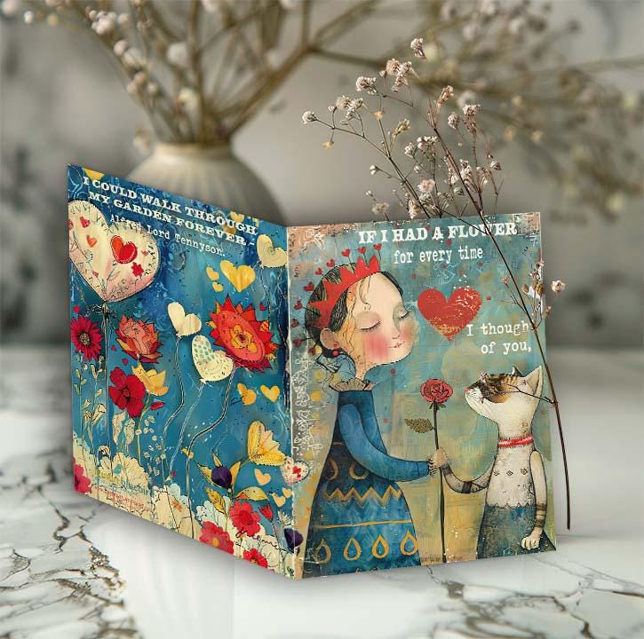 This endearing image of the girl and cat sharing a rose, paired with the timeless, tender quote, makes the card a perfect expression of friendship, love, and the beauty of simple moments spent together.