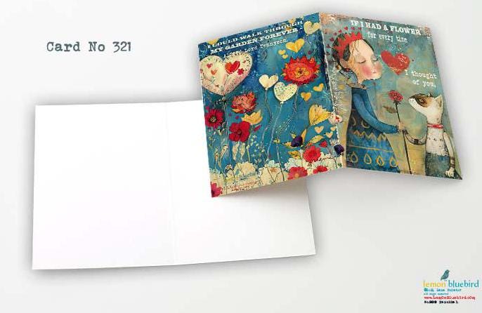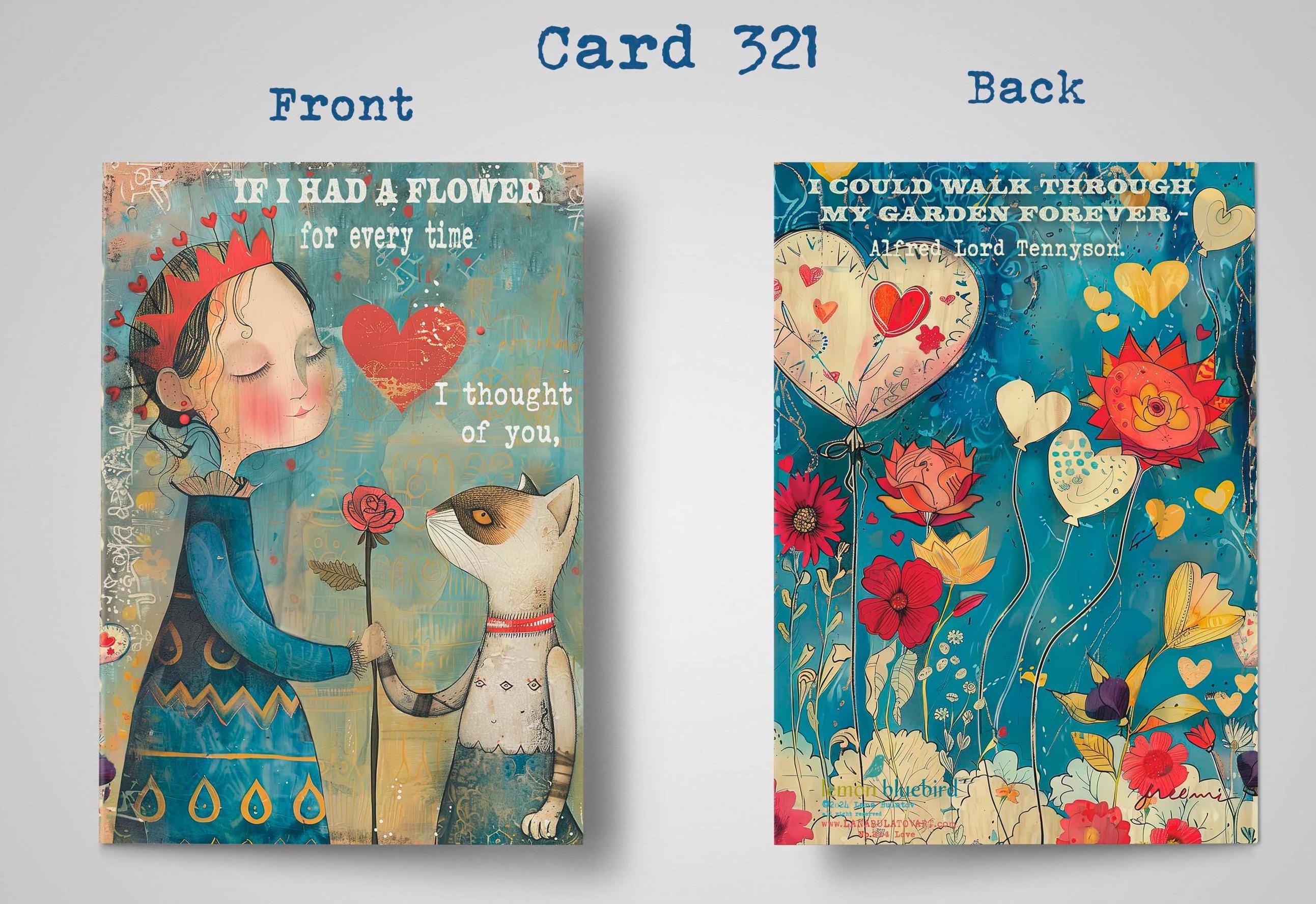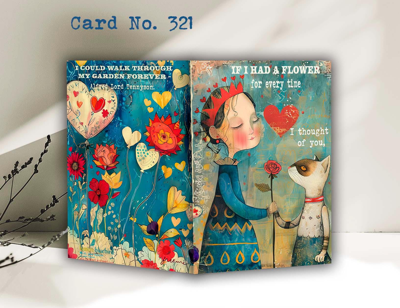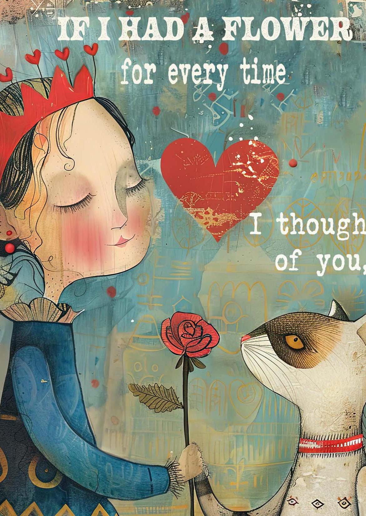 This endearing image of the girl and cat sharing a rose, paired with the timeless, tender quote, makes the card a perfect expression of friendship, love, and the beauty of simple moments spent together.