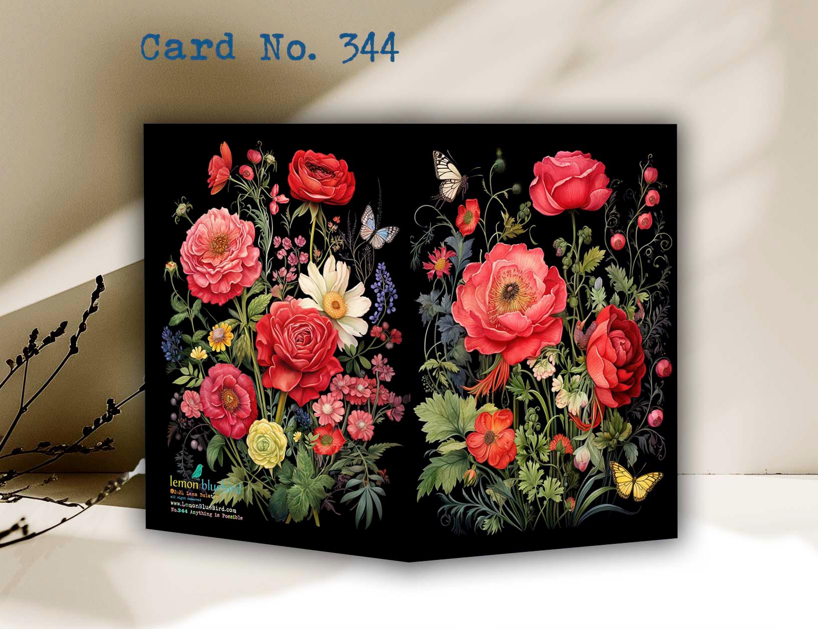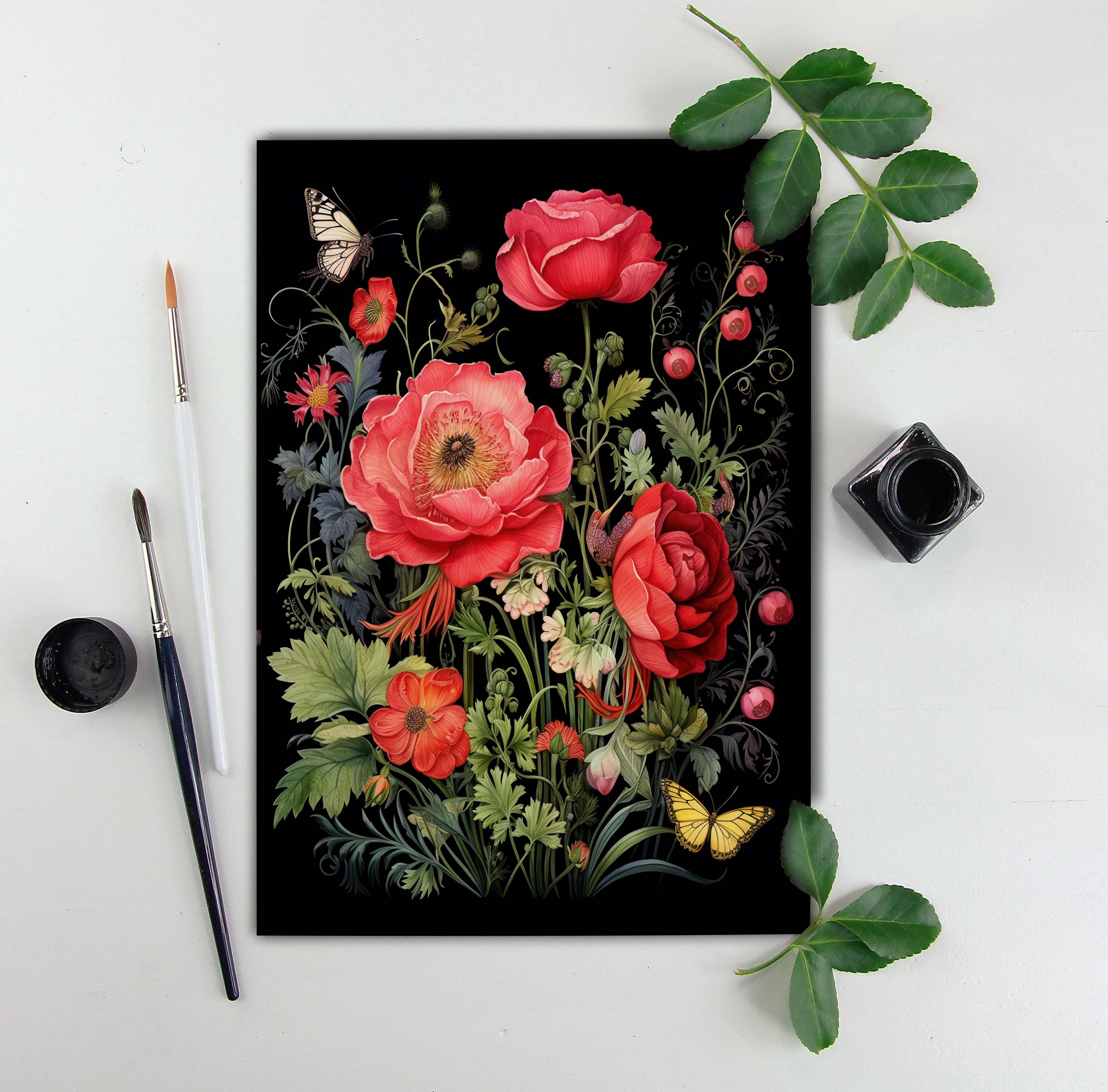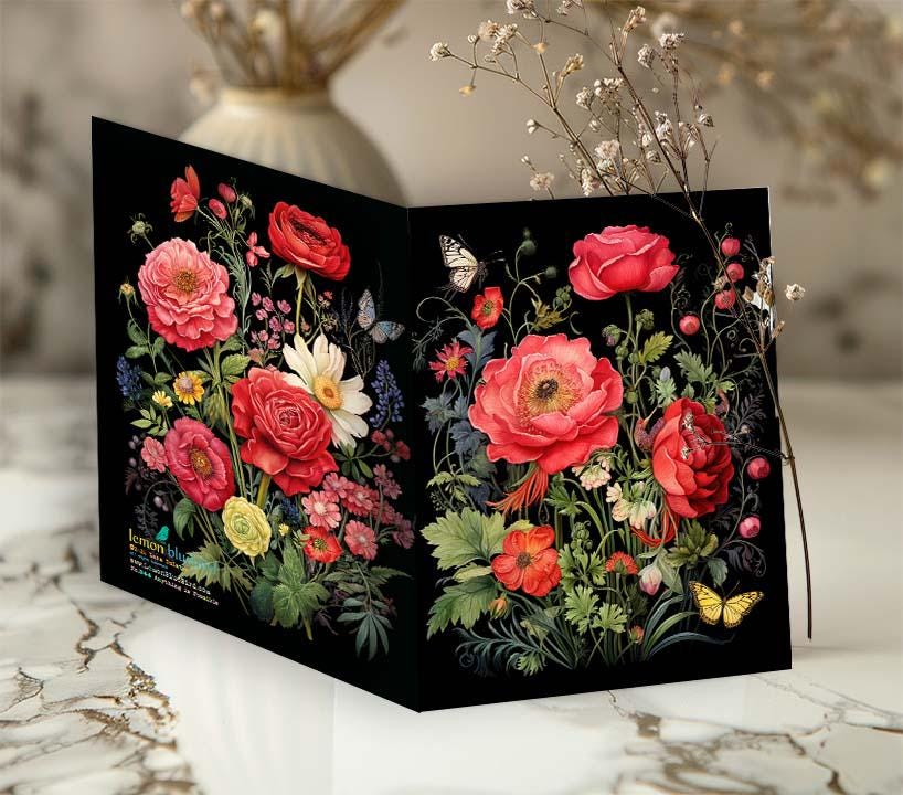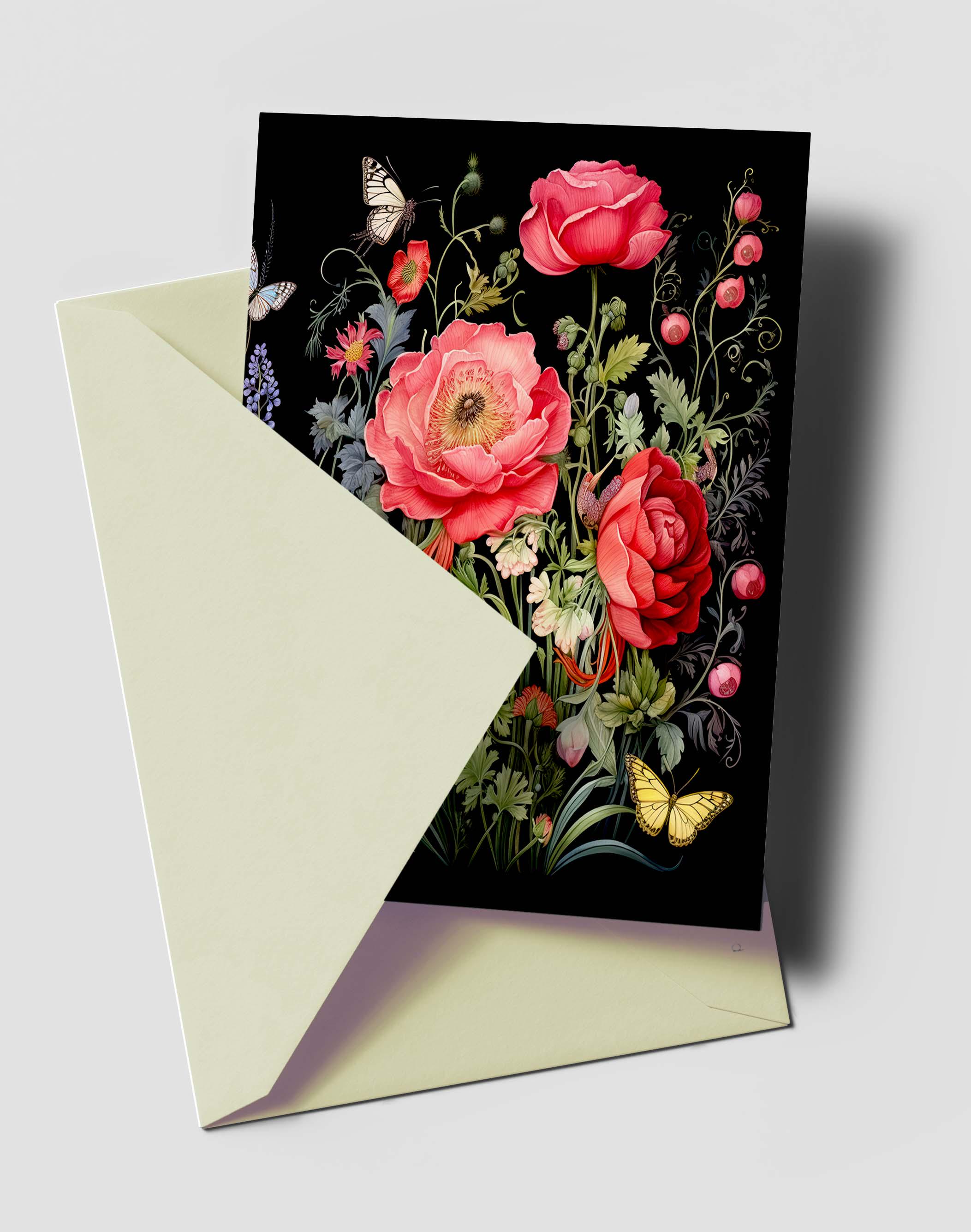 This gloss-finished greeting card showcases a striking design of bright red, dramatic roses surrounded by whimsical wildflowers and fluttering butterflies. The rich black background enhances the vibrant colors, creating a bold and eye-catching contrast. The roses are detailed with delicate petals, while the wildflowers add playful textures in complementary hues. Butterflies with intricate patterns dance gracefully across the design, adding a sense of motion and elegance. Perfect for Valentine, Birthday or just because.