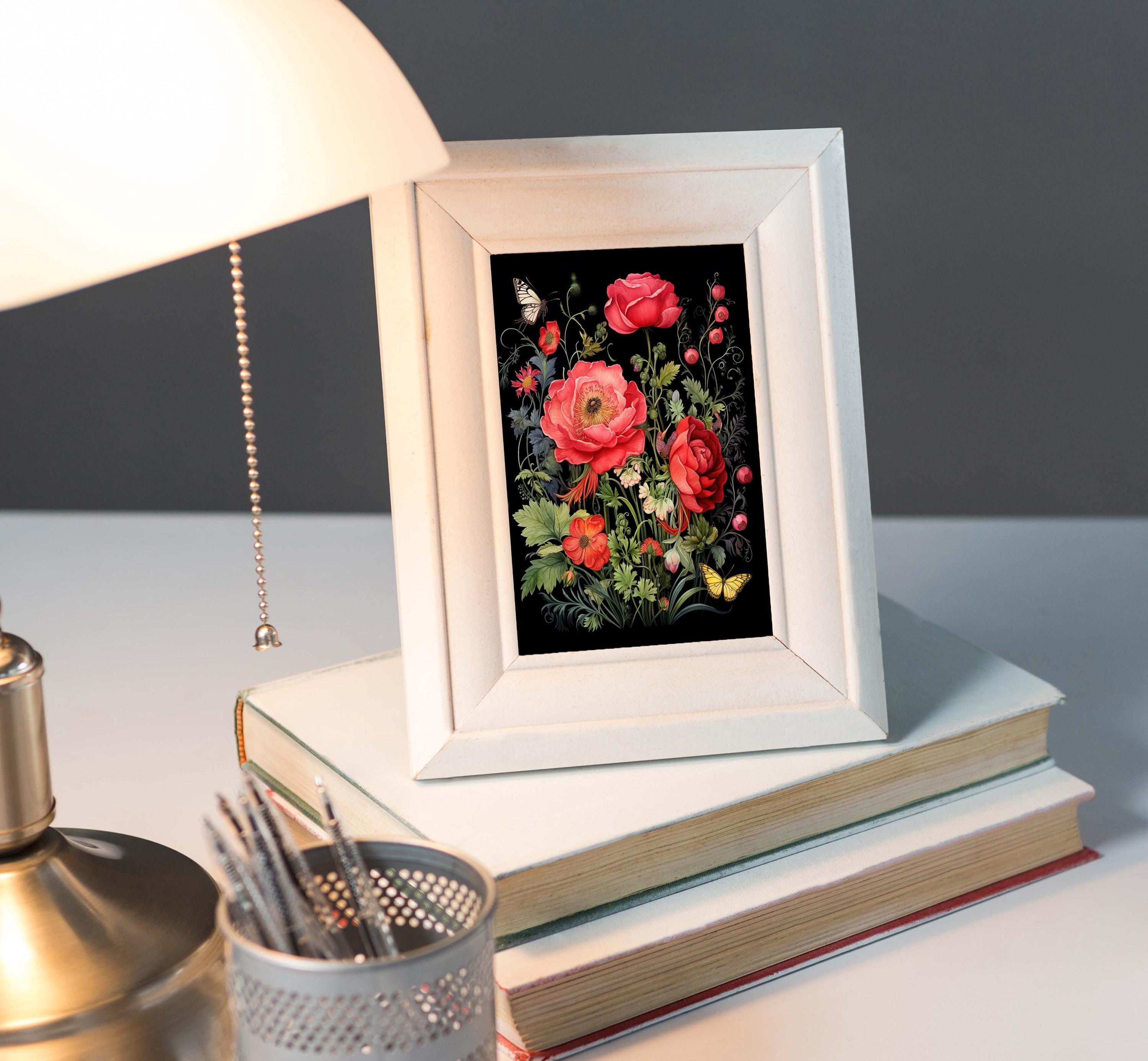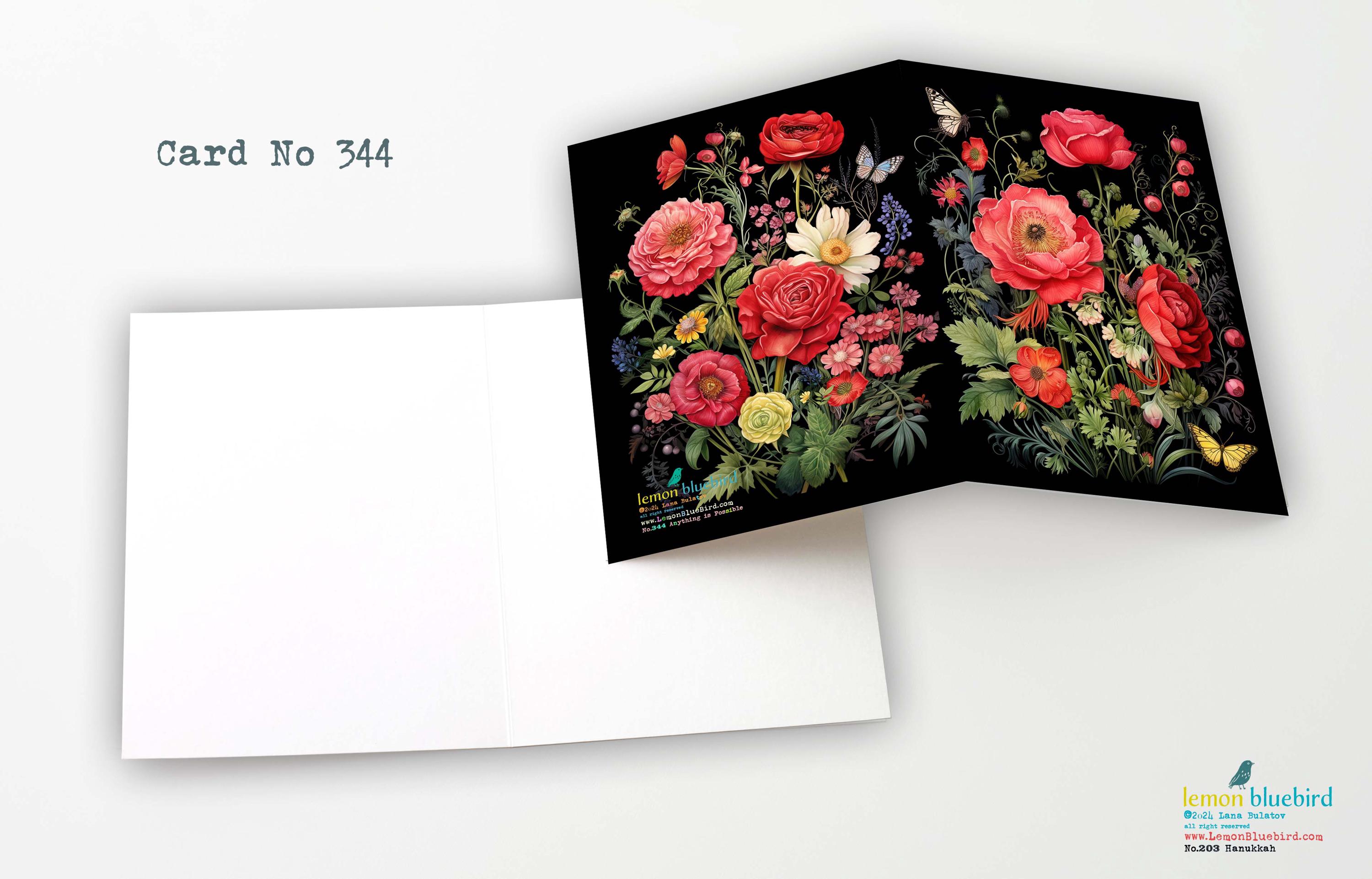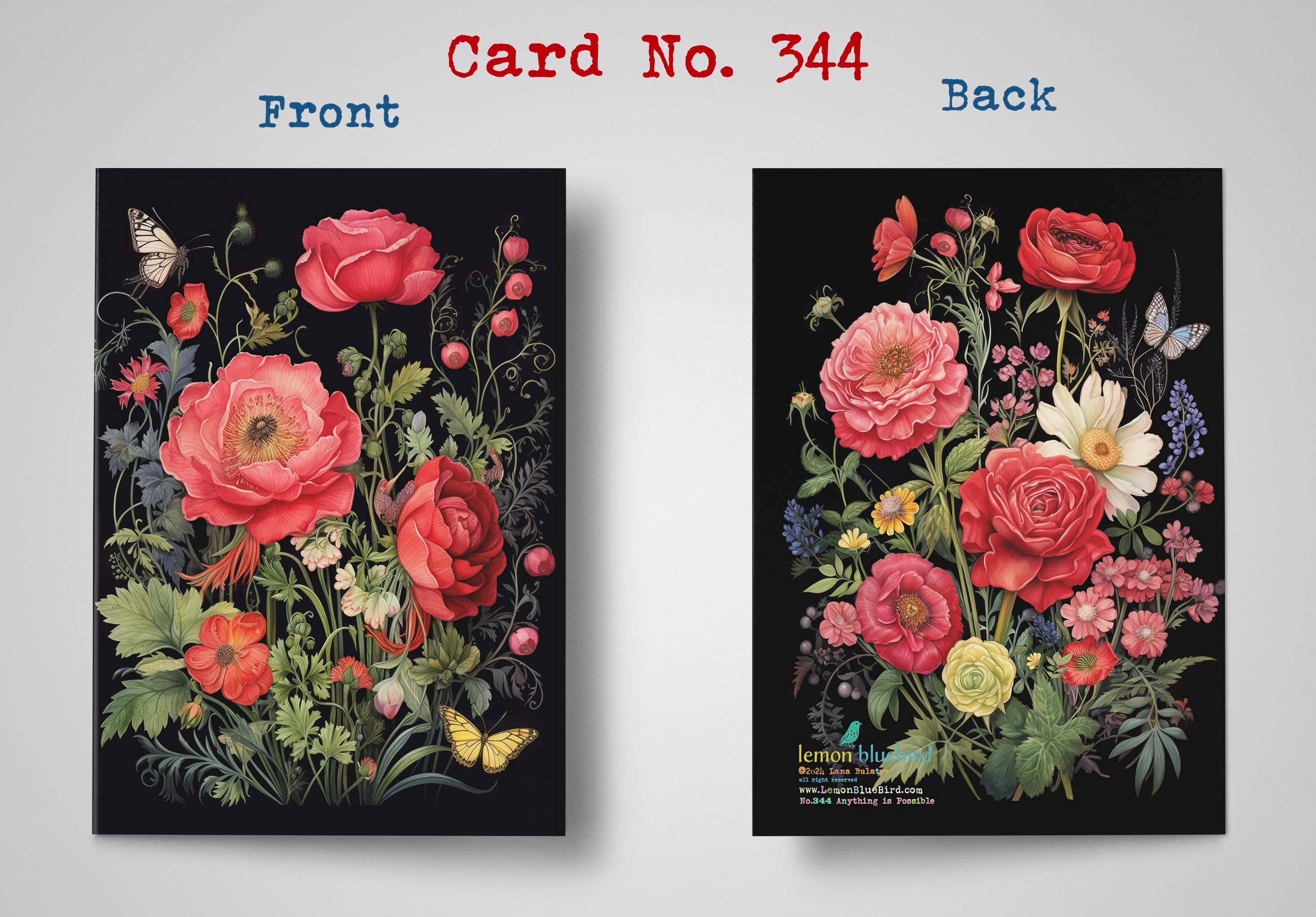 This gloss-finished greeting card showcases a striking design of bright red, dramatic roses surrounded by whimsical wildflowers and fluttering butterflies. The rich black background enhances the vibrant colors, creating a bold and eye-catching contrast. The roses are detailed with delicate petals, while the wildflowers add playful textures in complementary hues. Butterflies with intricate patterns dance gracefully across the design, adding a sense of motion and elegance. Perfect for Valentine, Birthday or just because.