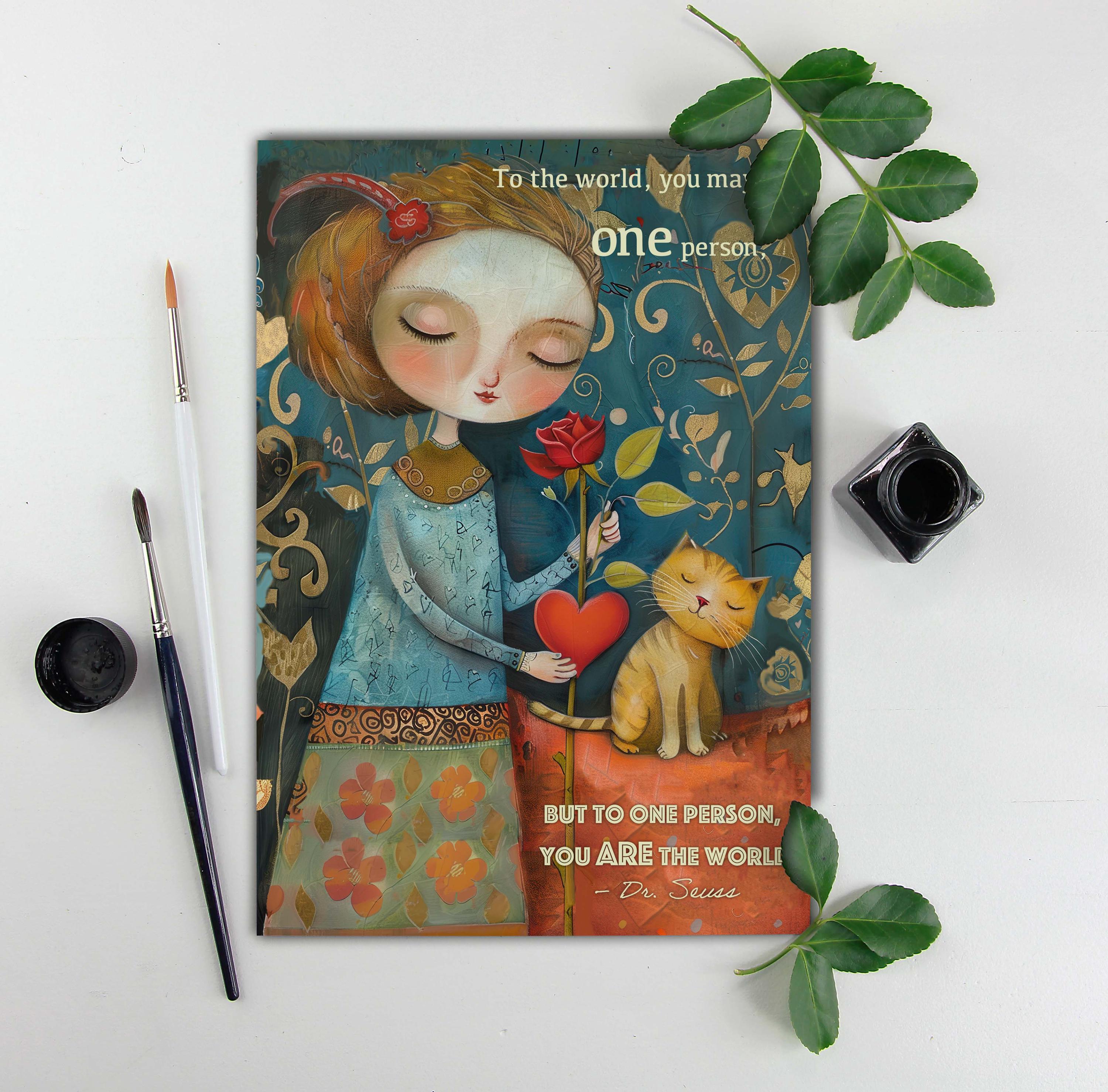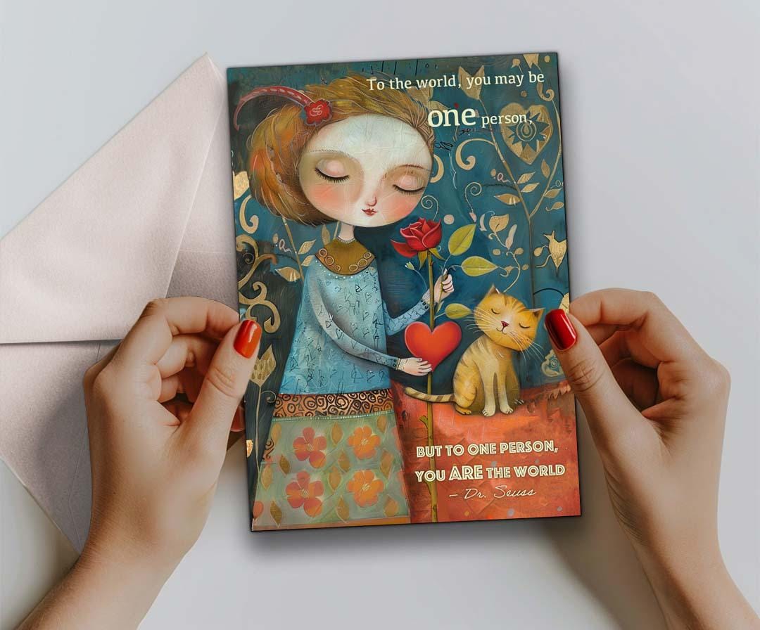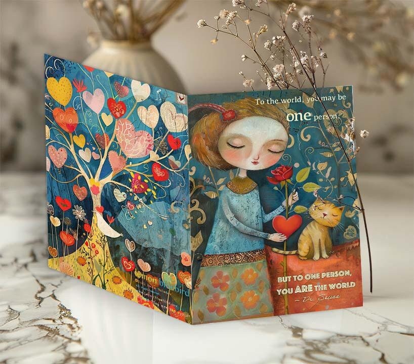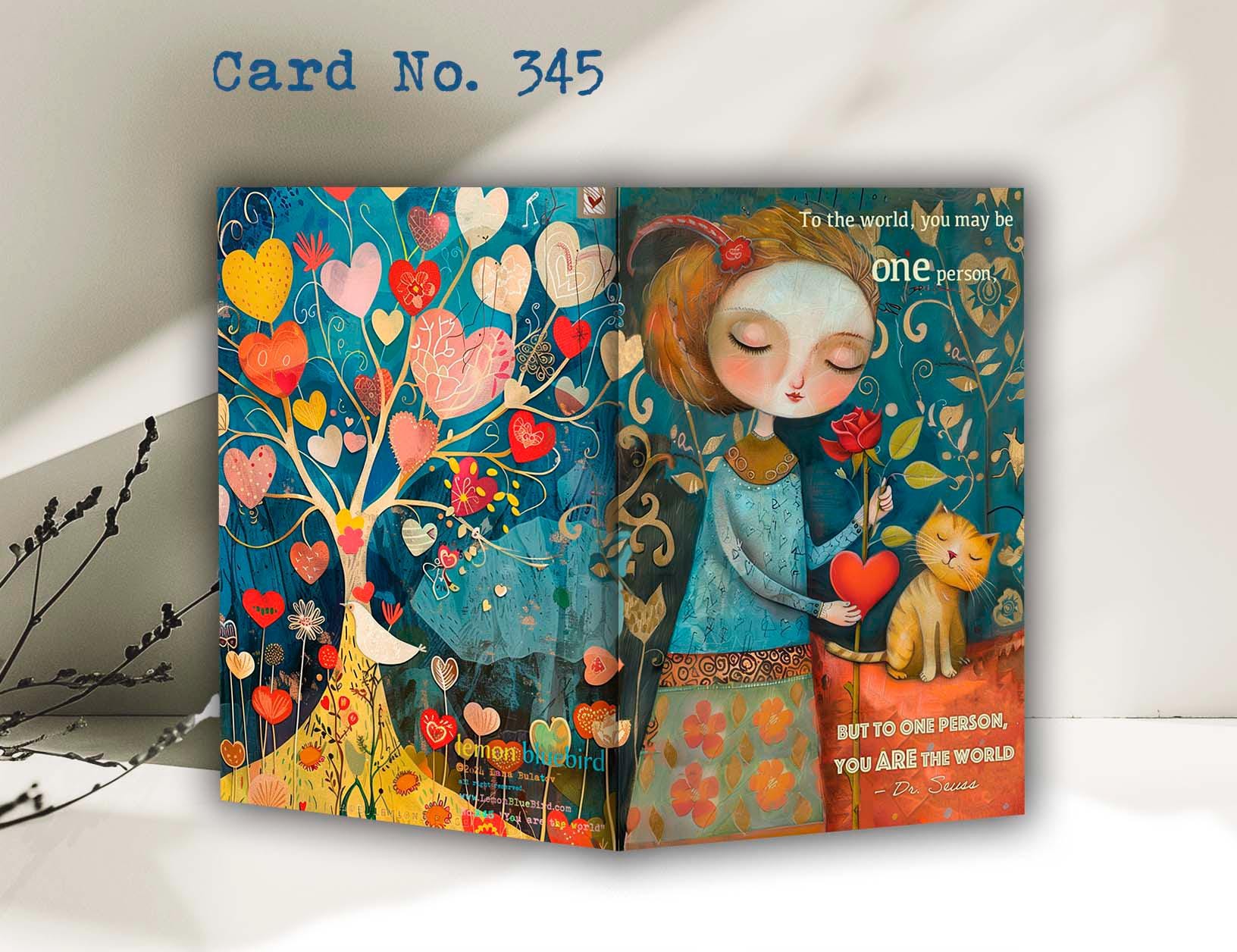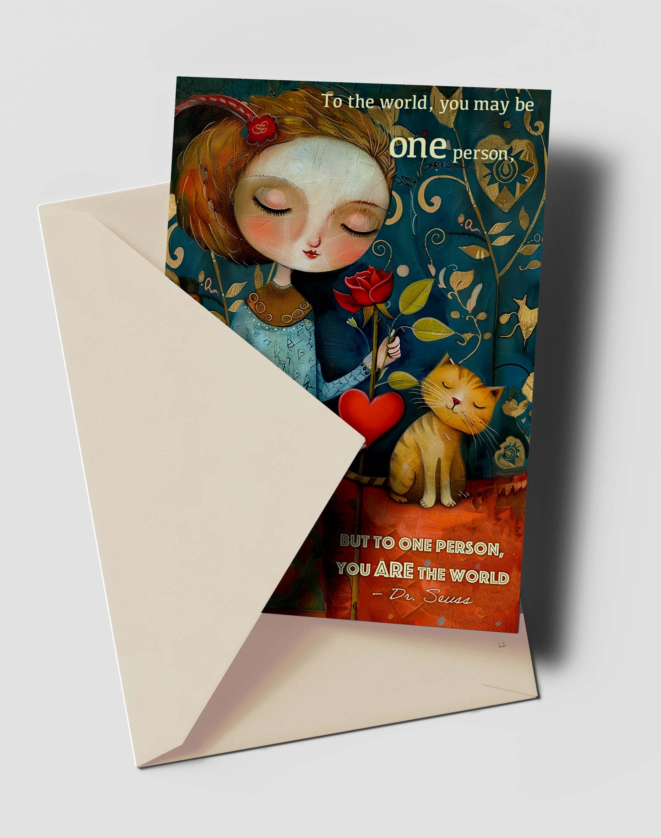 This whimsical Valentine folded greeting card is a vibrant and joyful way to share your love with someone special. The front features an illustration of a young girl with her eyes closed, holding a red rose and a red heart, lost in deep thought. Beside her is her whimsical yellow cat, adding a touch of playfulness to the scene. The card showcases the Dr. Seuss quote: "To the world you may be one person, but to one person you are the world," making it a meaningful keepsake. The back of the card is equally pretty, featuring a colorful tree with hearts growing as leaves, symbolizing love and happiness. The design is brought to life with rich and vibrant shades of blue, green, gold, pink, and red, creating a stunning visual that radiates warmth and positivity. Printed on premium smooth cardstock with a matte finish, this 5x7-inch folded card comes with a coordinating envelope and a blank interior for your personal message. Perfect for Valentineโs Day or any occasion to celebrate love, this card is a beautiful expression of your heartfelt sentiments.