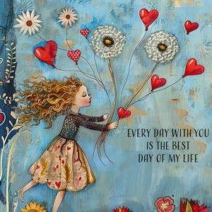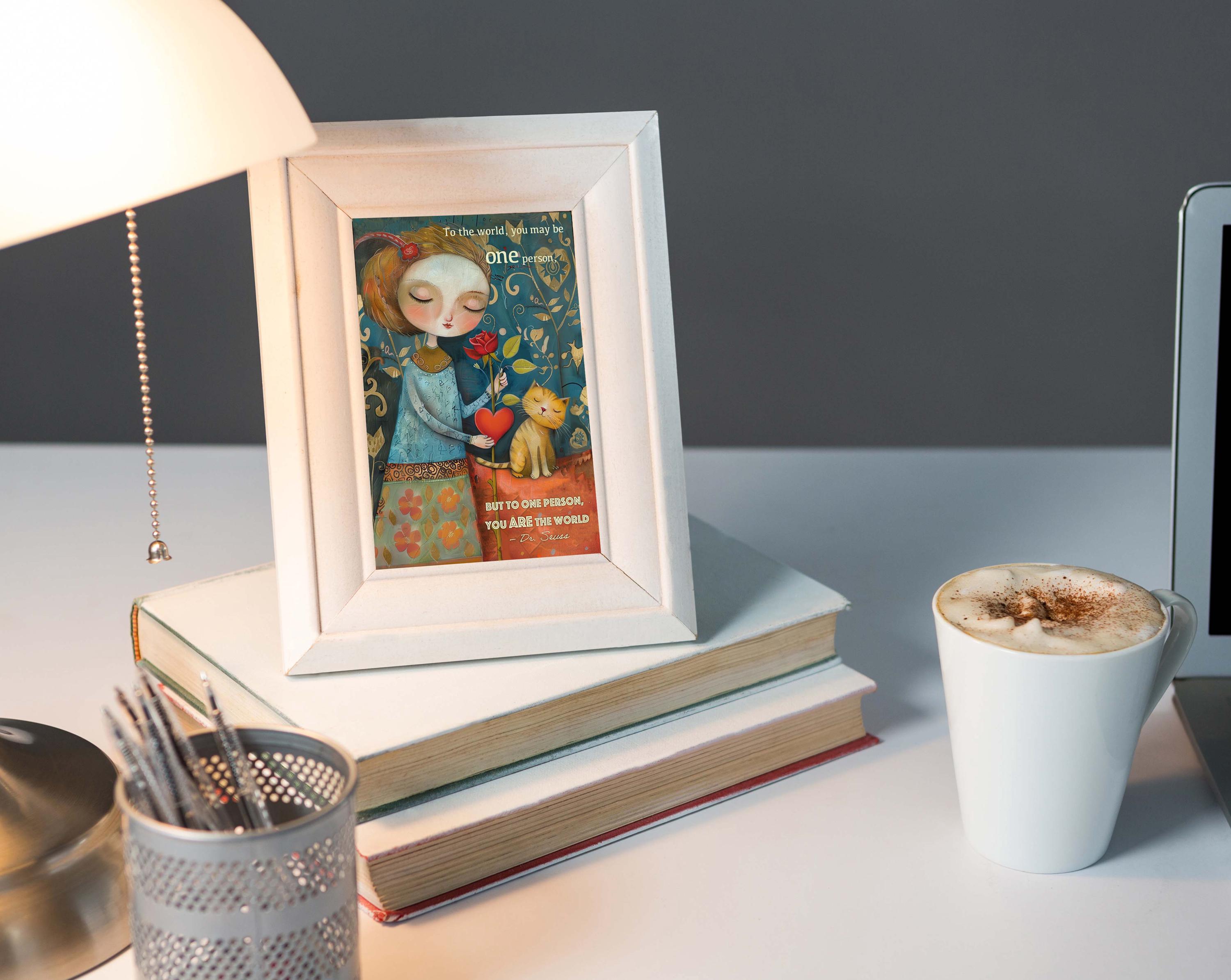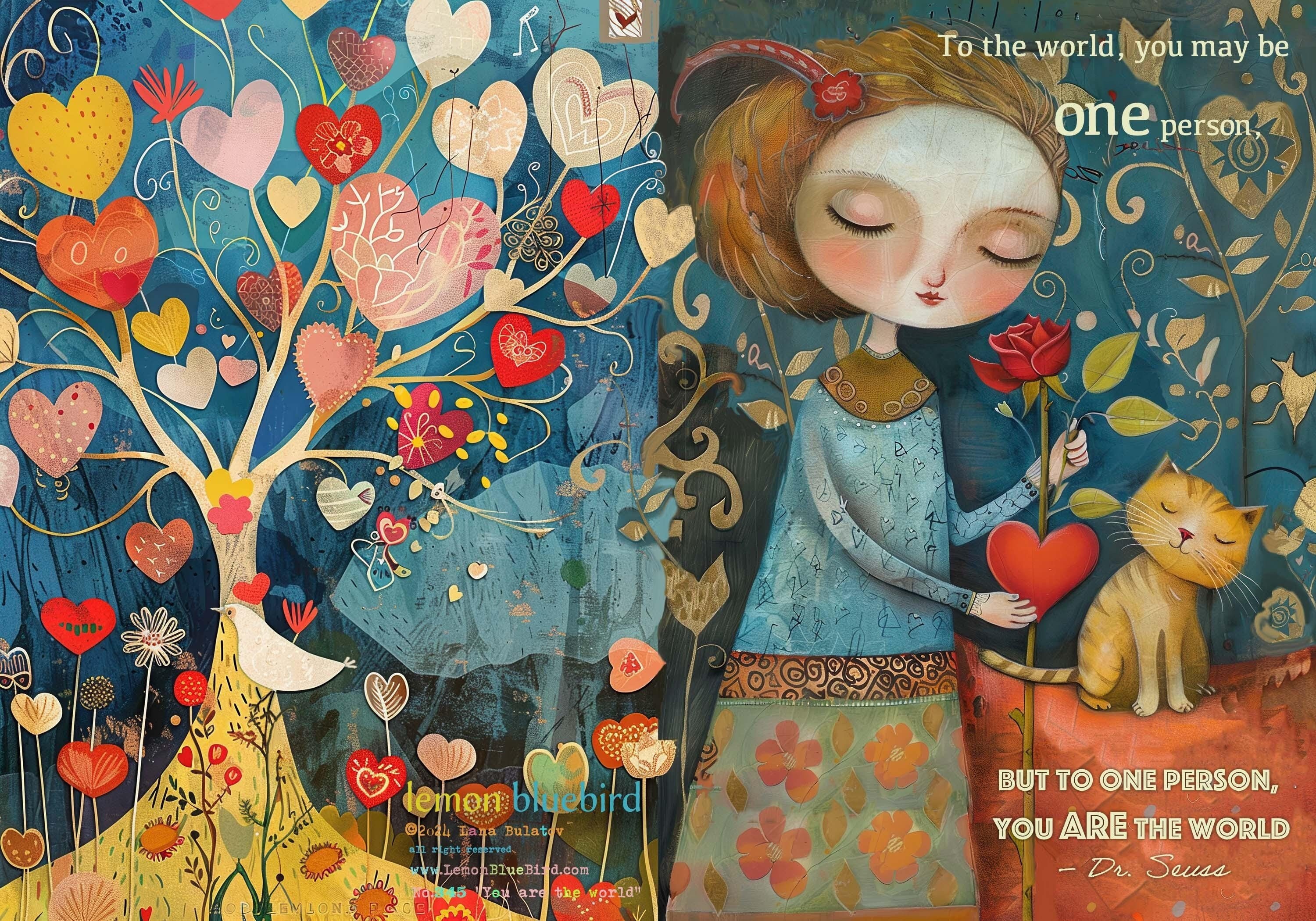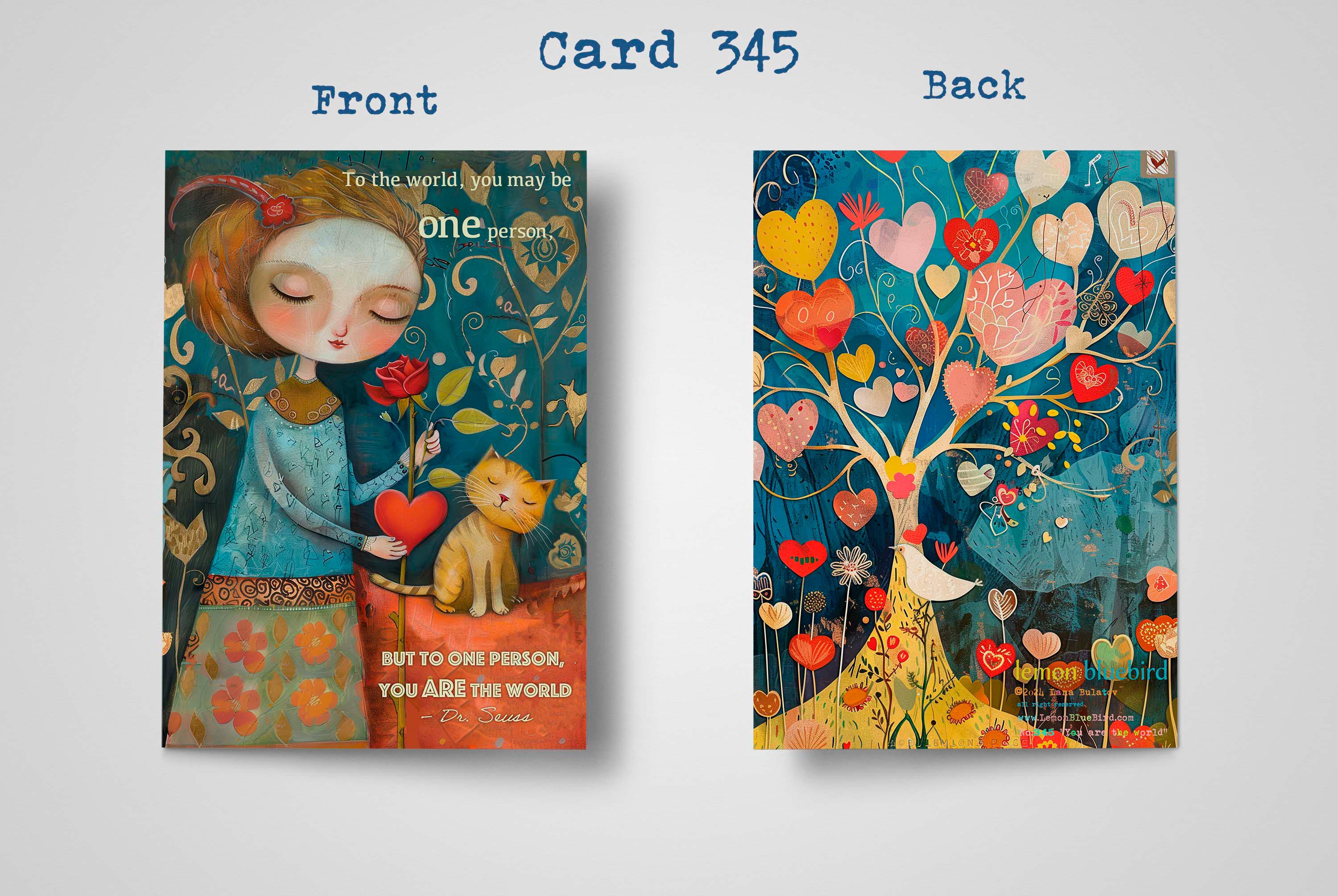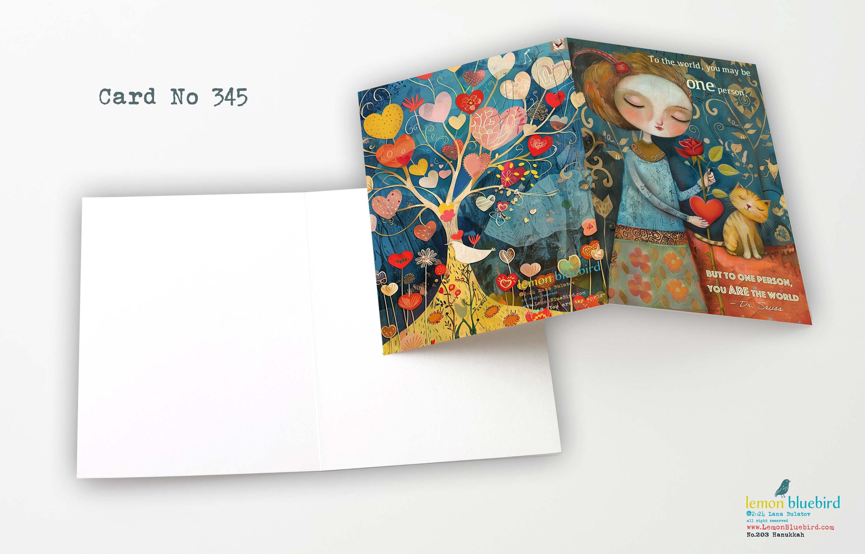 This whimsical Valentine folded greeting card is a vibrant and joyful way to share your love with someone special. The front features an illustration of a young girl with her eyes closed, holding a red rose and a red heart, lost in deep thought. Beside her is her whimsical yellow cat, adding a touch of playfulness to the scene. The card showcases the Dr. Seuss quote: "To the world you may be one person, but to one person you are the world," making it a meaningful keepsake. The back of the card is equally pretty, featuring a colorful tree with hearts growing as leaves, symbolizing love and happiness. The design is brought to life with rich and vibrant shades of blue, green, gold, pink, and red, creating a stunning visual that radiates warmth and positivity. Printed on premium smooth cardstock with a matte finish, this 5x7-inch folded card comes with a coordinating envelope and a blank interior for your personal message. Perfect for Valentineโs Day or any occasion to celebrate love, this card is a beautiful expression of your heartfelt sentiments.