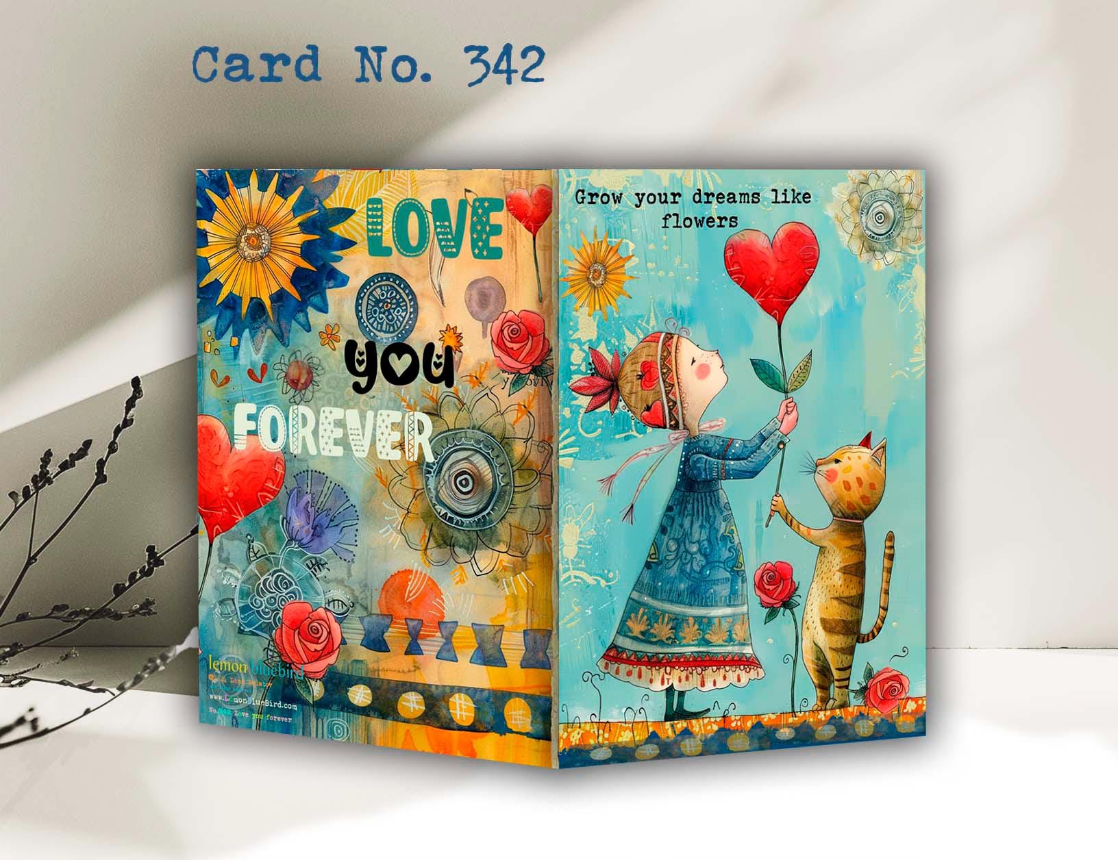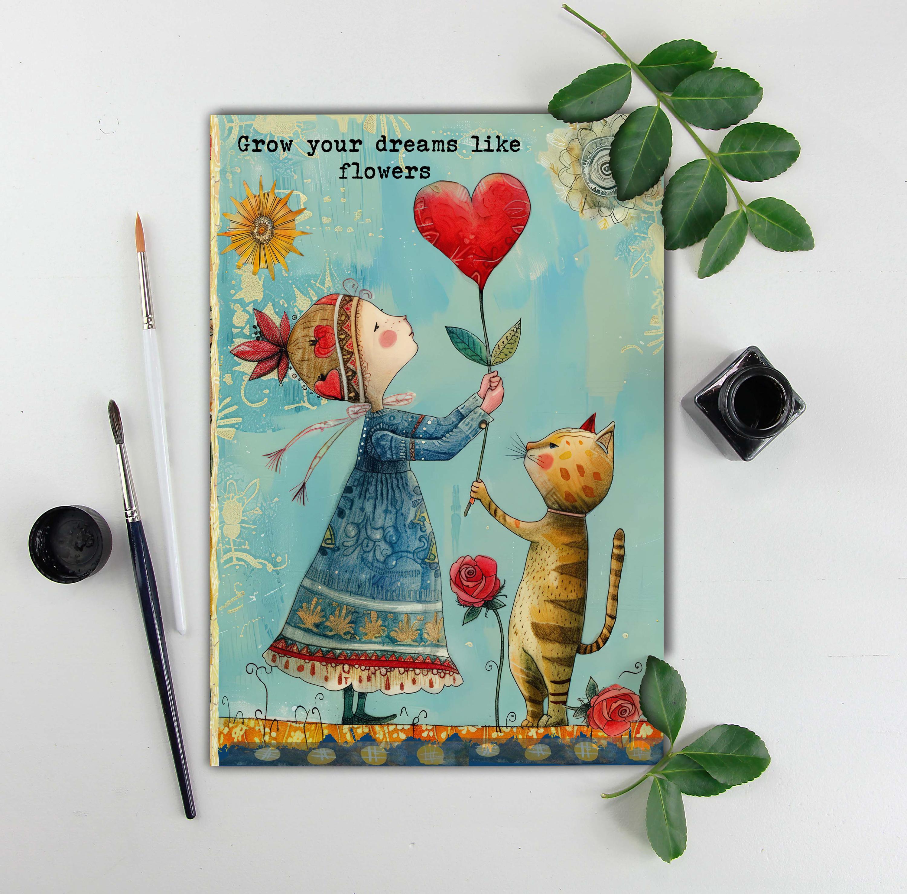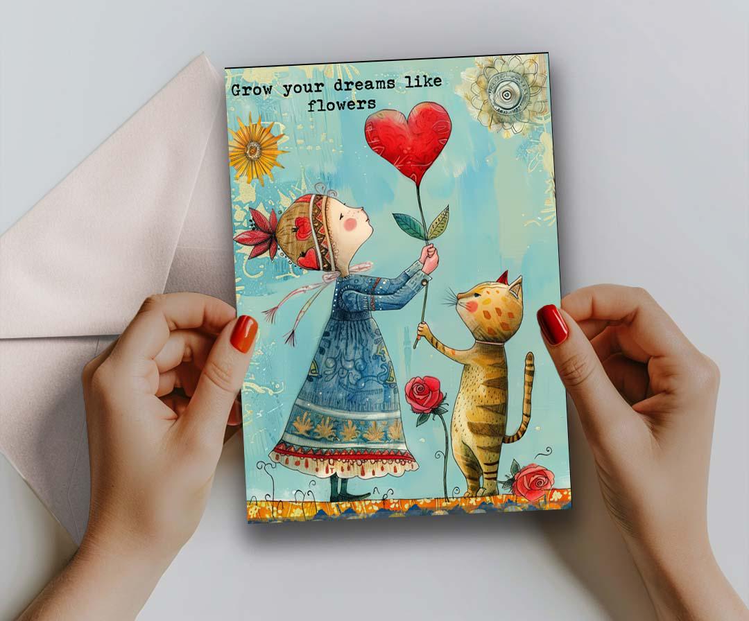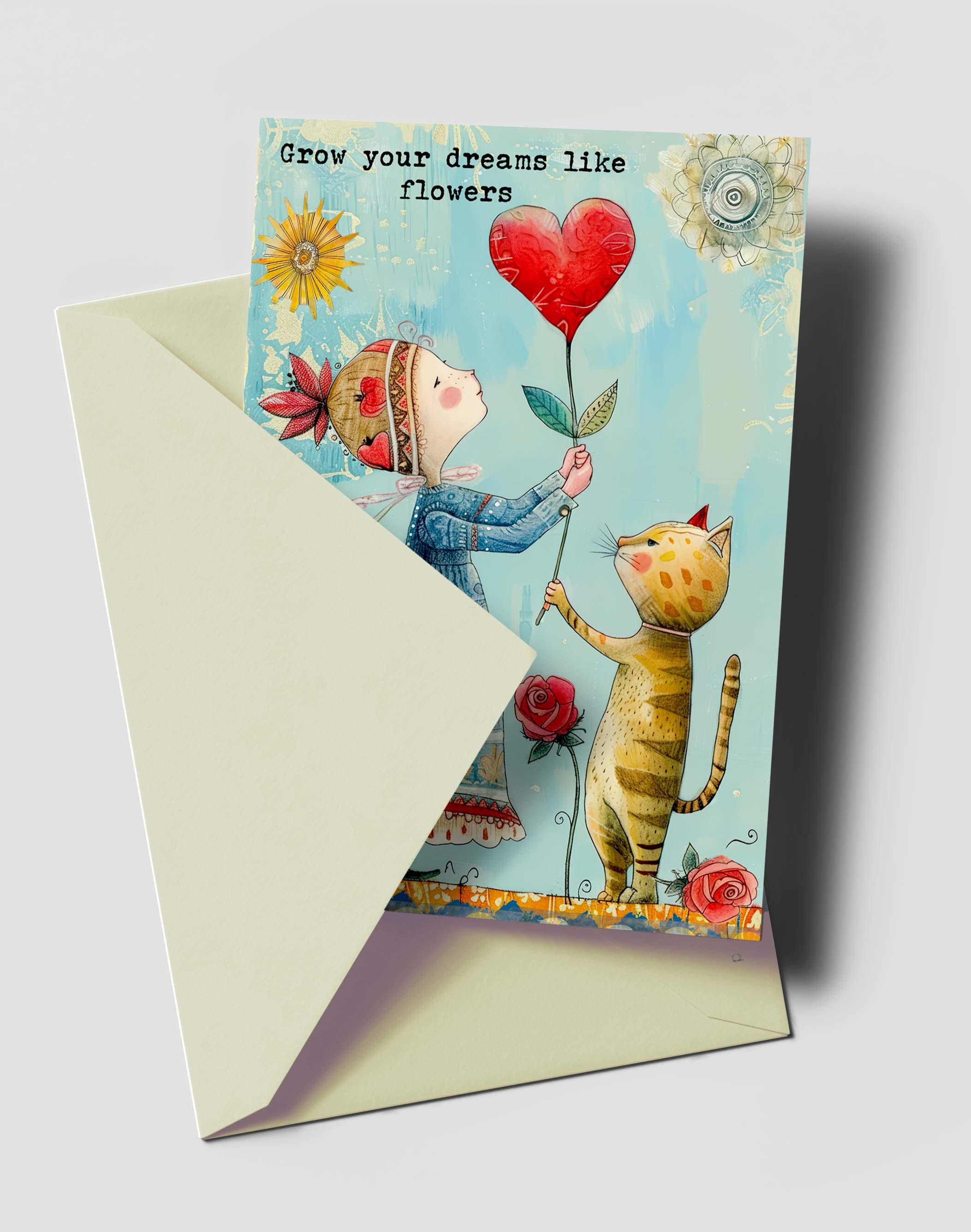 This colorful greeting card features a charming illustration of a girl and her cat, both holding a heart-shaped flower together, symbolizing love and shared dreams. Above them, a sign reading "Grow your dreams like flowers," adding a touch of inspiration and magic. The artwork is vibrant and whimsical, filled with joyful details and a bright color palette that radiates happiness.