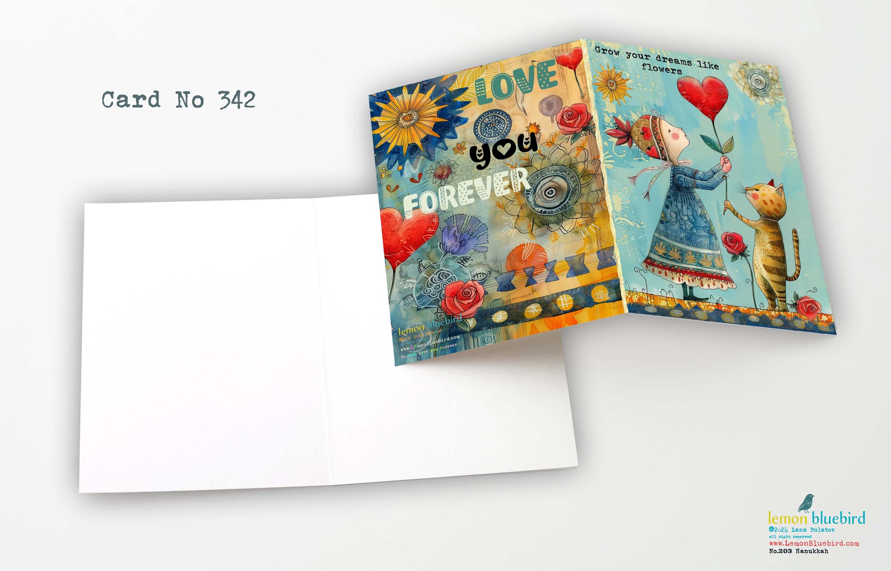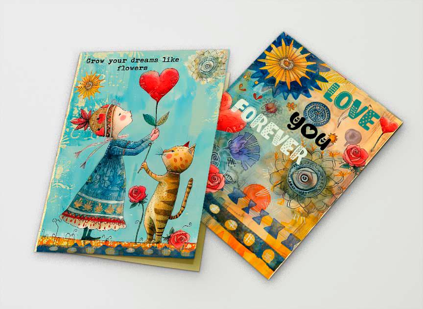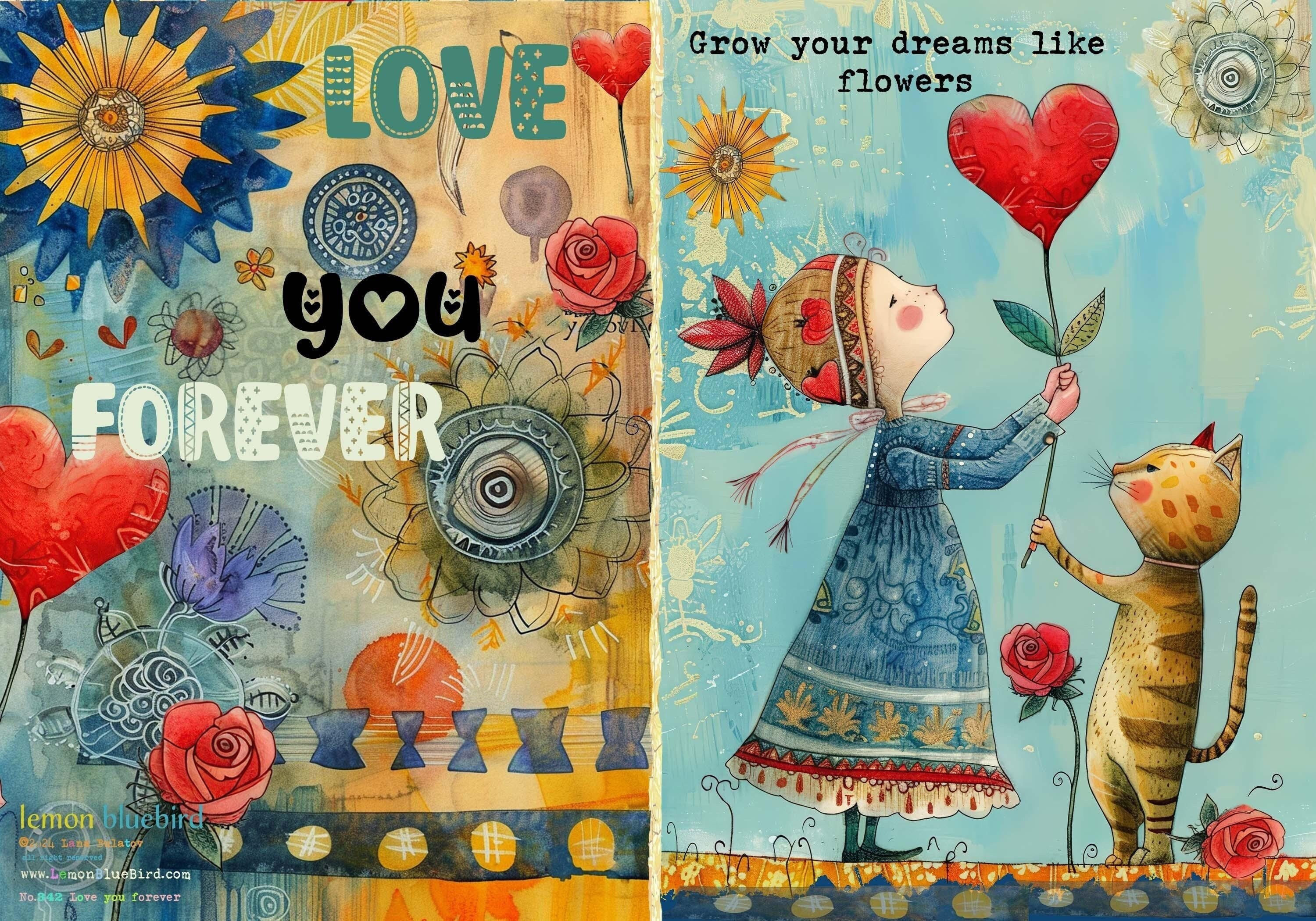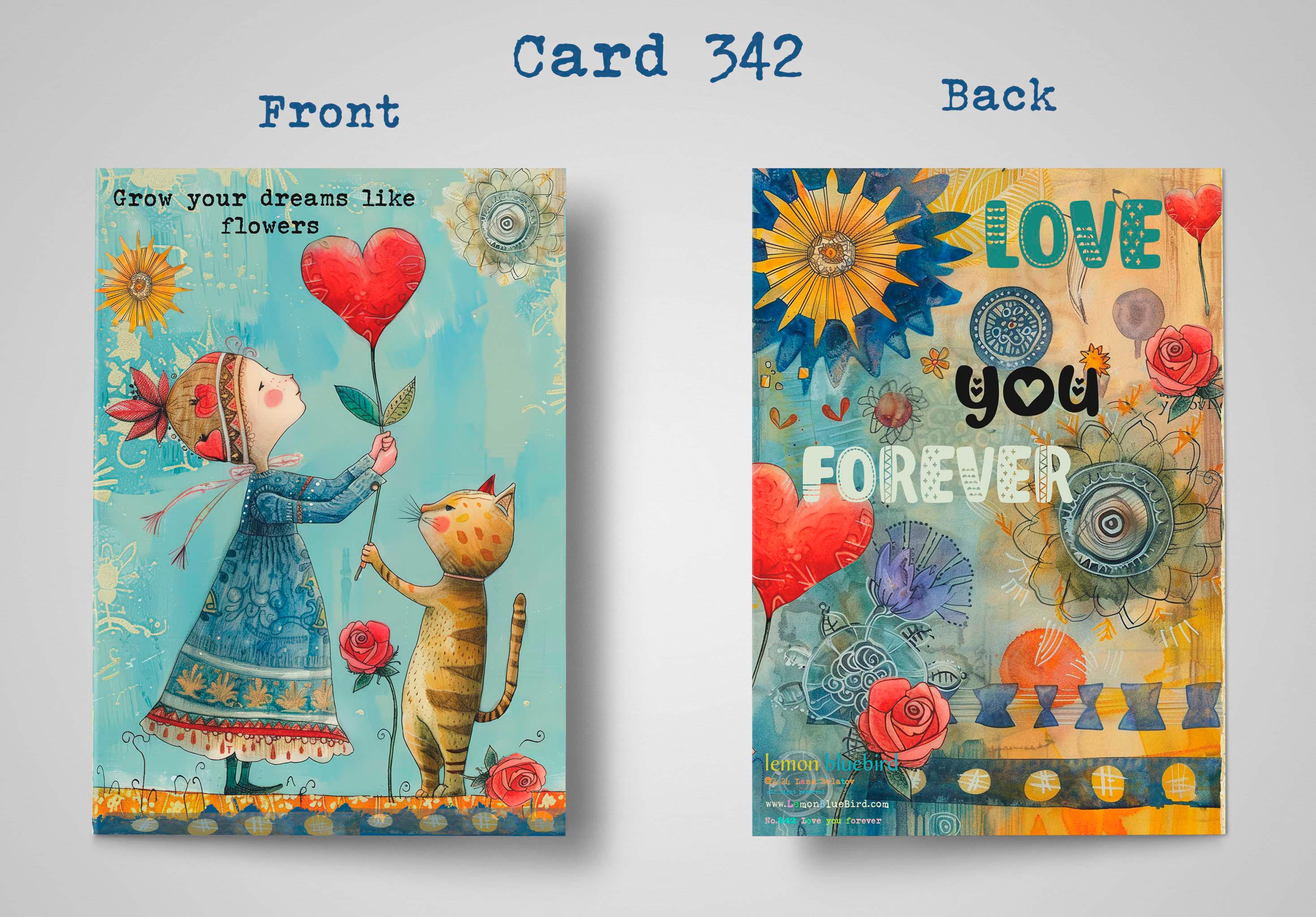 This colorful greeting card features a charming illustration of a girl and her cat, both holding a heart-shaped flower together, symbolizing love and shared dreams. Above them, a sign reading "Grow your dreams like flowers," adding a touch of inspiration and magic. The artwork is vibrant and whimsical, filled with joyful details and a bright color palette that radiates happiness.