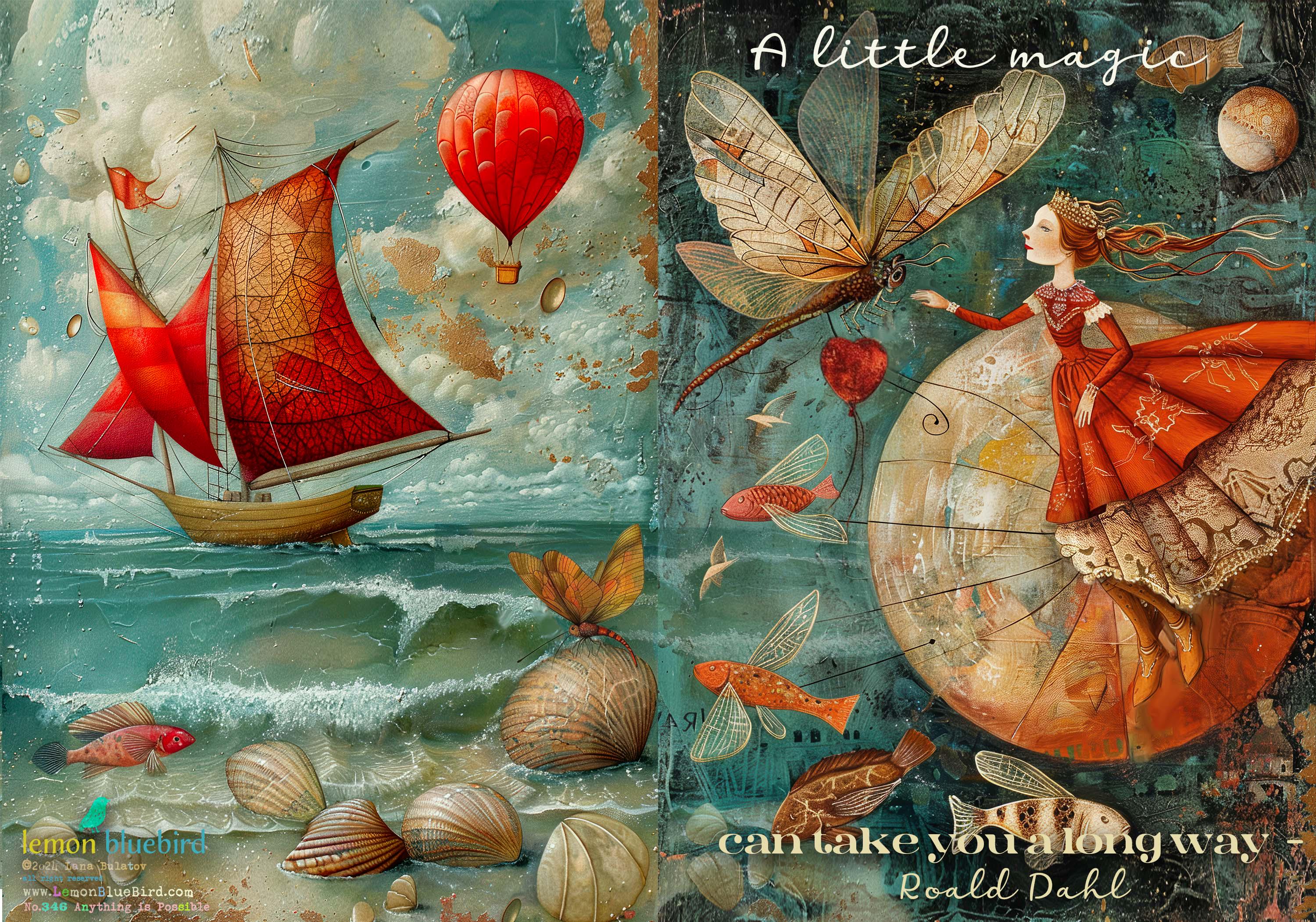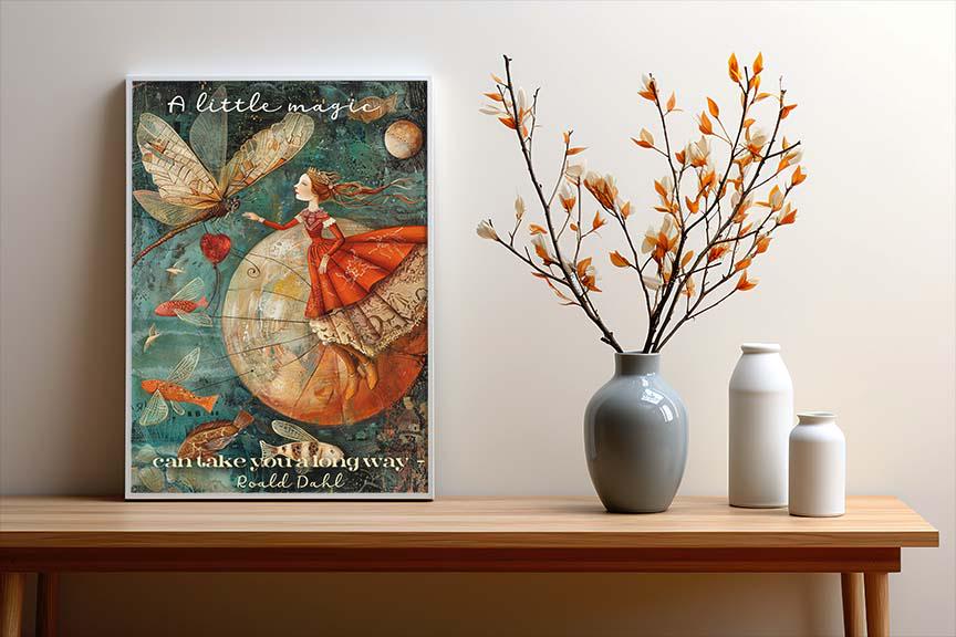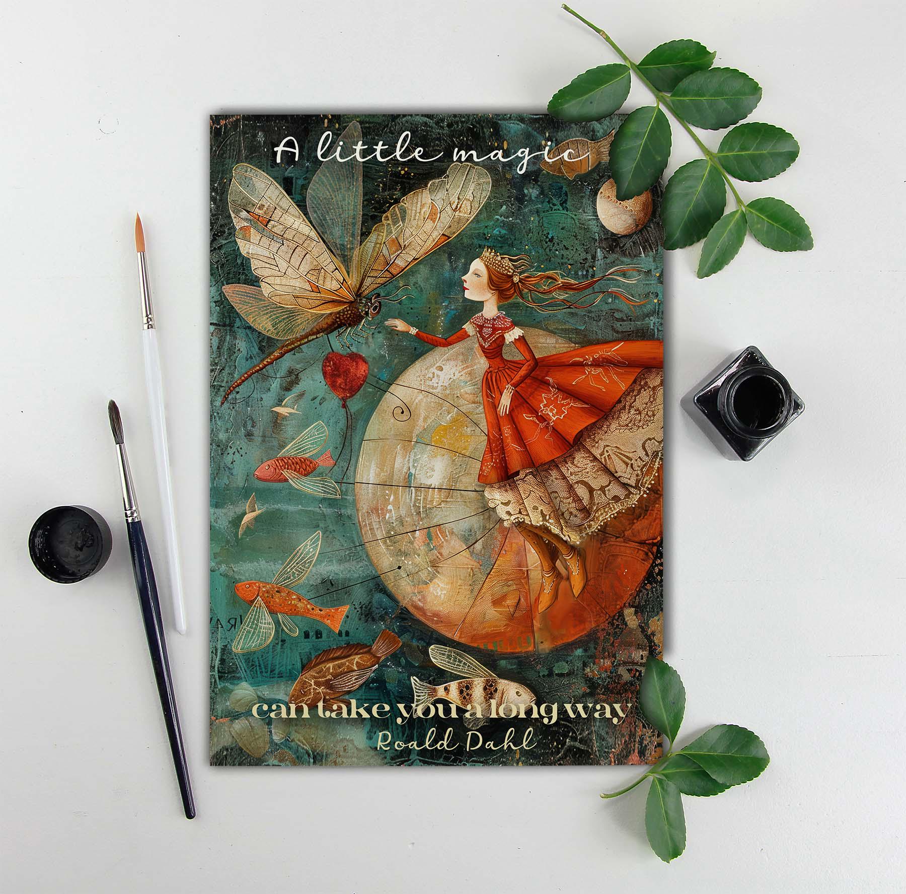 A beautiful lady in a Renaissance-style red gown floats between glowing reddish planets. Around her, whimsical dragonflies and magical fish drift through the air. The quote, "A little magic can take you a long way," adds a sense of hope and inspiration.