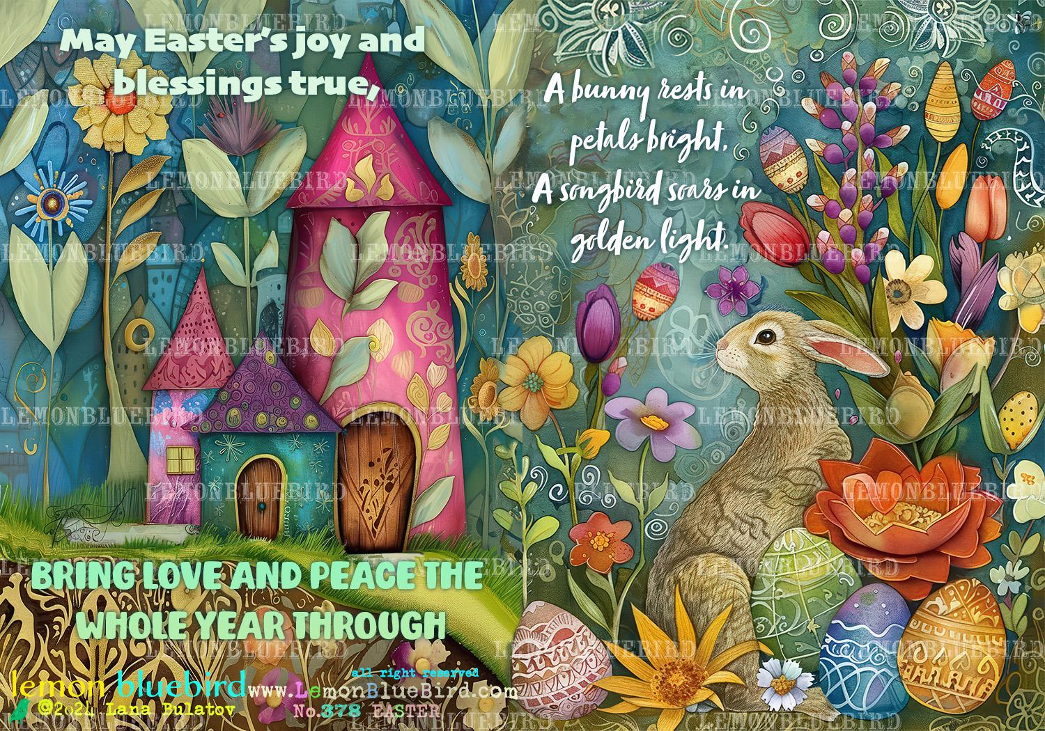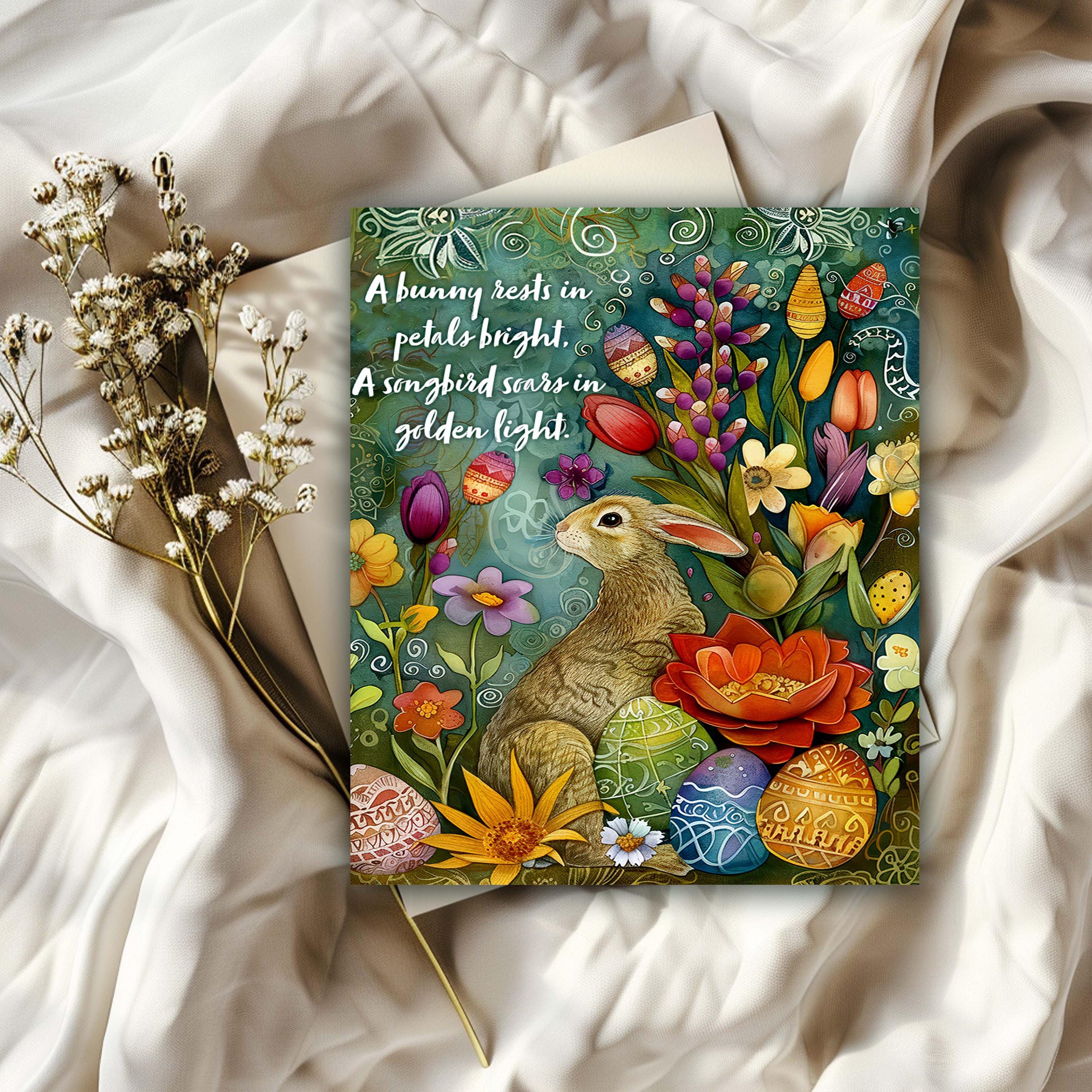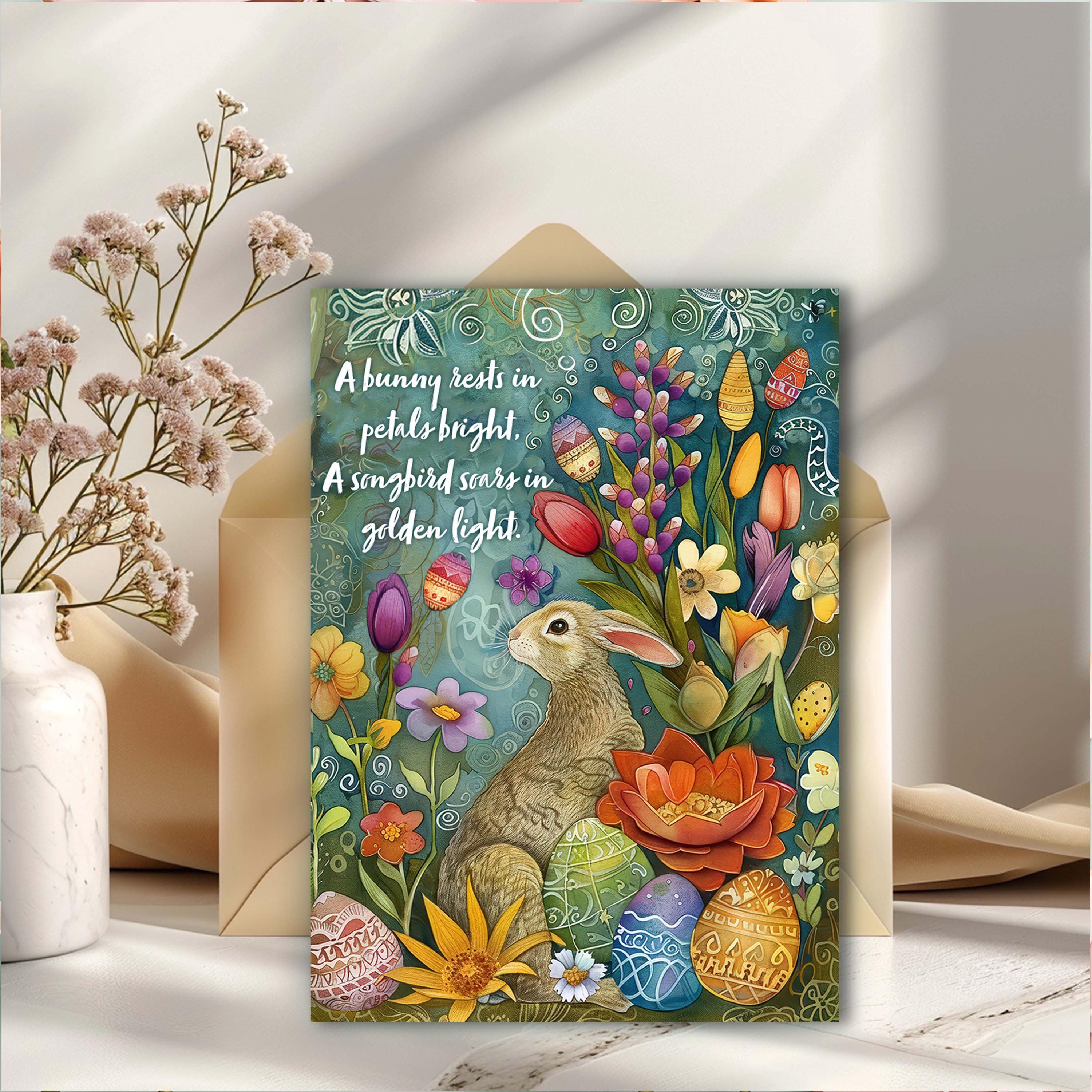 ๐ทCelebrate Easter with this vibrant and whimsical Easter card, featuring an adorable bunny surrounded by spring flowers and colorful Easter eggs. The charming illustration captures the magic of the season in a unique and cheerful style, perfect for spreading warmth and happiness. This delightful Easter greeting card brings a bright touch of springtime magic.