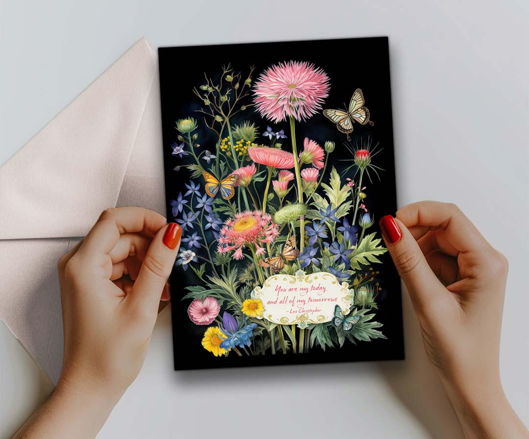 ๐Celebrate with this vibrant and whimsical card, inspired by original hand-painted artwork. This design features a joyful blend of colors, and charming garden fantasy flowers themed details that capture the beauty of nature.