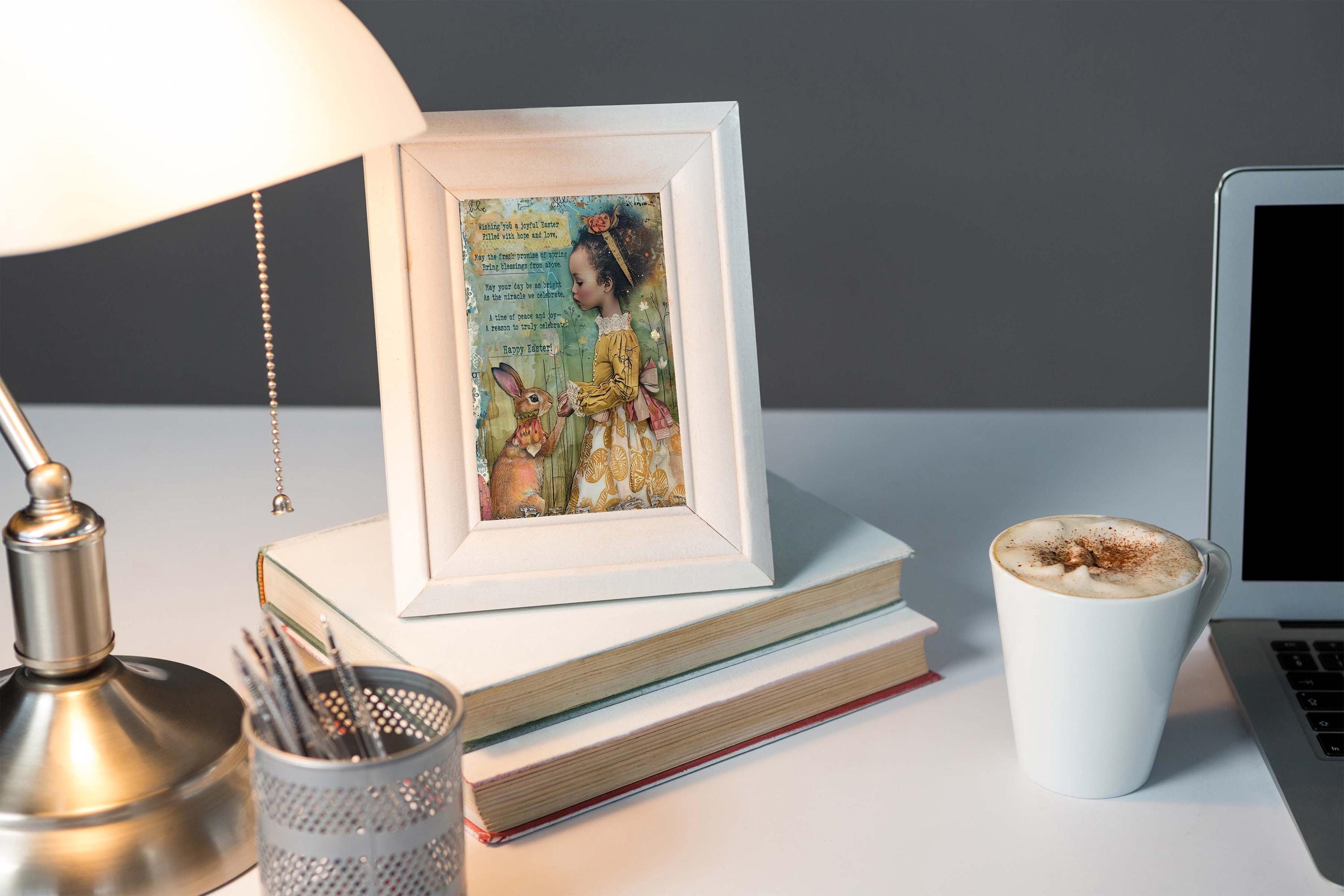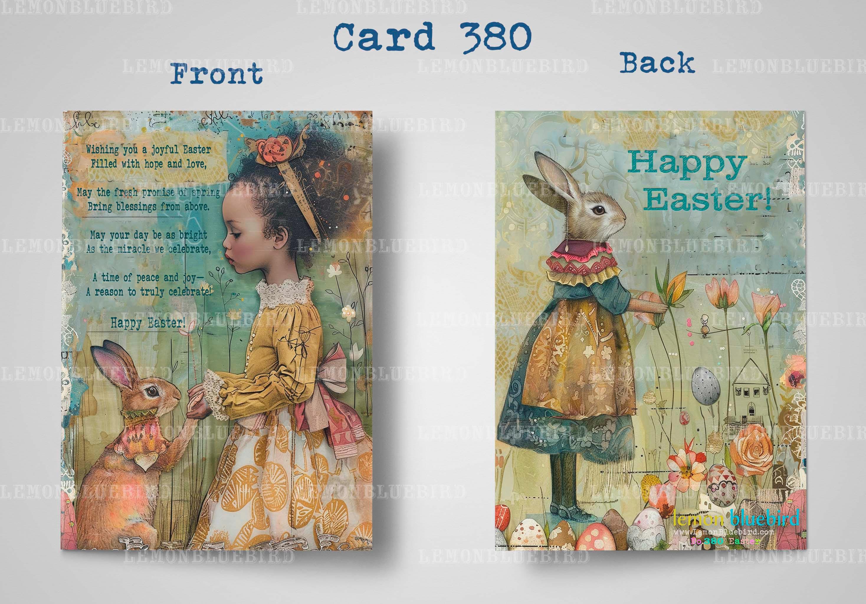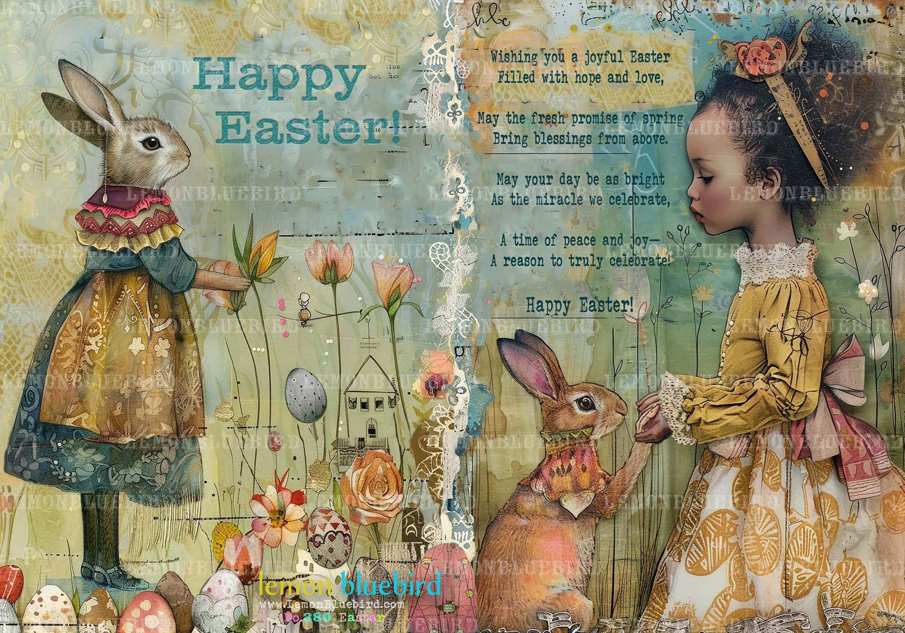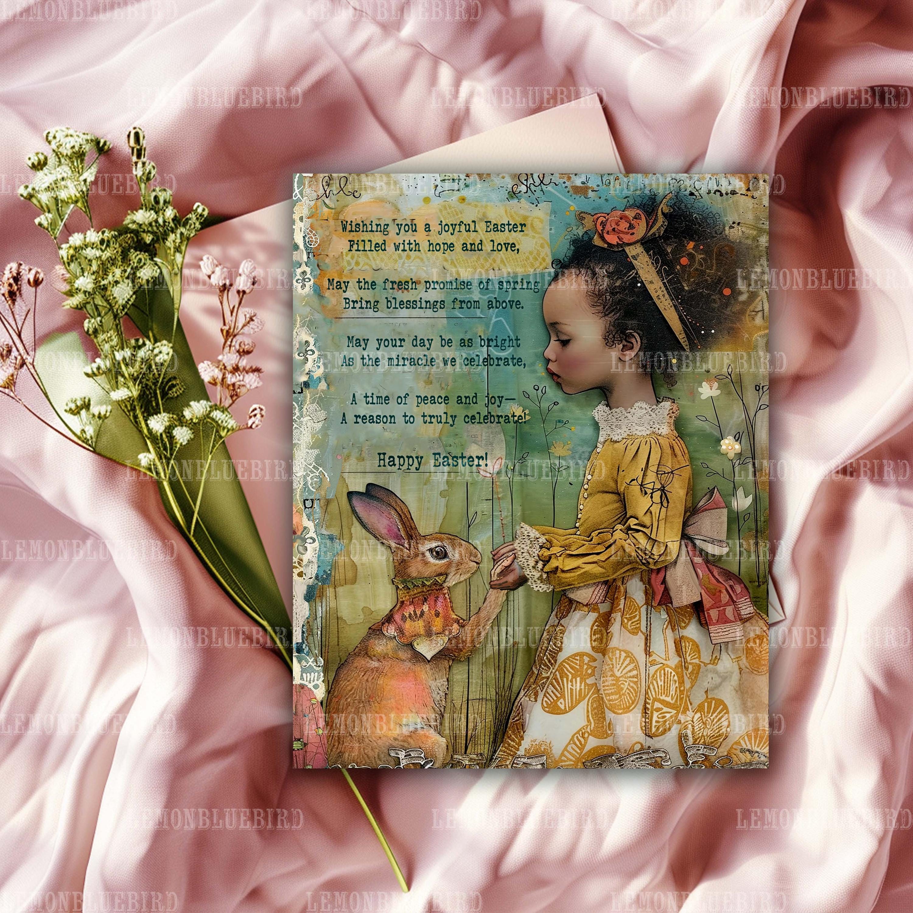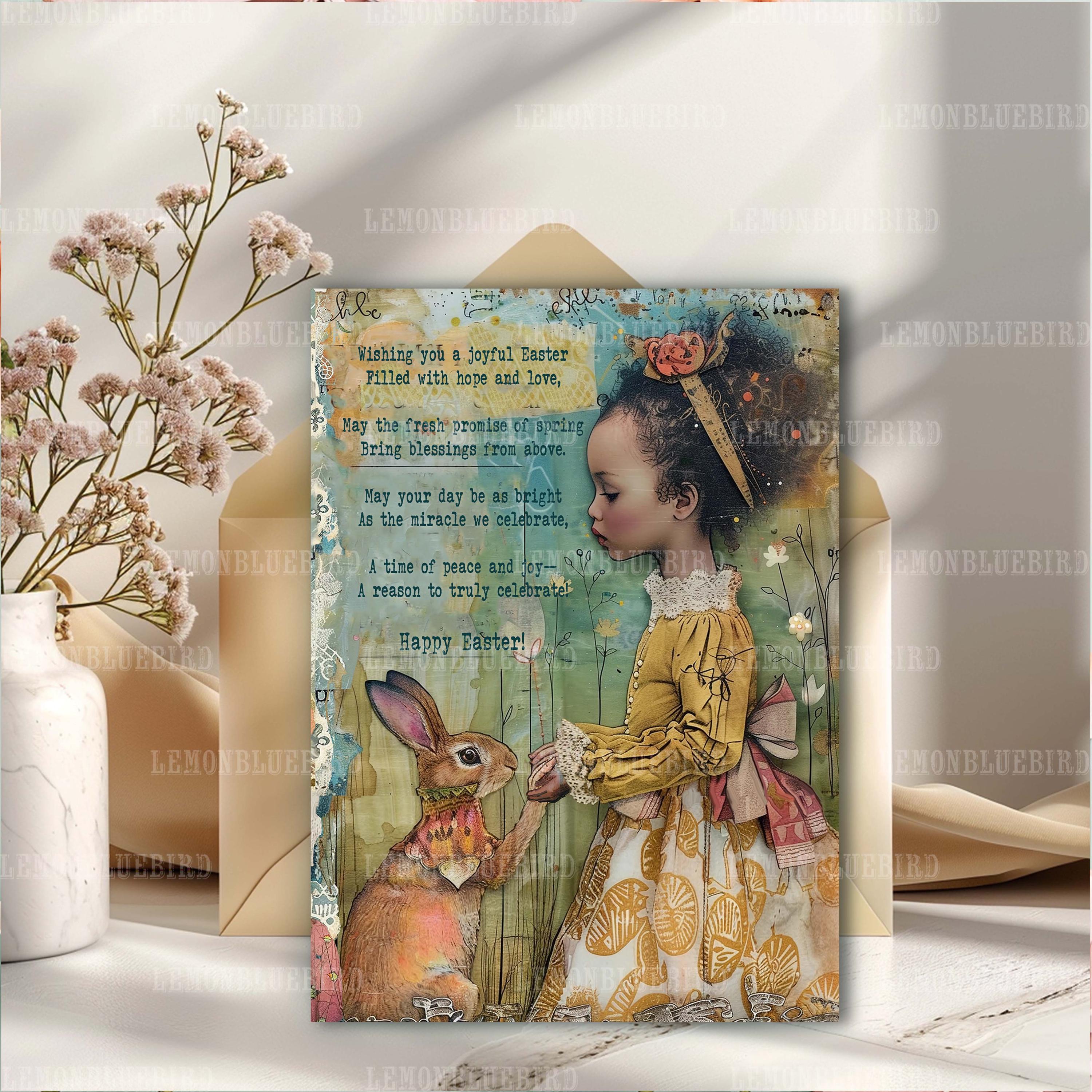 ๐ทCelebrate Easter with this vibrant and whimsical Easter card,๐ทThis charming vintage-style Easter greeting card features a sweet little girl dressed in a soft pastel dress with lace trim. She holds hands with her bunny, who sits beside her. The background is a blend of soft greens with subtle floral patterns. Her dress and the surrounding garden create a timeless, classic feel with a warm, nostalgic palette. The girl's gentle smile and the bunnyโs snuggled pose bring a sense of joy and tenderness. The card is beautifully framed with a lace-inspired border, adding a touch of old-world elegance.