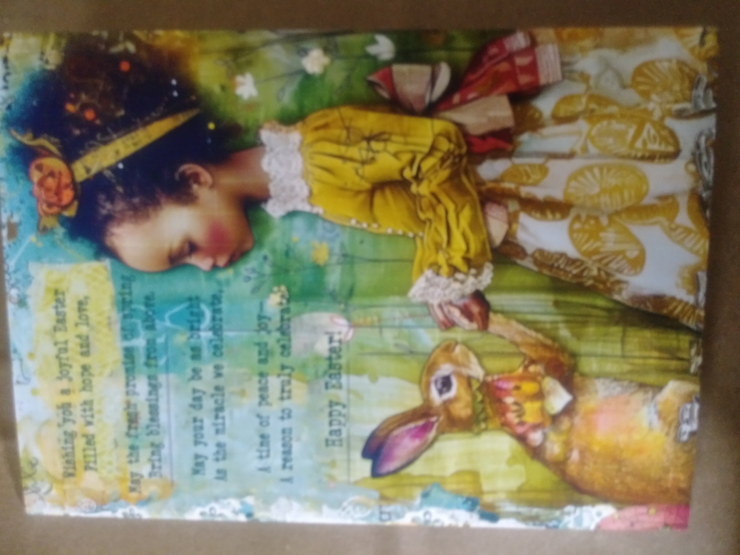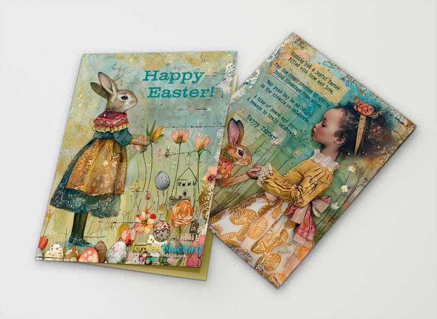 On the back, a mother bunny, her gentle gaze watching over the scene with warmth and love. The vintage theme continues with light, airy touches of lace, Easter eggs and a soft florals.