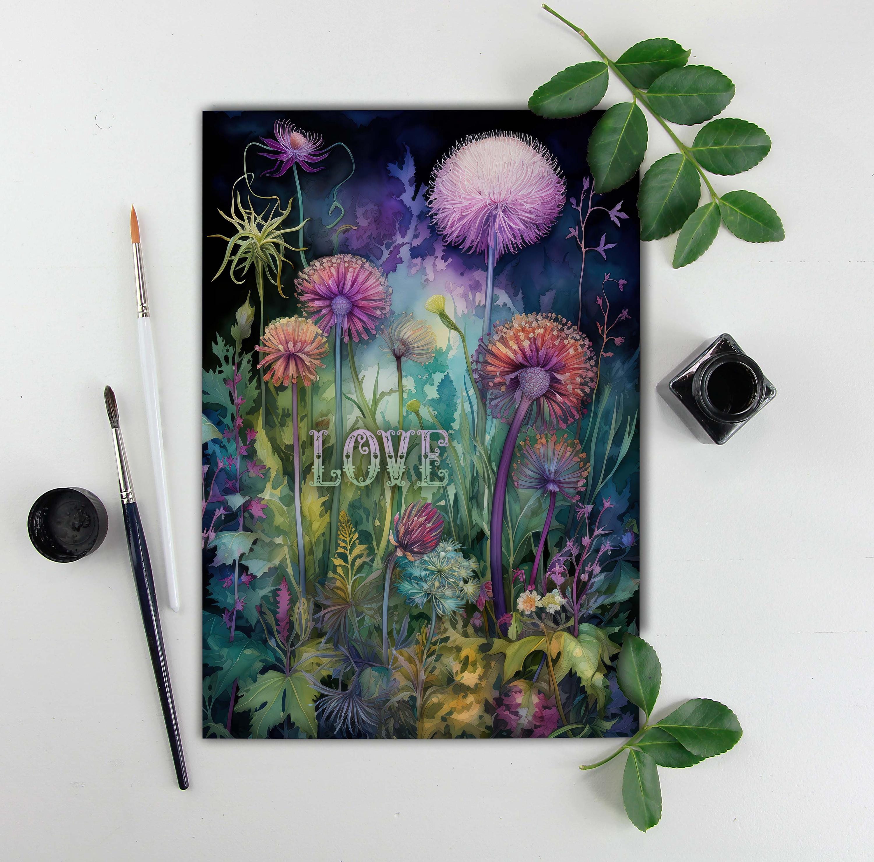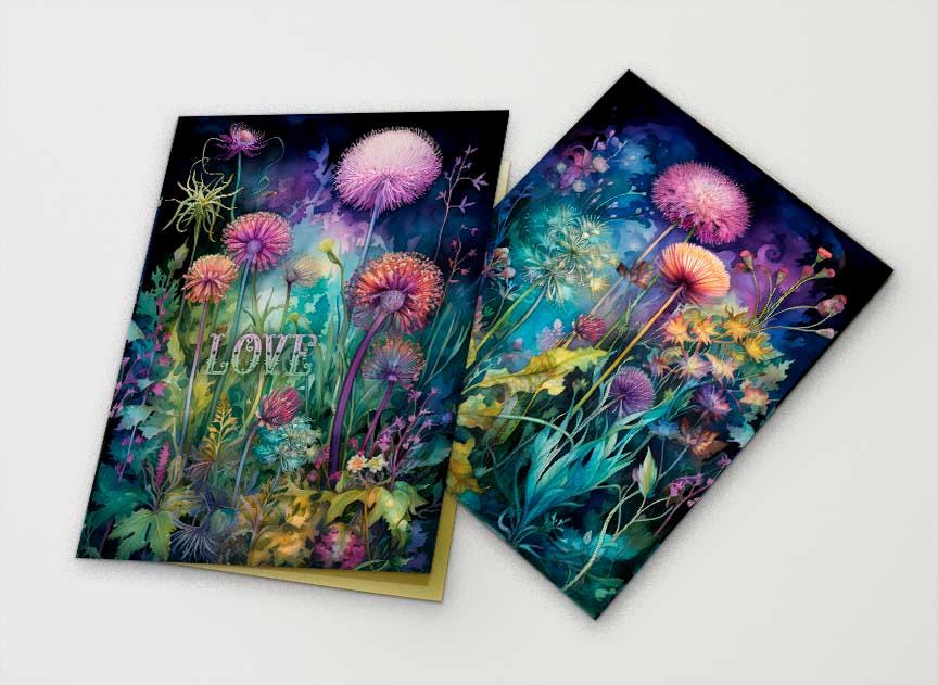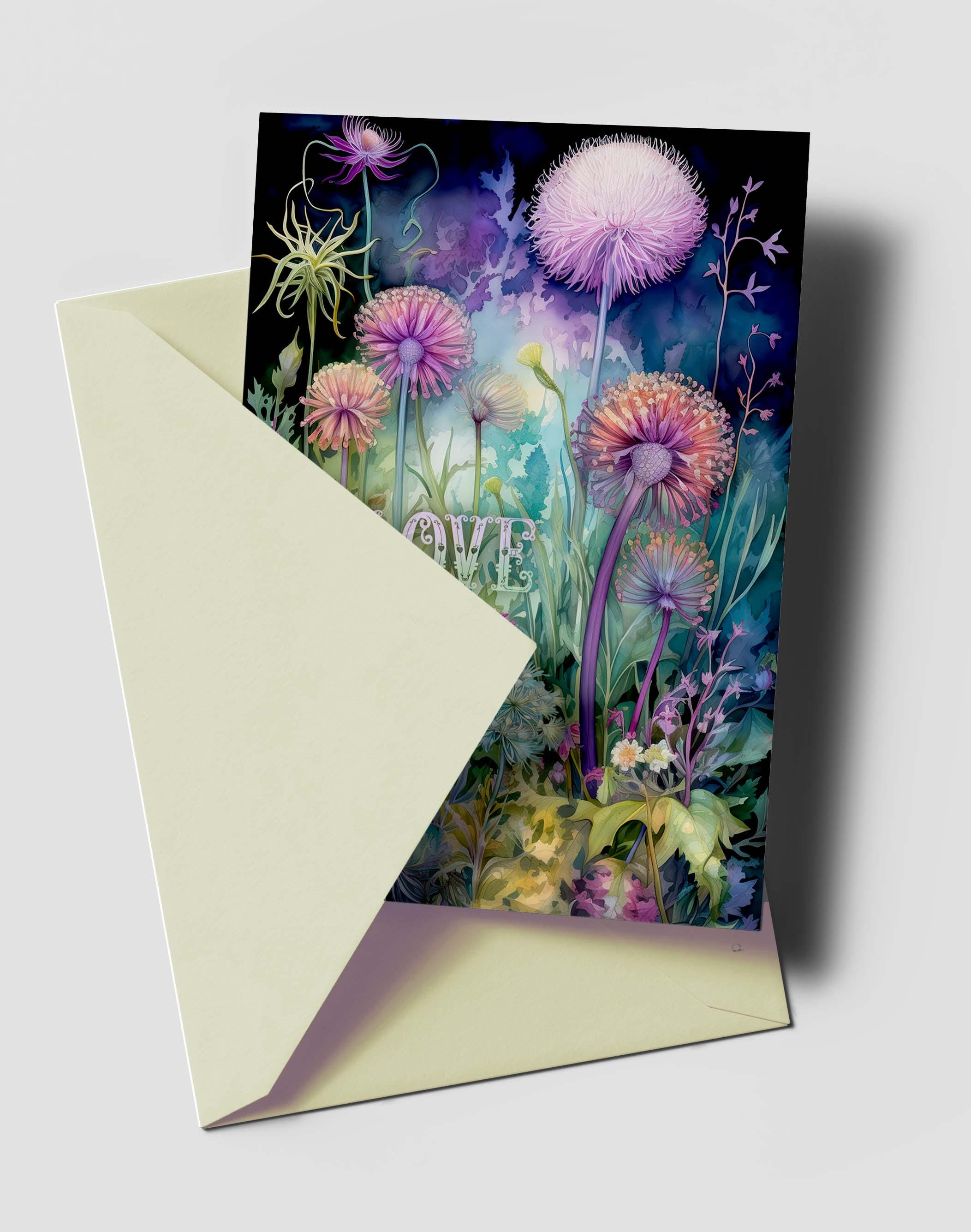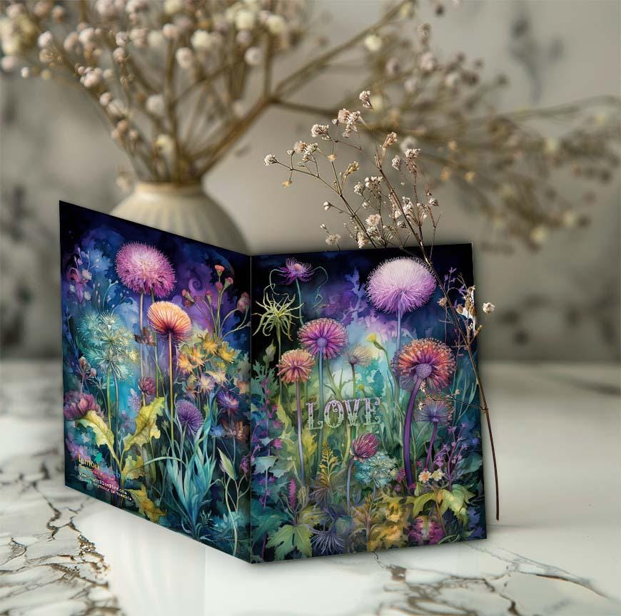 This gloss-finished greeting card showcases a striking design of purples, dramatic wild flowers. The rich black background enhances the vibrant colors, creating a bold and eye-catching contrast. The Flowers are detailed with delicate petals and playful textures in complementary hues. Perfect for Valentine, Birthday or just because.