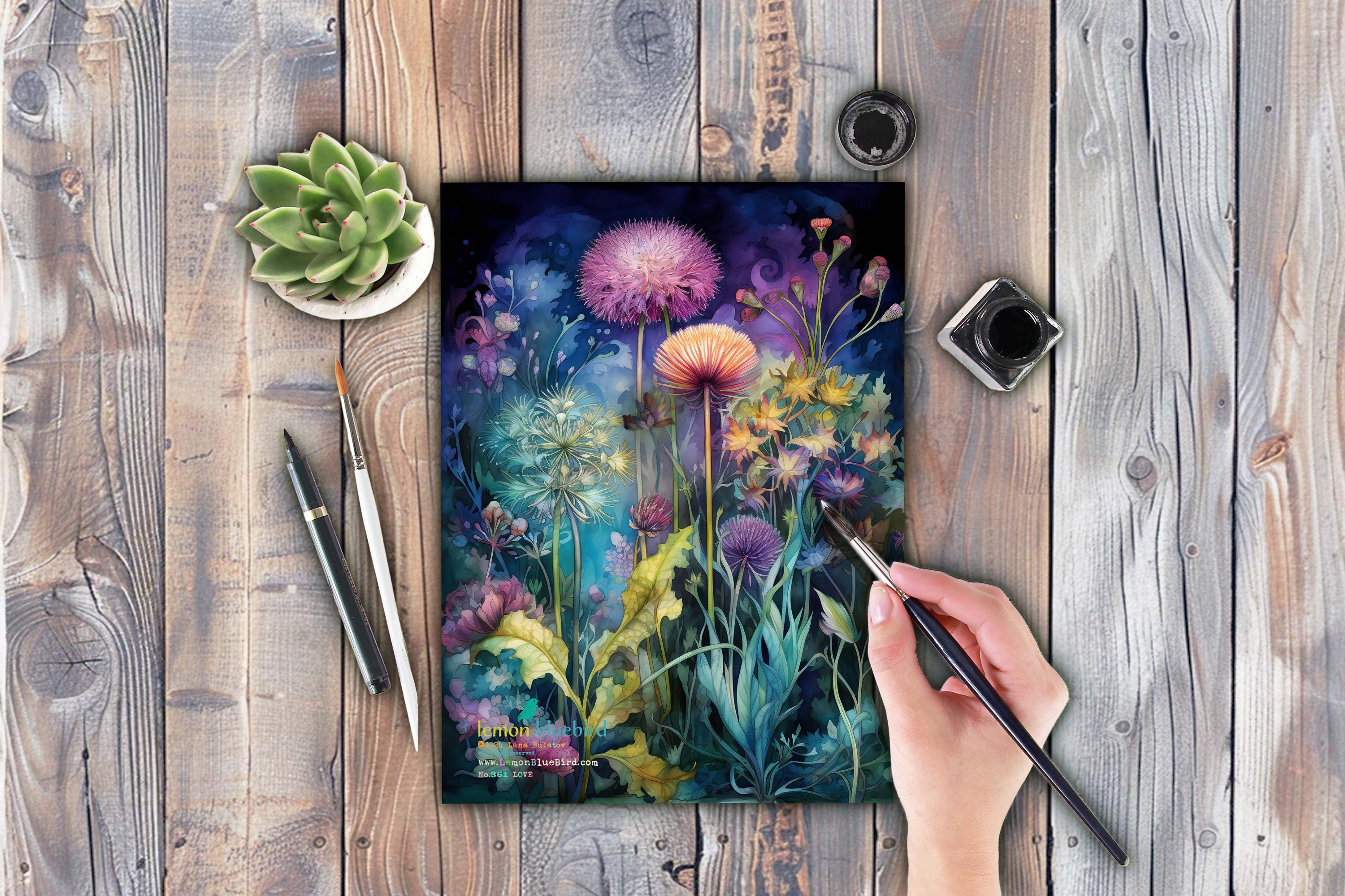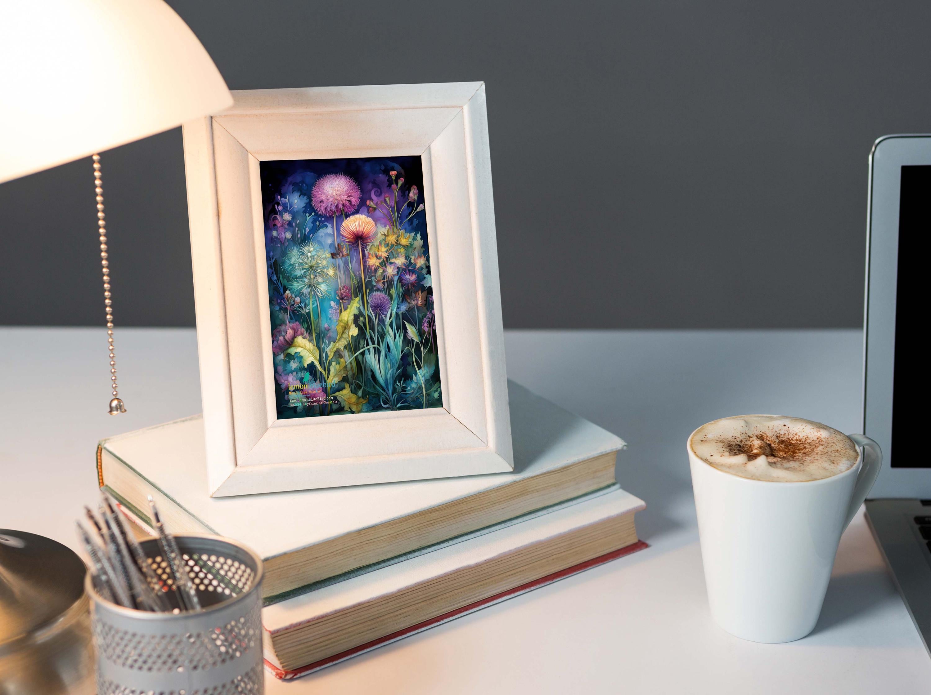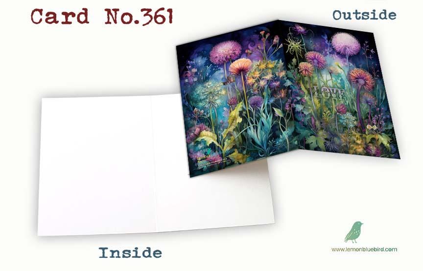 This gloss-finished greeting card showcases a striking design of purples, dramatic wild flowers. The rich black background enhances the vibrant colors, creating a bold and eye-catching contrast. The Flowers are detailed with delicate petals and playful textures in complementary hues. Perfect for Valentine, Birthday or just because.