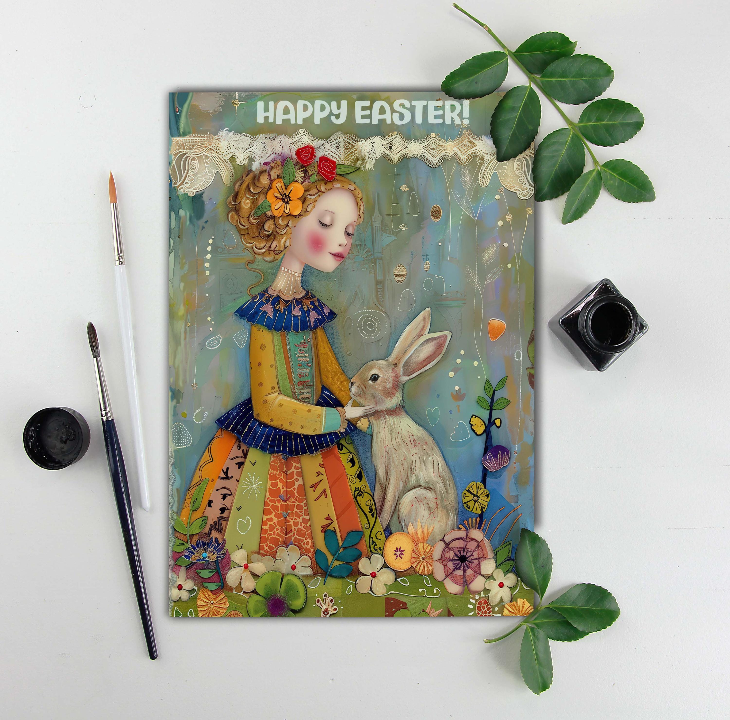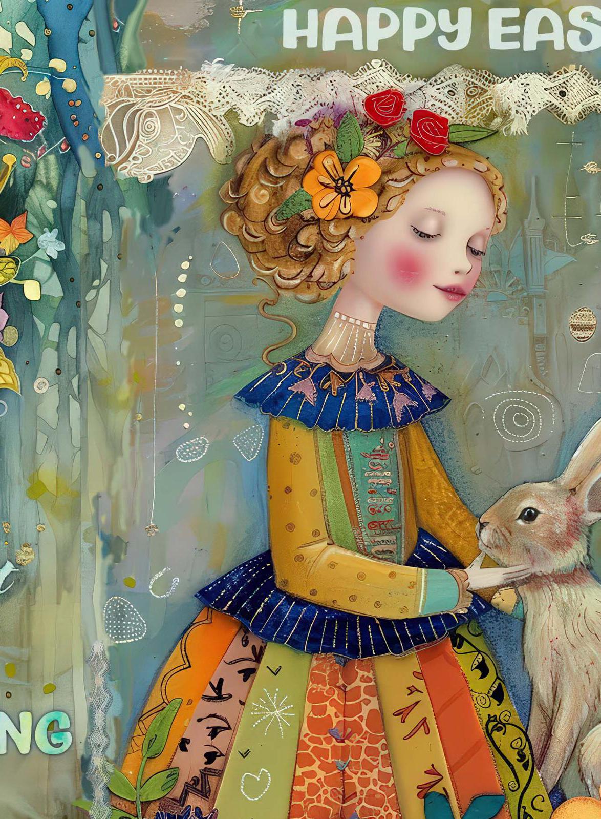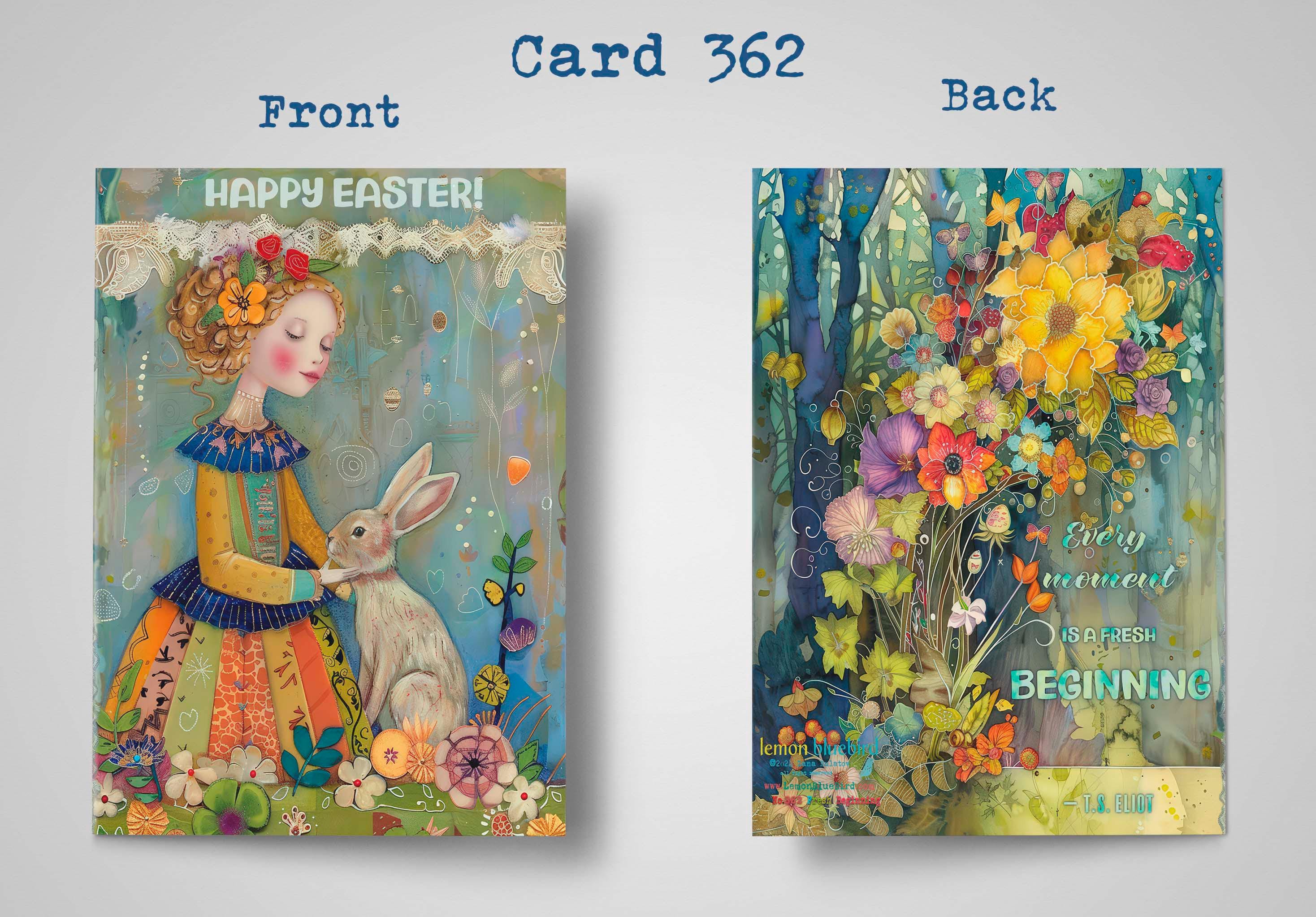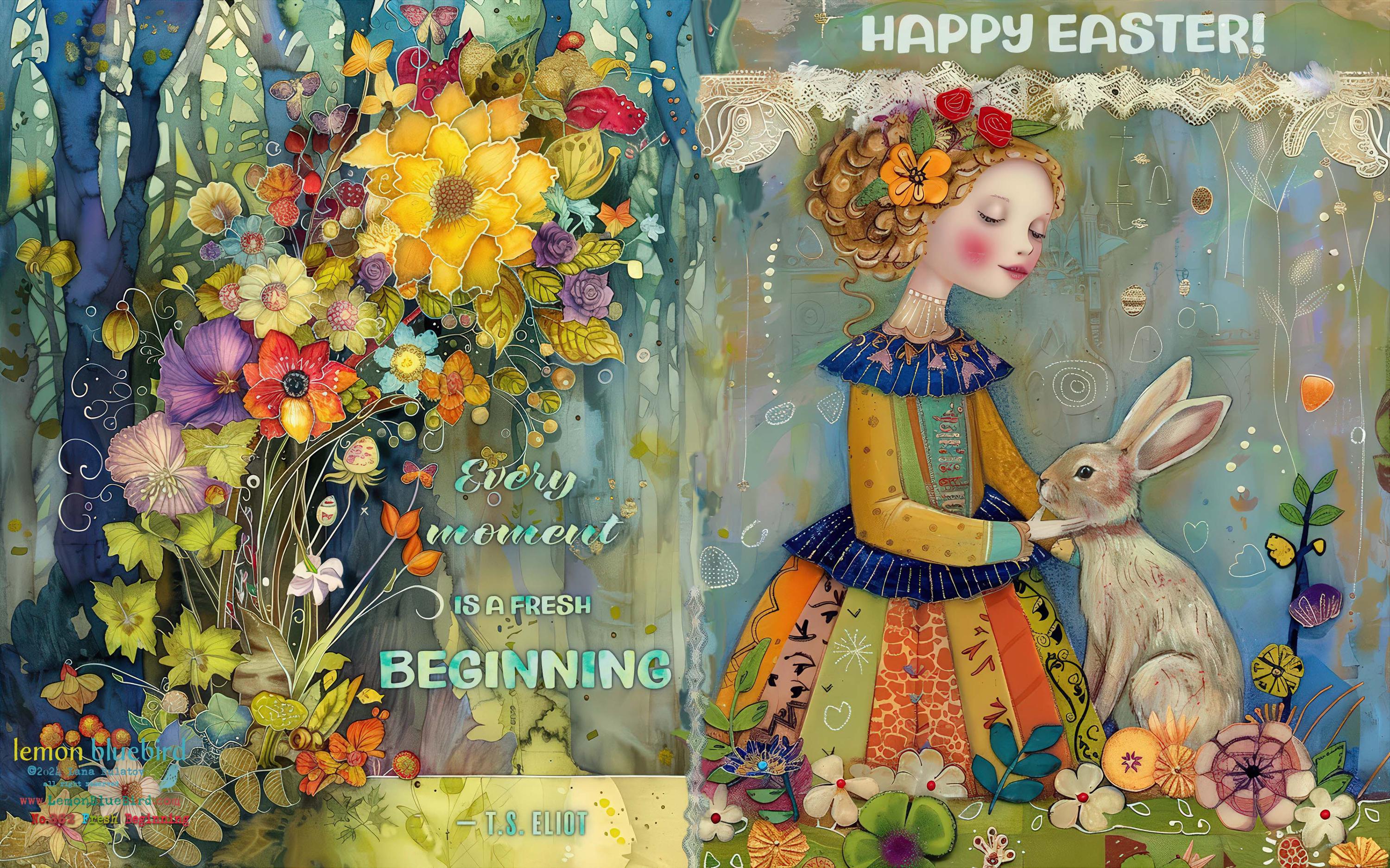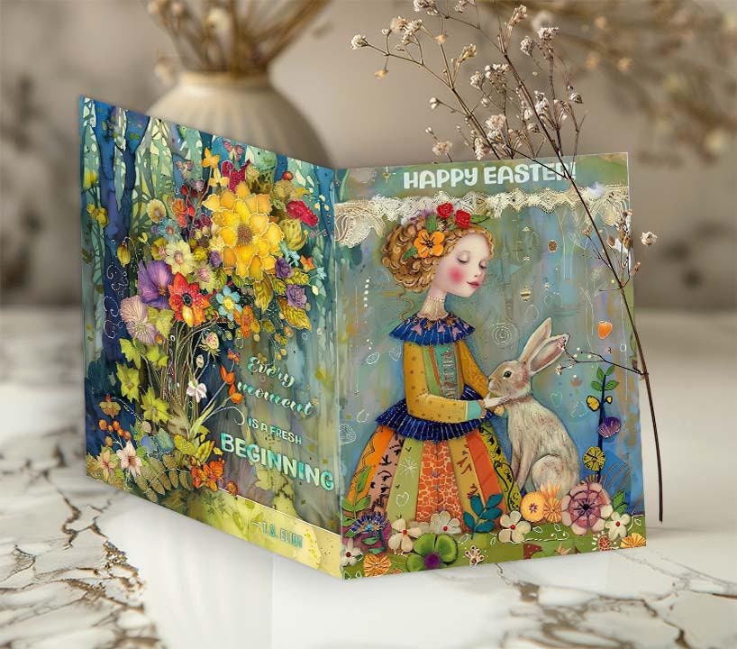 ๐ทCelebrate Easter with this vibrant and whimsical Easter card, A Renaissance-style girl stands gracefully in a flowing, vividly colorful dress, painted in a dynamic watercolor style. She looks at a bunny. Around her, vivid flowers in fiery oranges, electric pinks, and royal purples. The background is a whimsical spring scene with a quote - ๐ธ "Every moment is a fresh beginning." โ T.S. Eliot ๐ธ This design features a joyful blend of pastel colors, intricate patterns, and charming Easter-themed details that capture the warmth and spirit of the spring season.๐ท