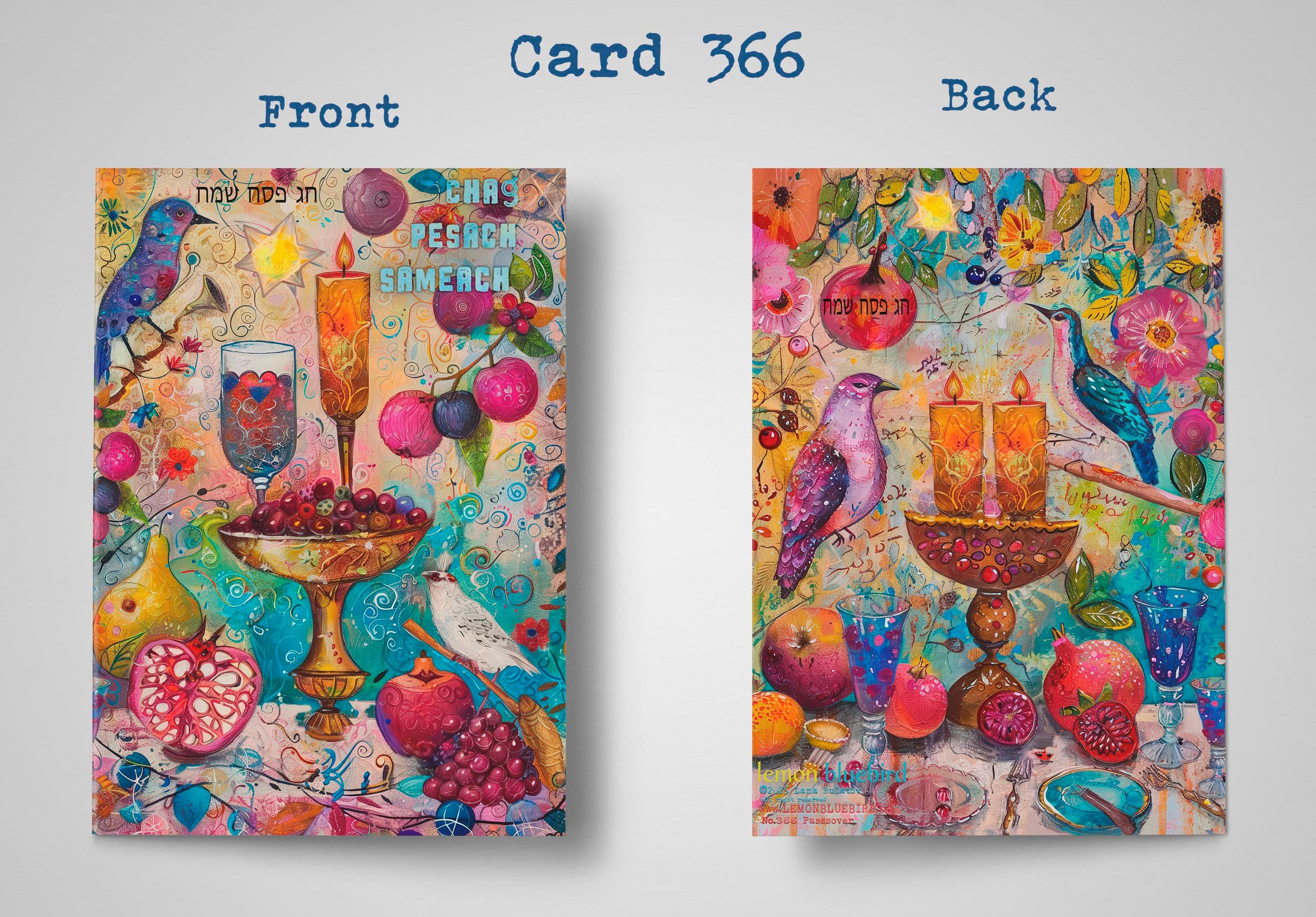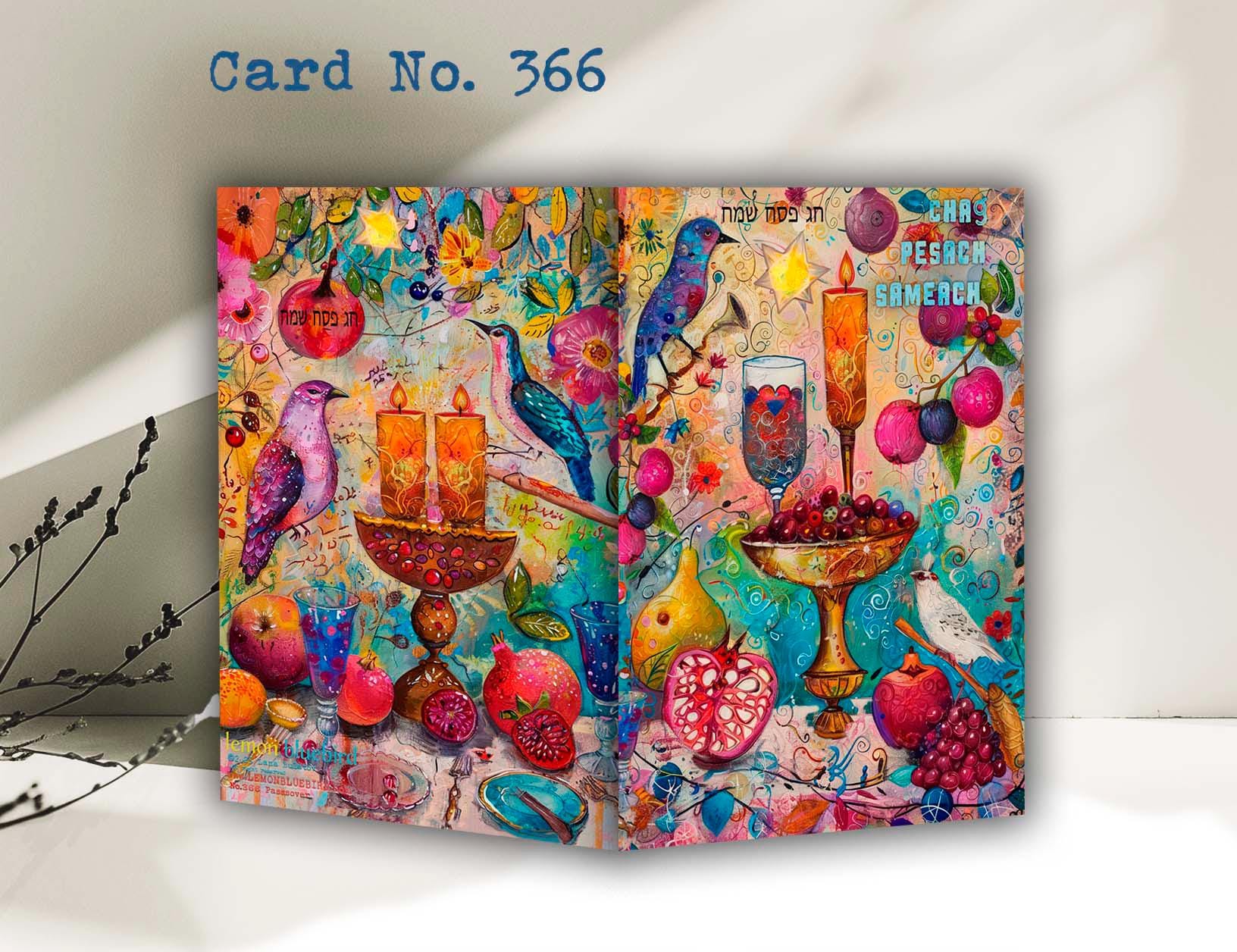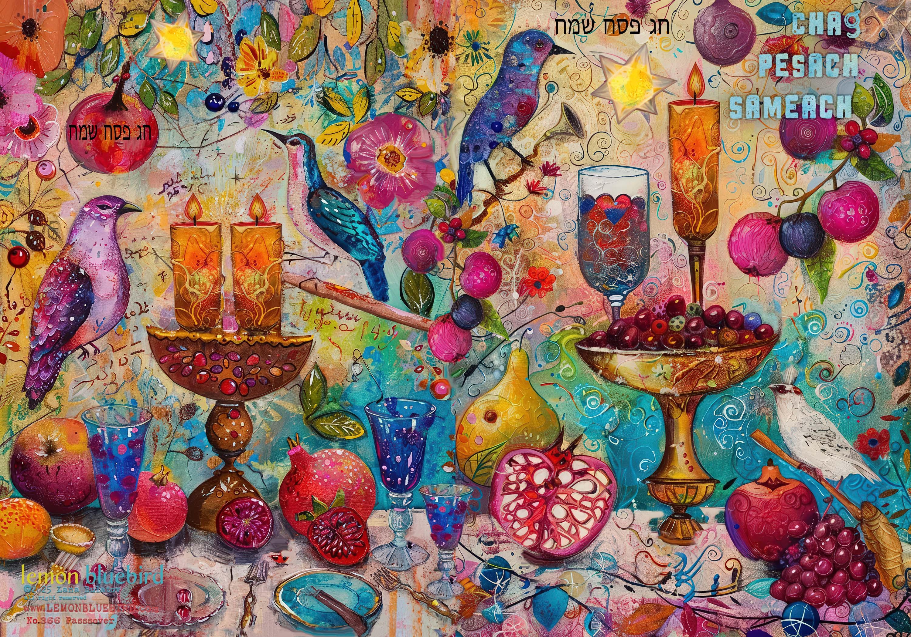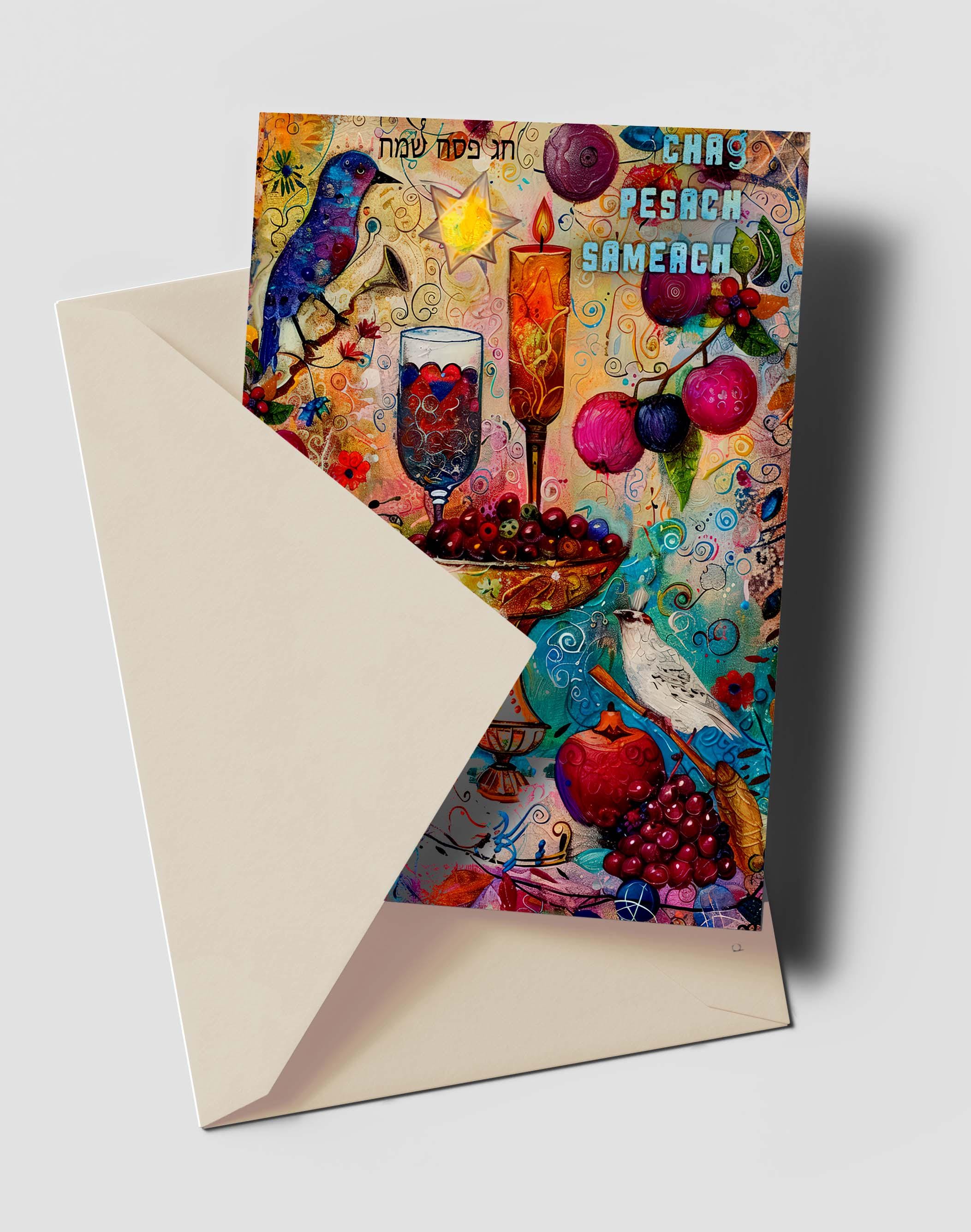Celebrate the joy of Passover with this vibrant and festive holiday card, perfect for sharing warm wishes with loved ones. Beautifully illustrated, this card captures the heart of the holiday. Whimsical birds adds a playful touch to the scene, symbolizing freedom and new beginnings.