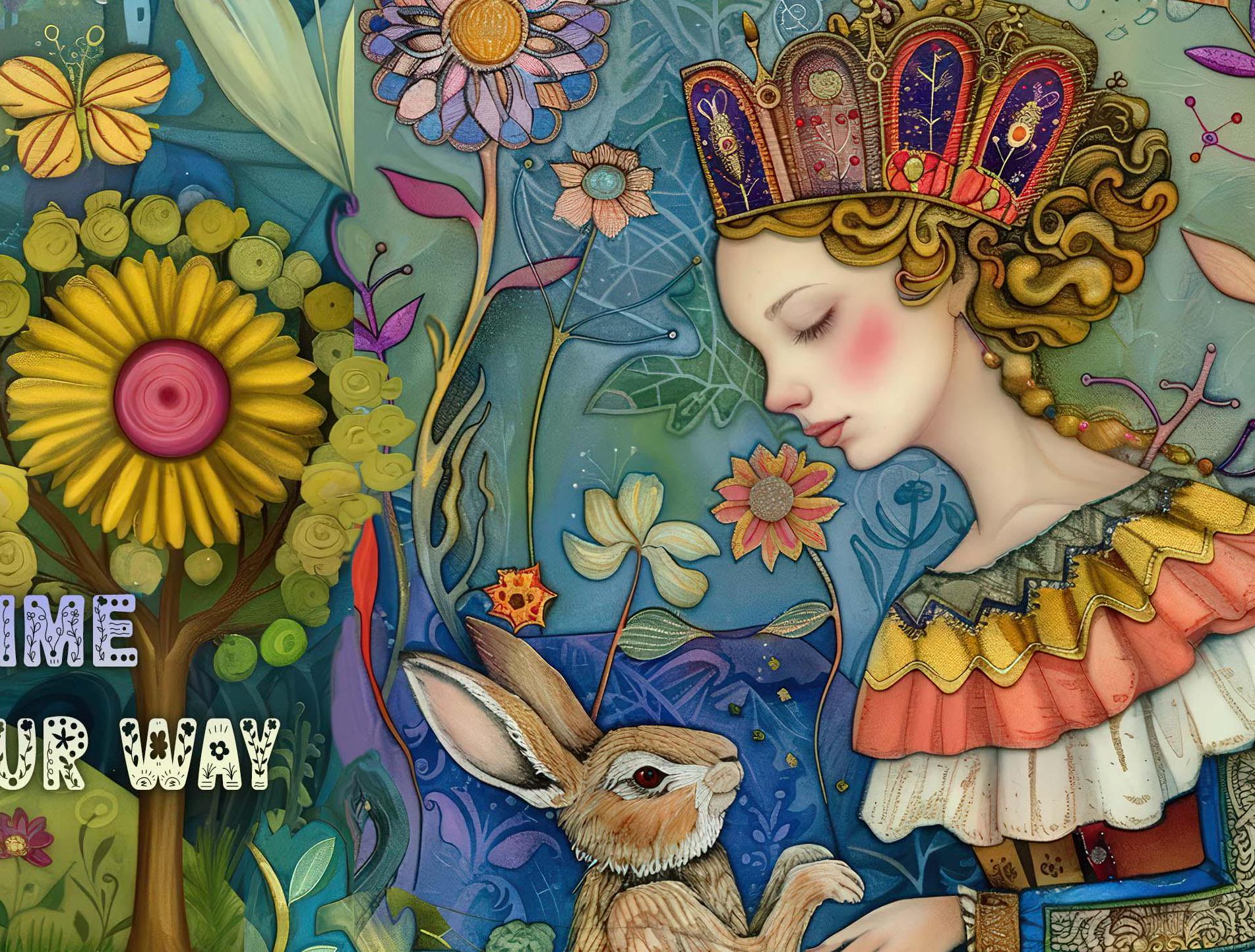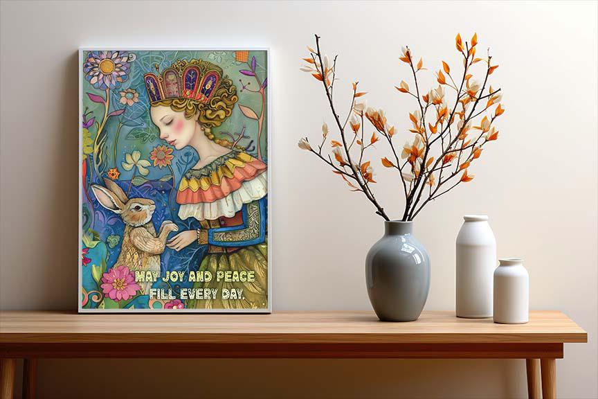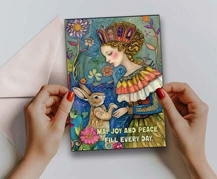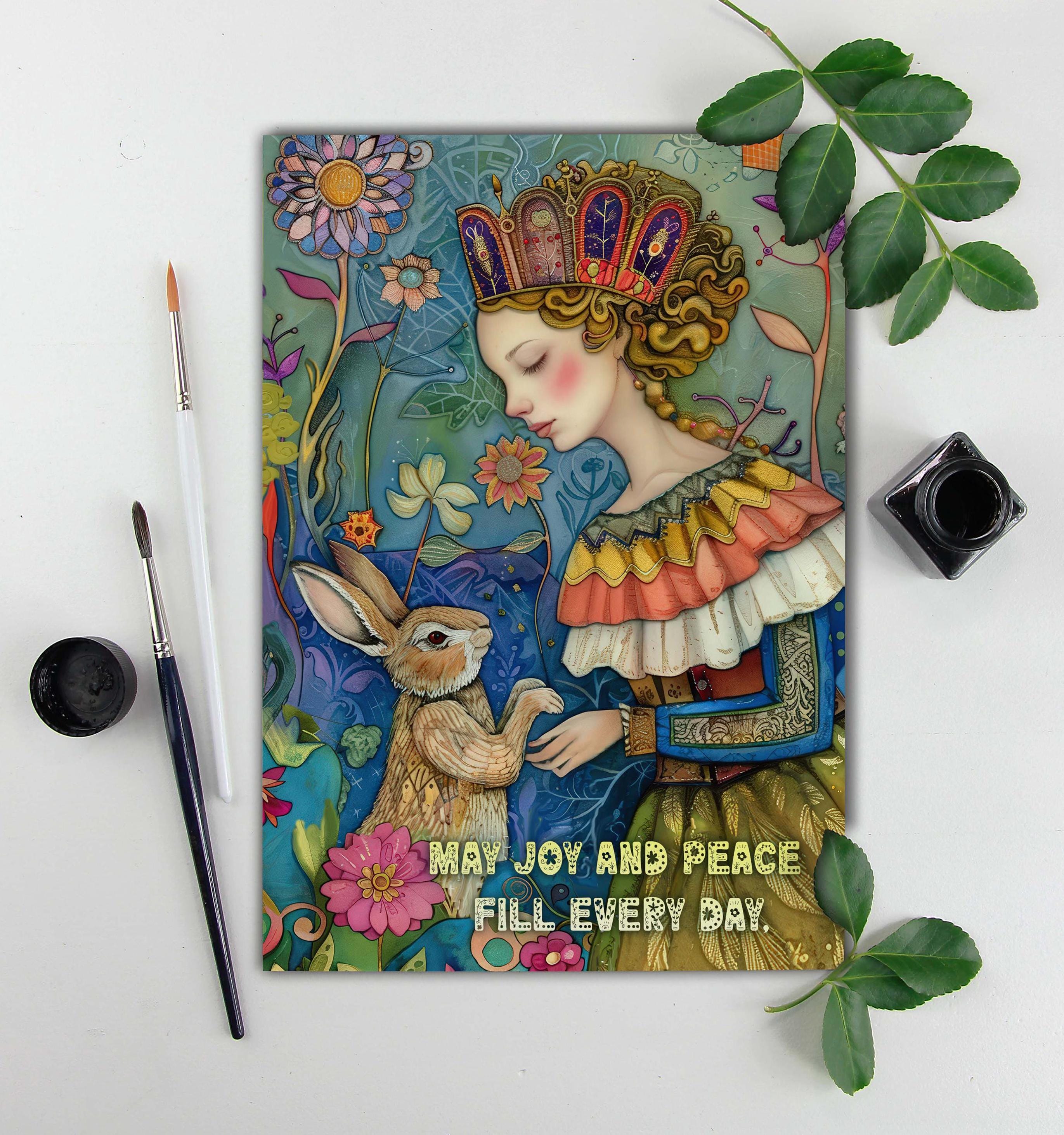 This Easter card is full of bright, cheerful energy, inspired by folk art with bold colors and lively details. On the front, a young girl and her bunny stand close, looking at each other with warmth and curiosity. The background is a rich, vibrant teal, decorated with playful patterns and textures.