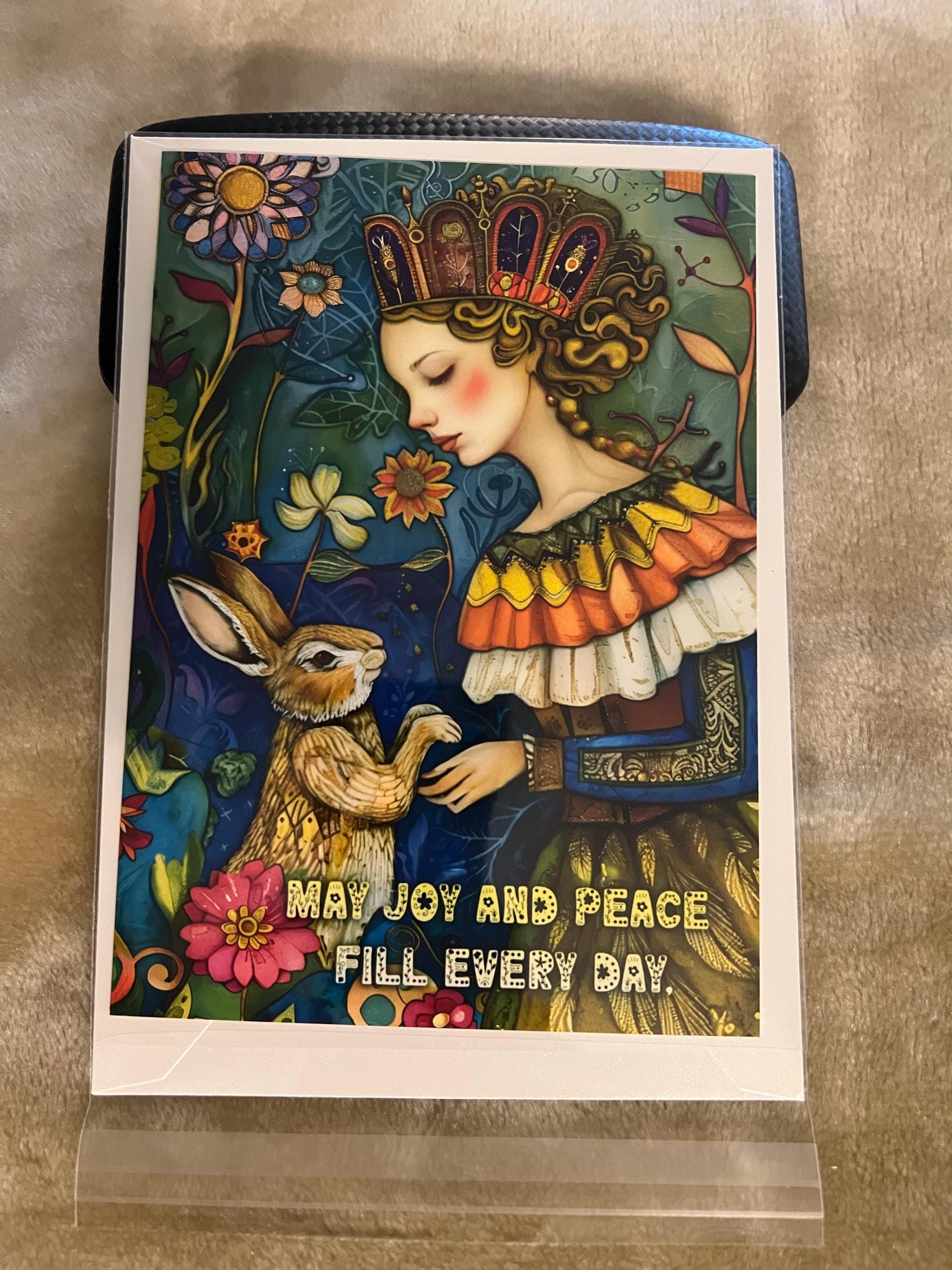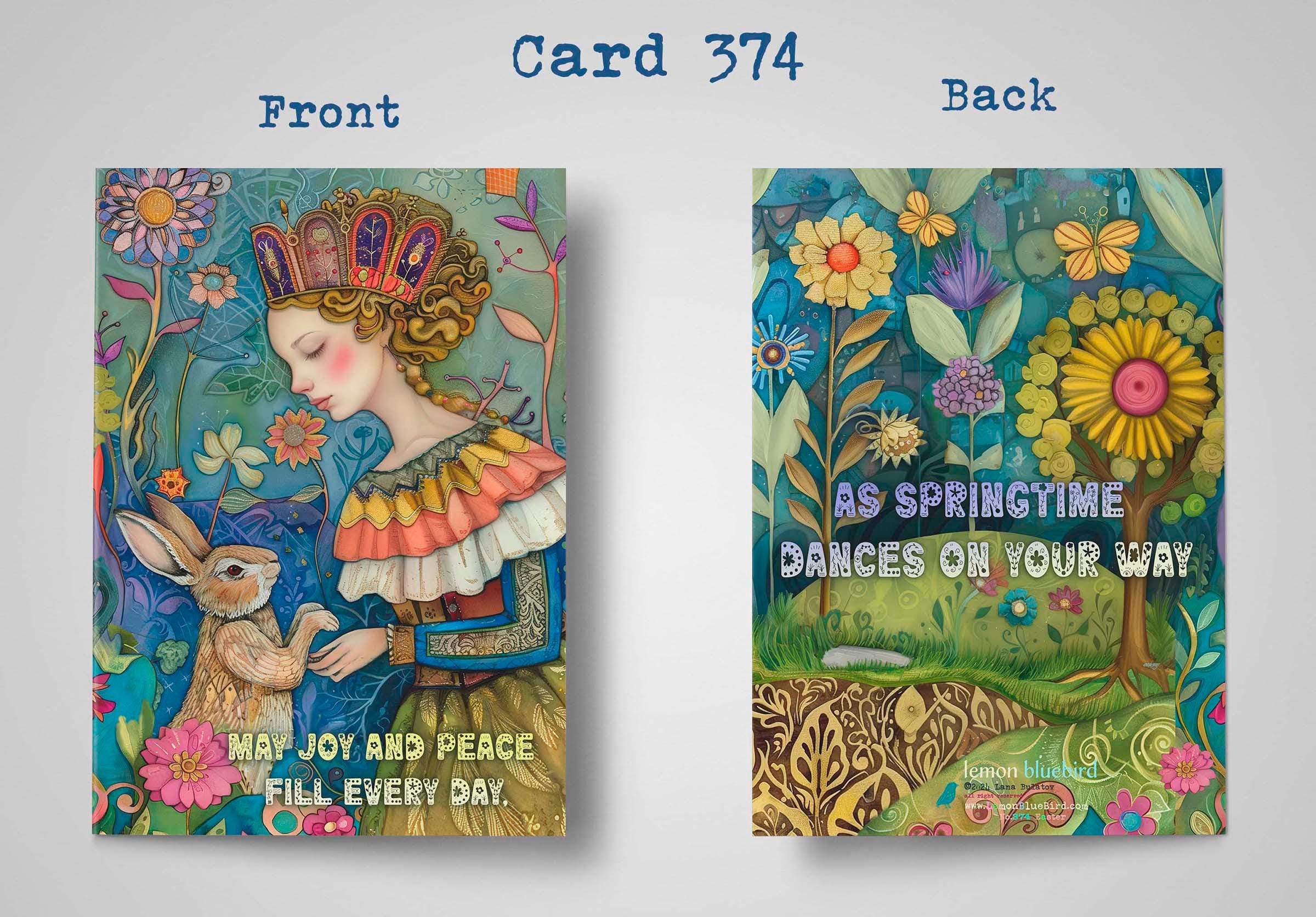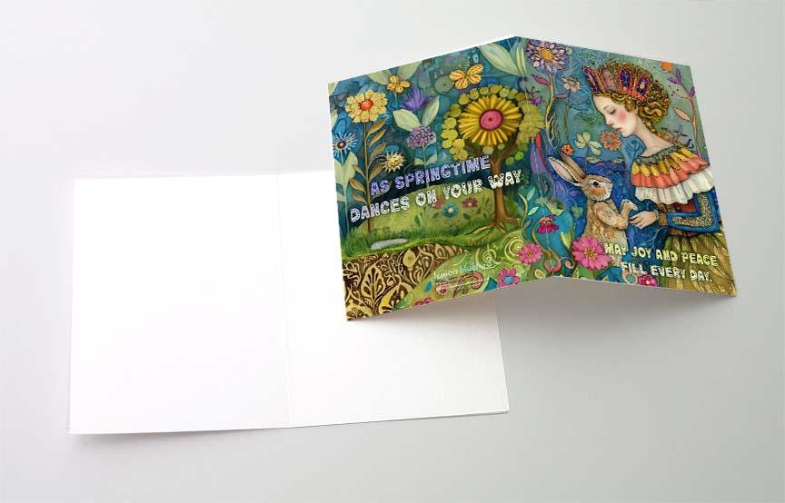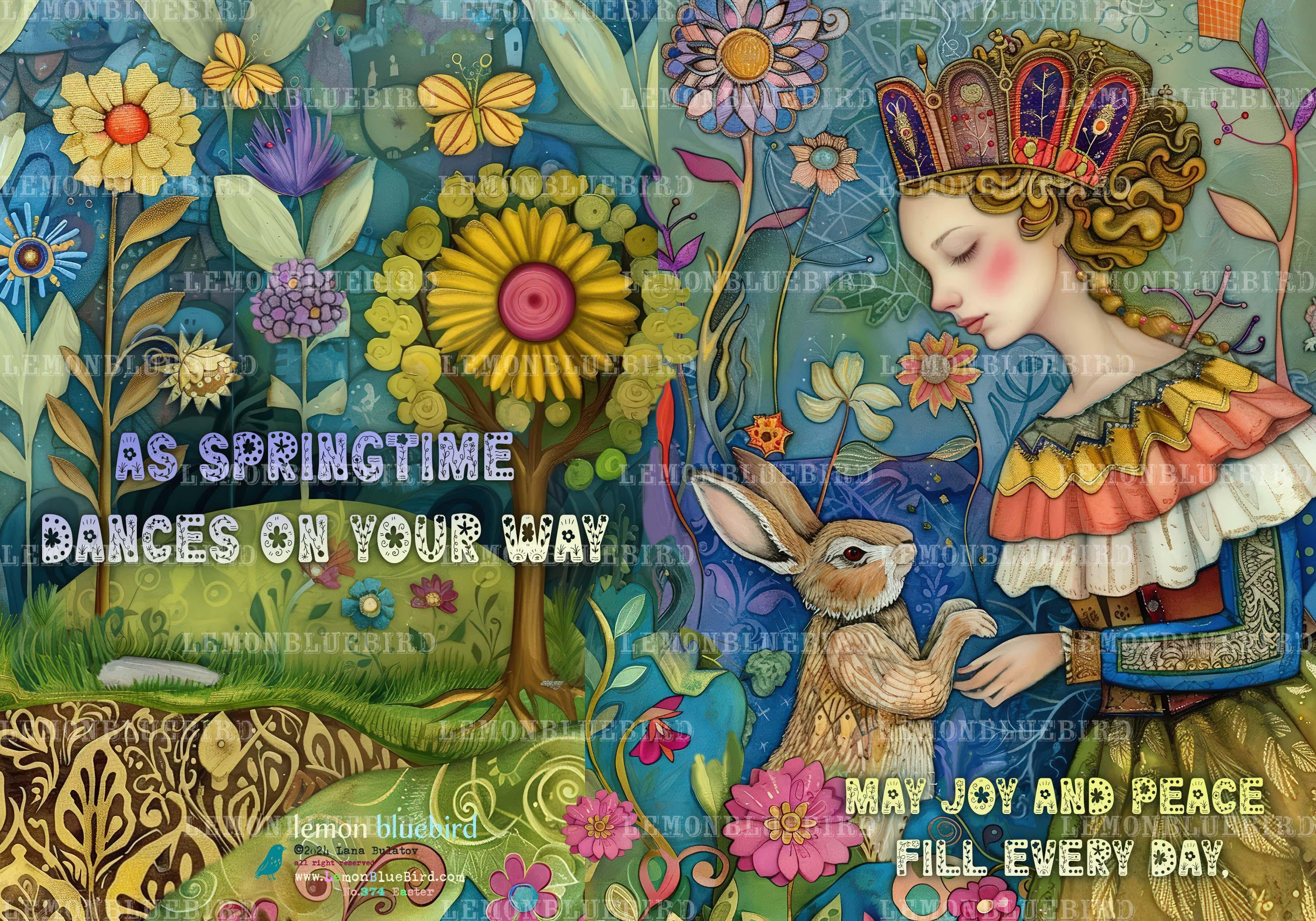 A heartfelt quote reads, "May joy and peace fill every day as springtime dances on your way," arranged in bold, artistic font. Turn the card over, and youโll find a joyful Easter bunny surrounded by blooming flowers.The design is full of warmth and happiness, perfect for sending a cheerful Easter greeting.๐ท