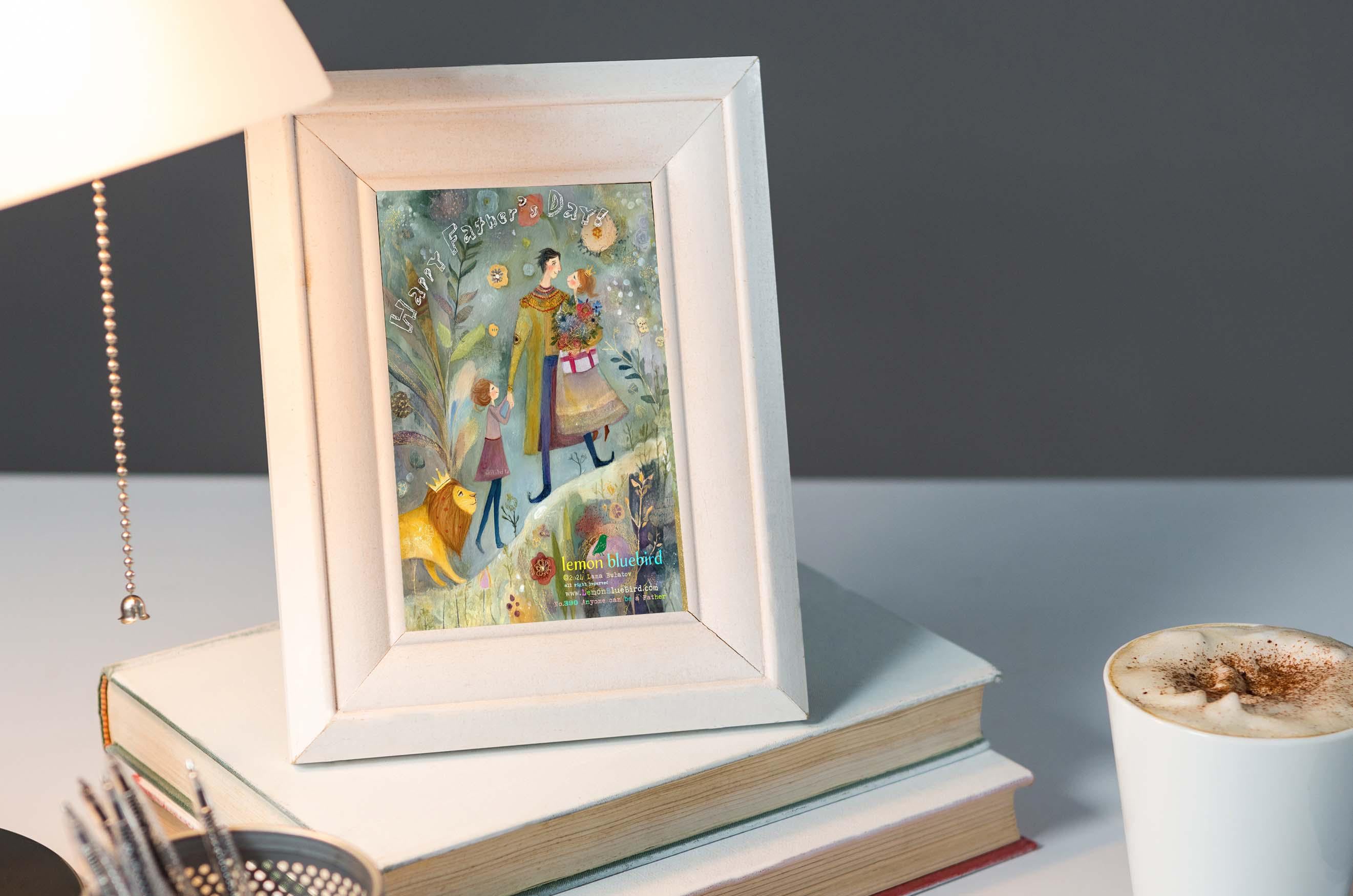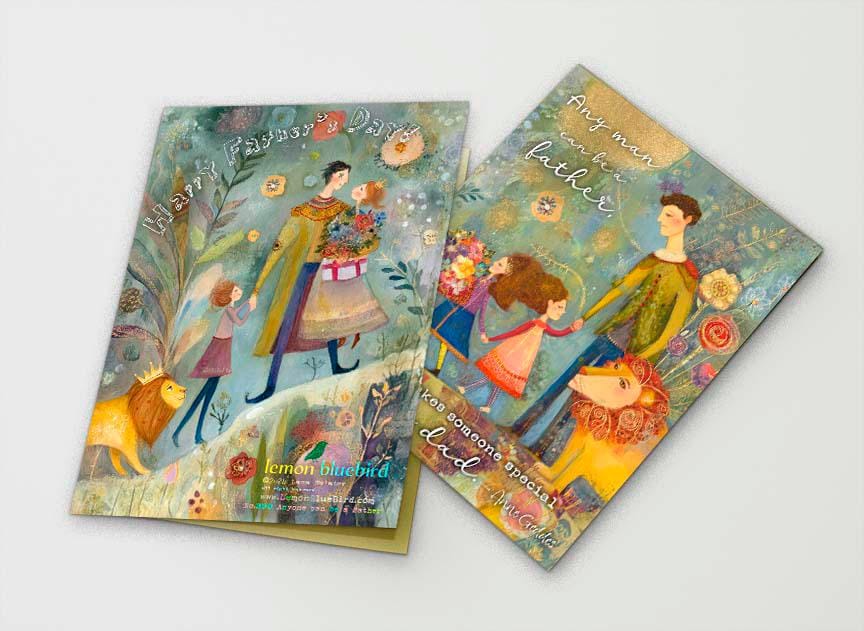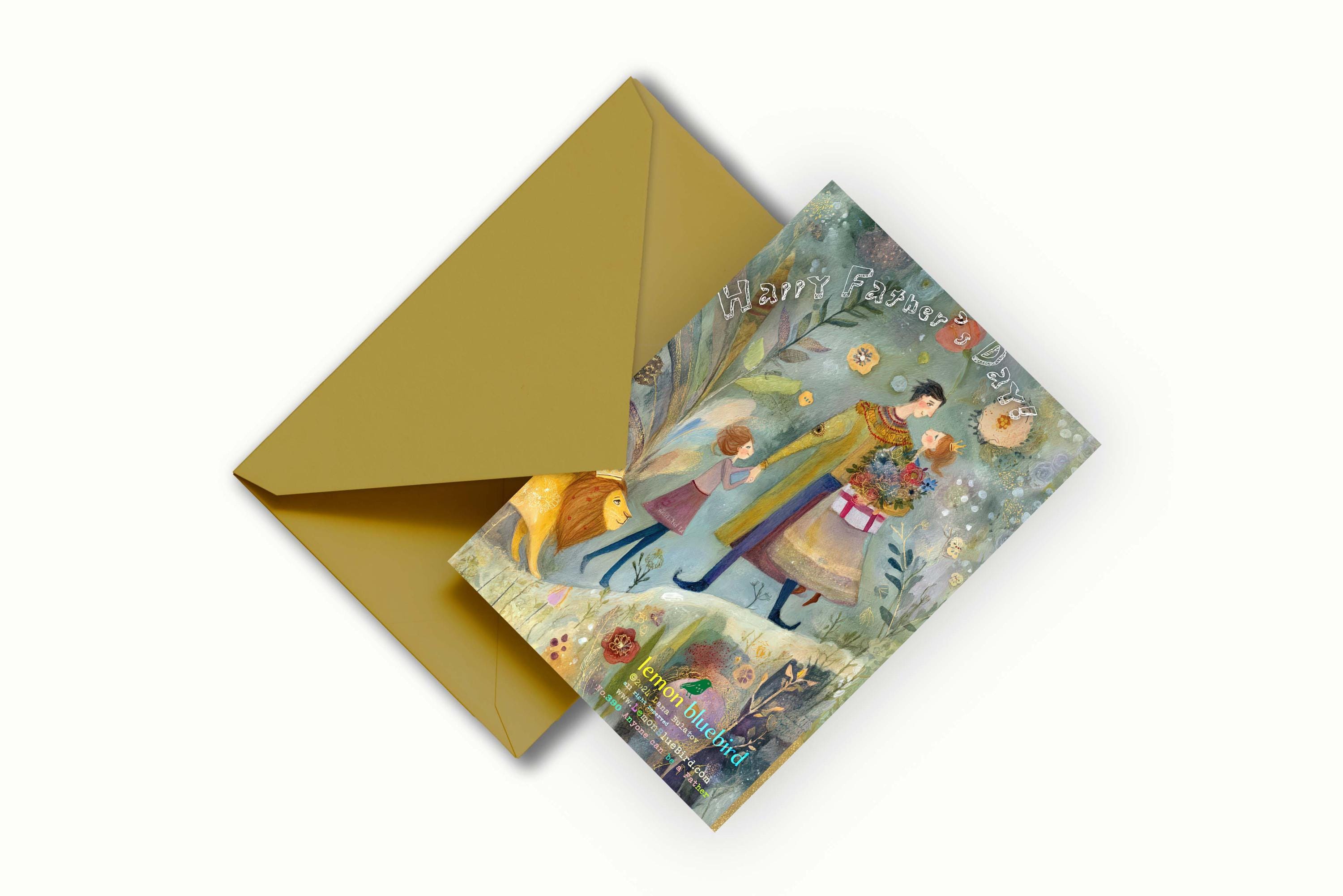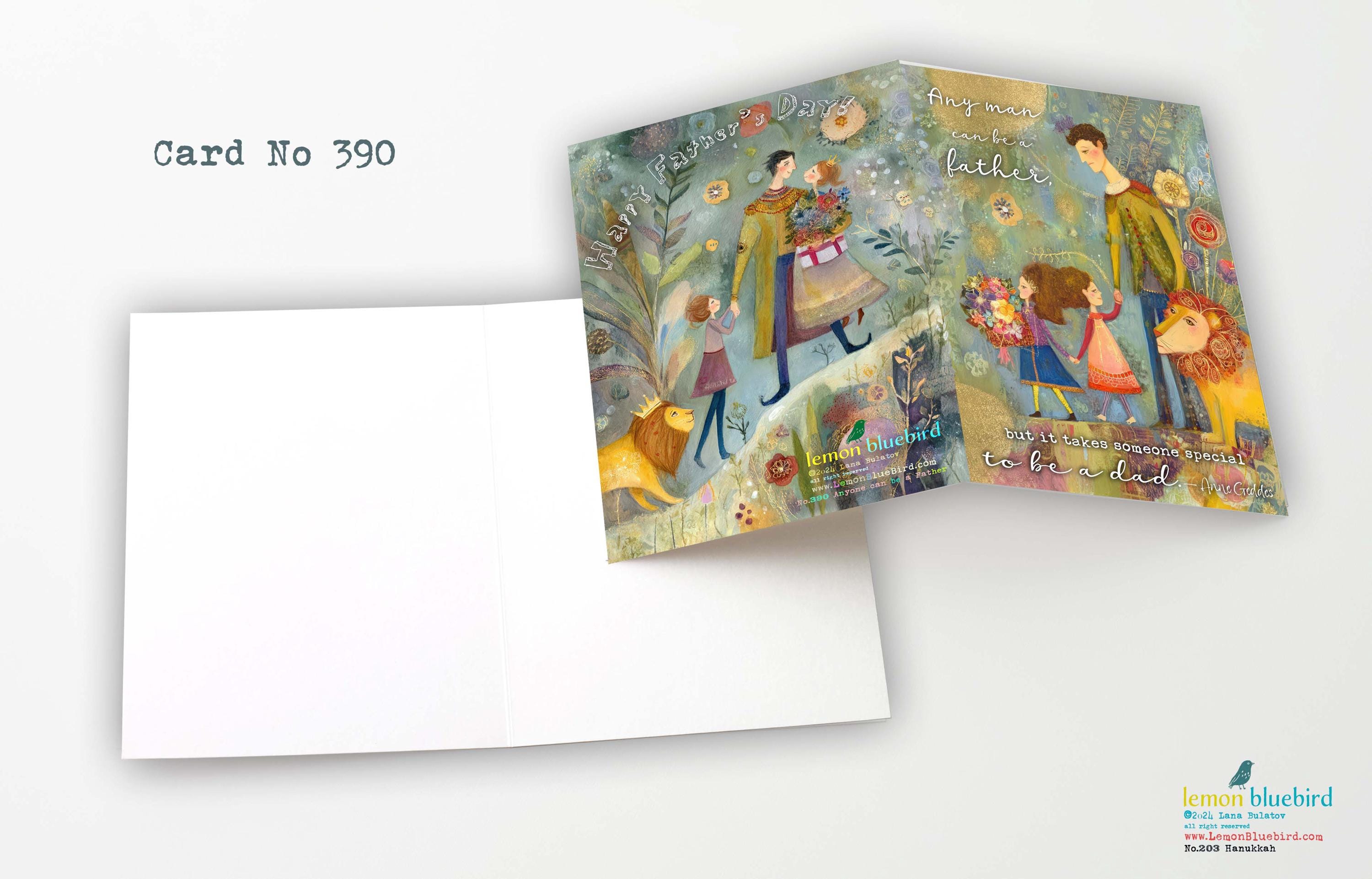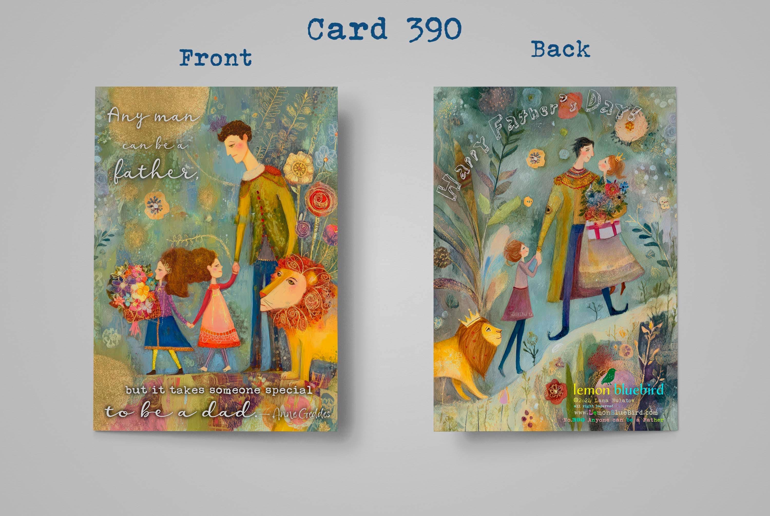 Celebrate the magic of fatherhood with this beautiful and whimsical Fatherโs Day card featuring a heartwarming illustration of a loving father, his two daughters, and their majestic lion companion. With cheerful, playful colors and rich textures, this design captures a sense of imagination and tenderness that makes it perfect for dads who are truly one of a kind.