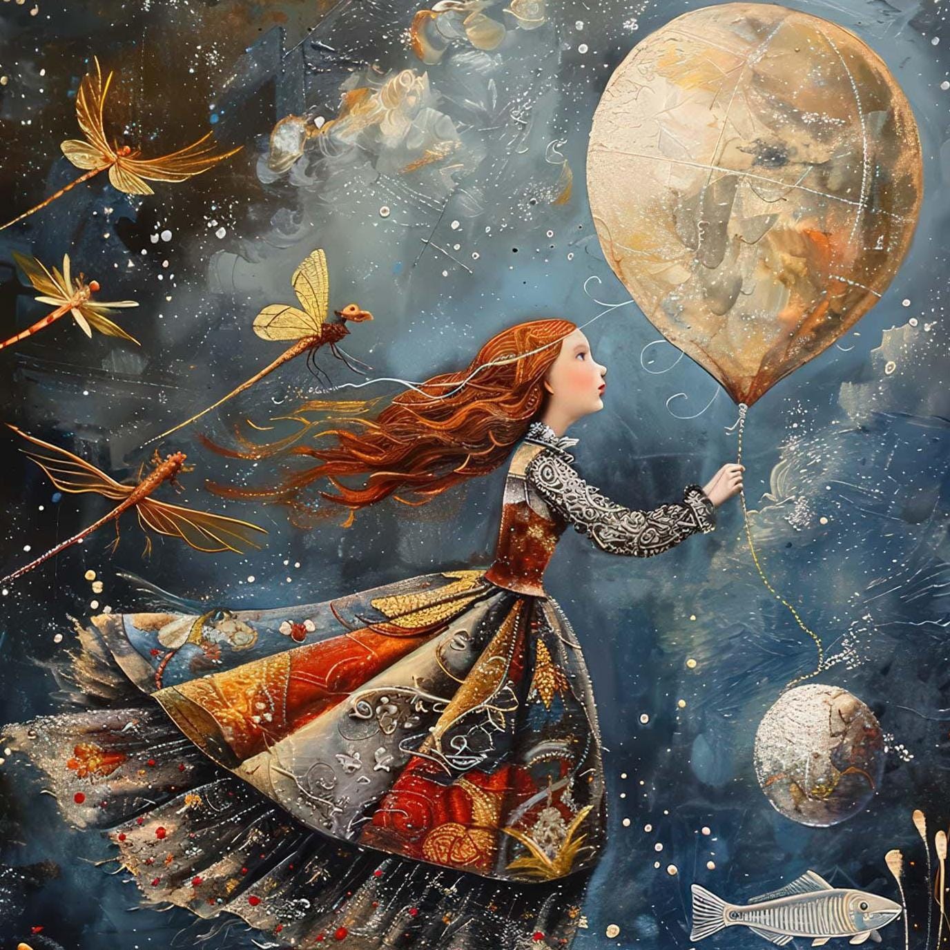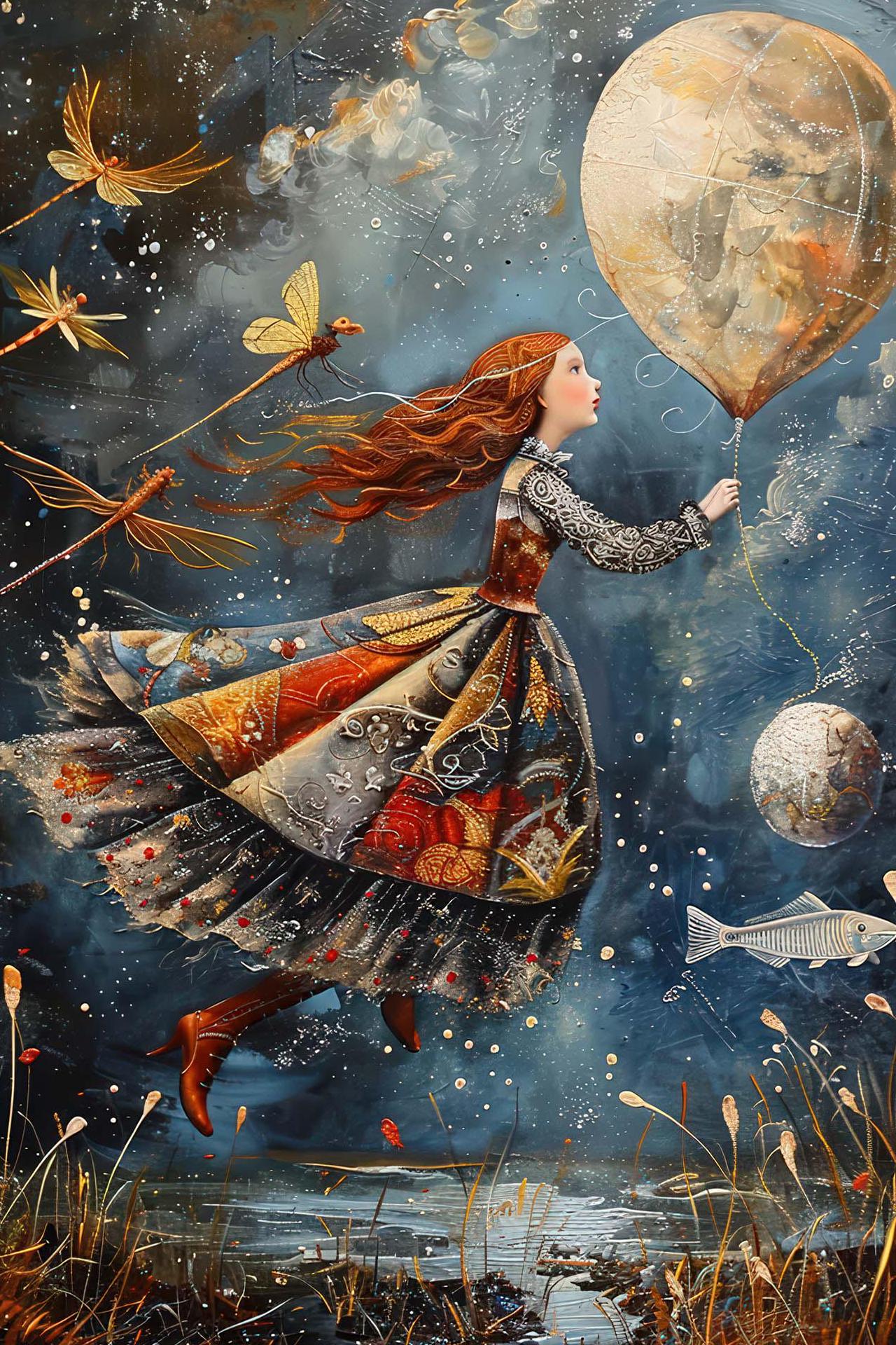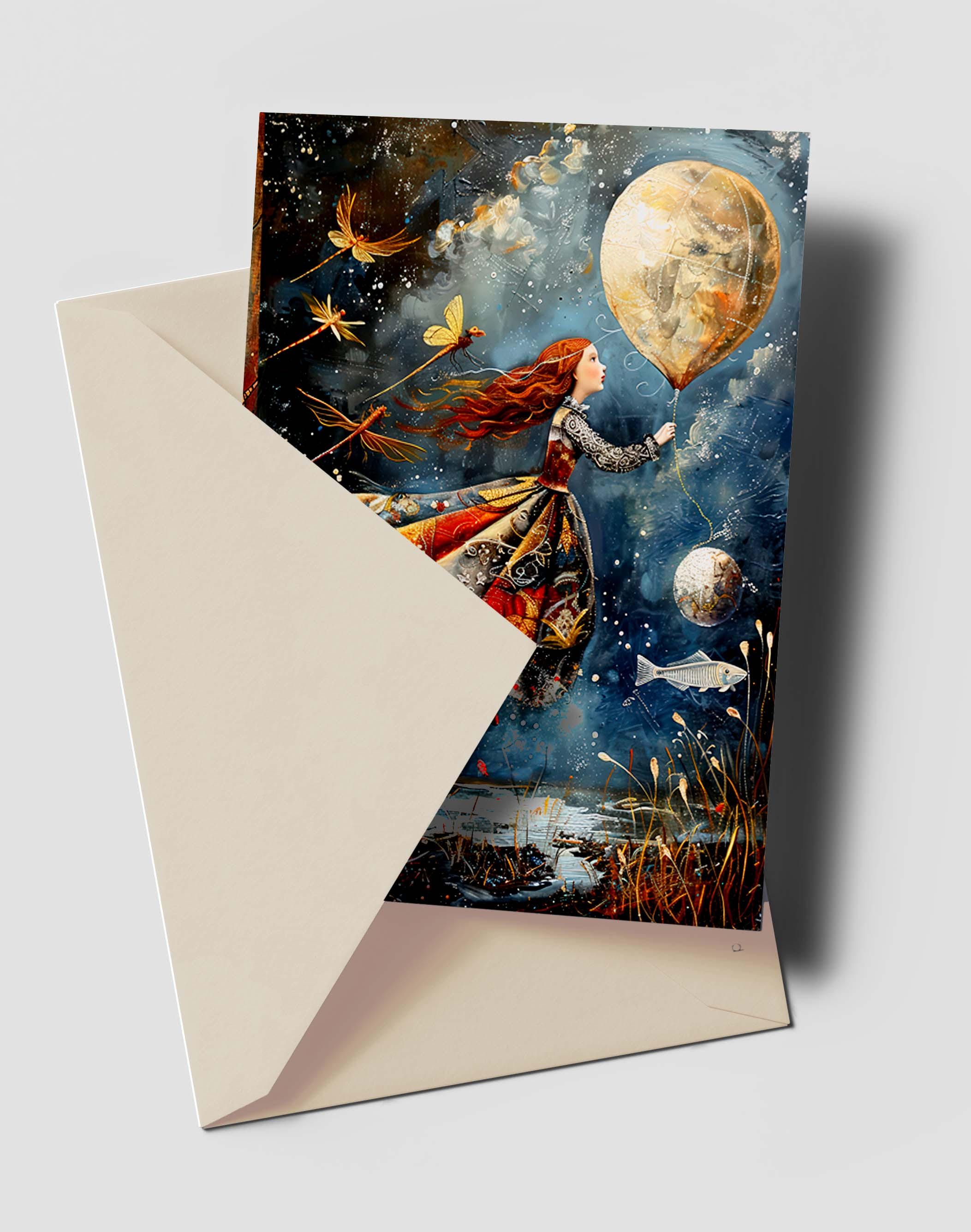 ๐This enchanting greeting card features a magical artwork in deep blue jewel tones. The richly textured illustration portrays a dreamy red-haired girl floating through the air, holding onto the string of her balloon. She is dressed in a Renaissance-style dress.