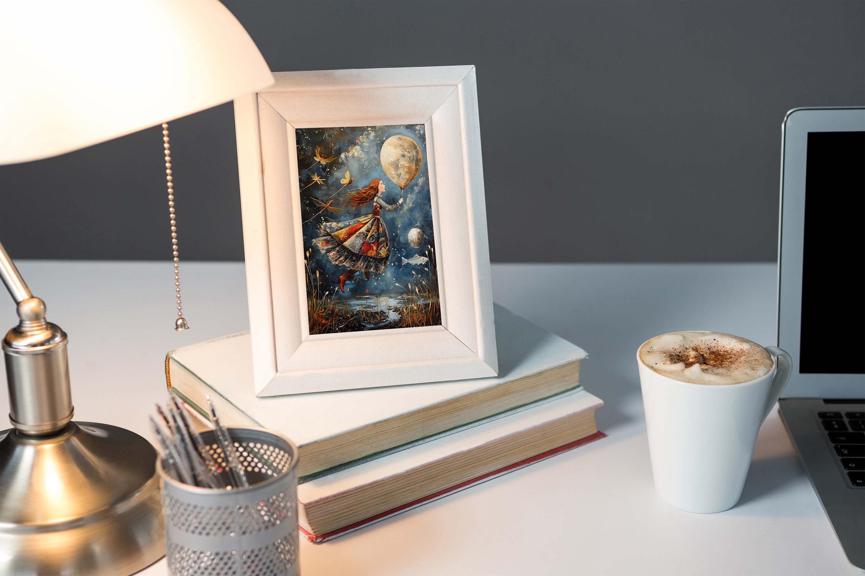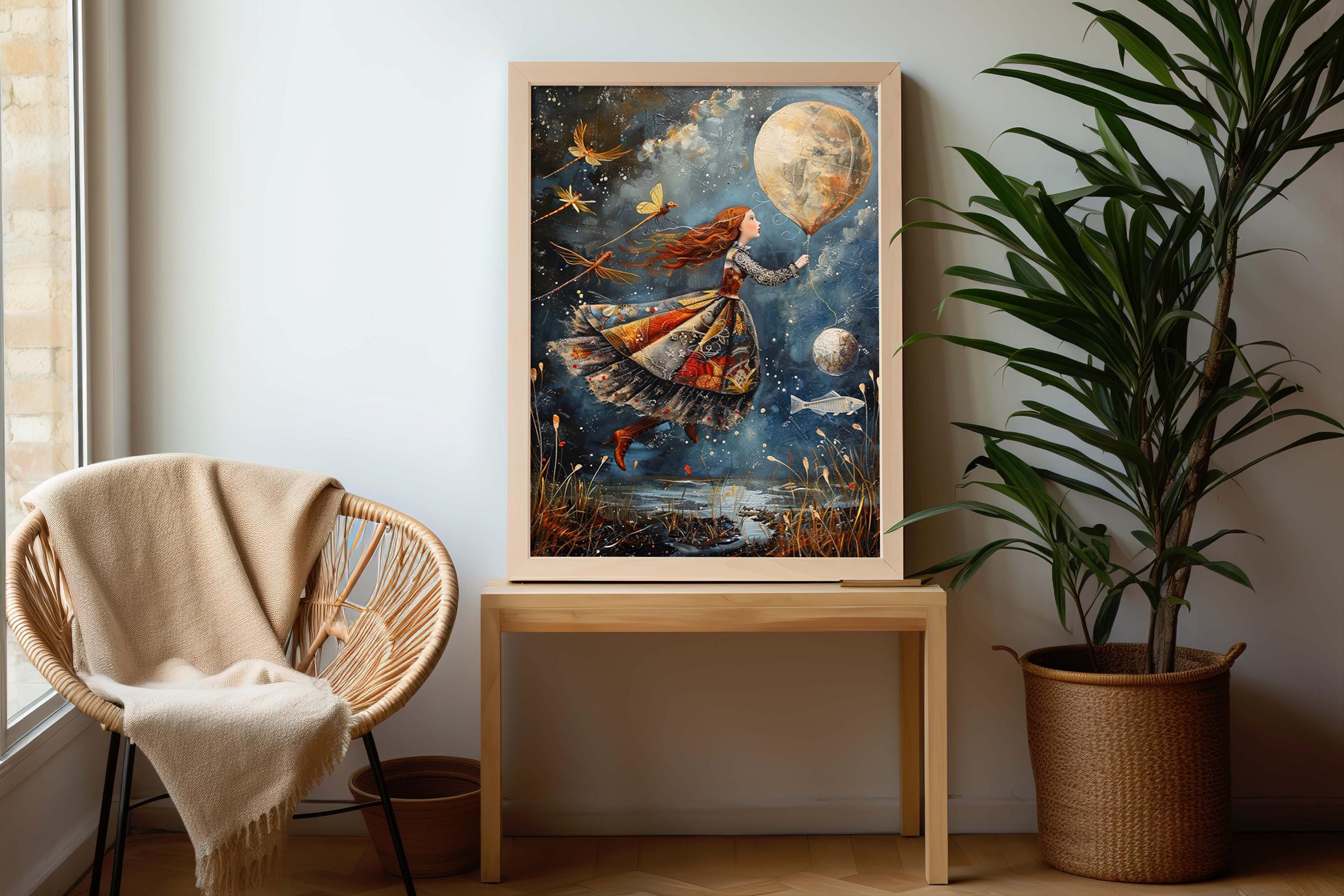Let your imagination soar with this enchanting "Just Because" greeting card featuring a whimsical girl floating effortlessly through the sky, clutching her balloon. Surrounded by magical creatures and dreamy night skies, she dances among clouds and stars in a swirl of brilliant blues, deep jewel tones, and radiant red accents.