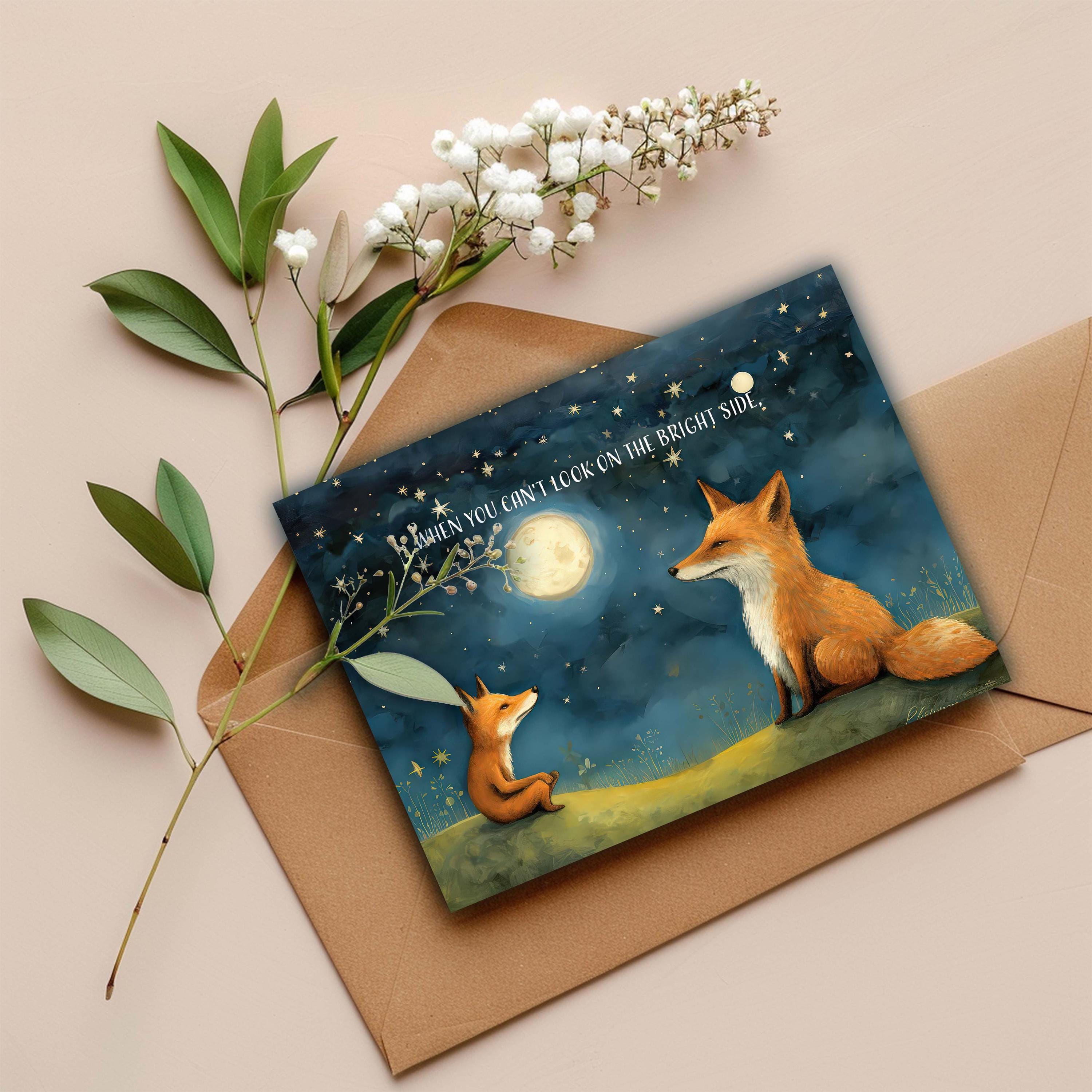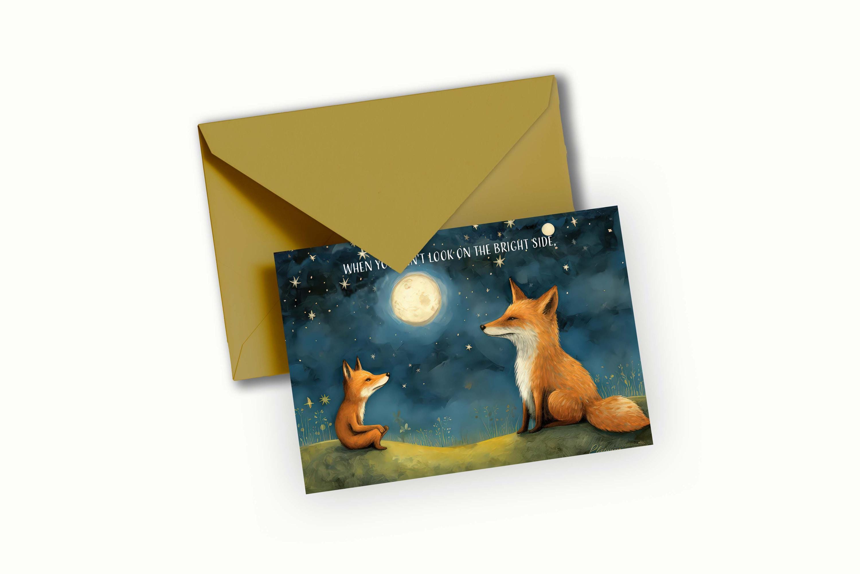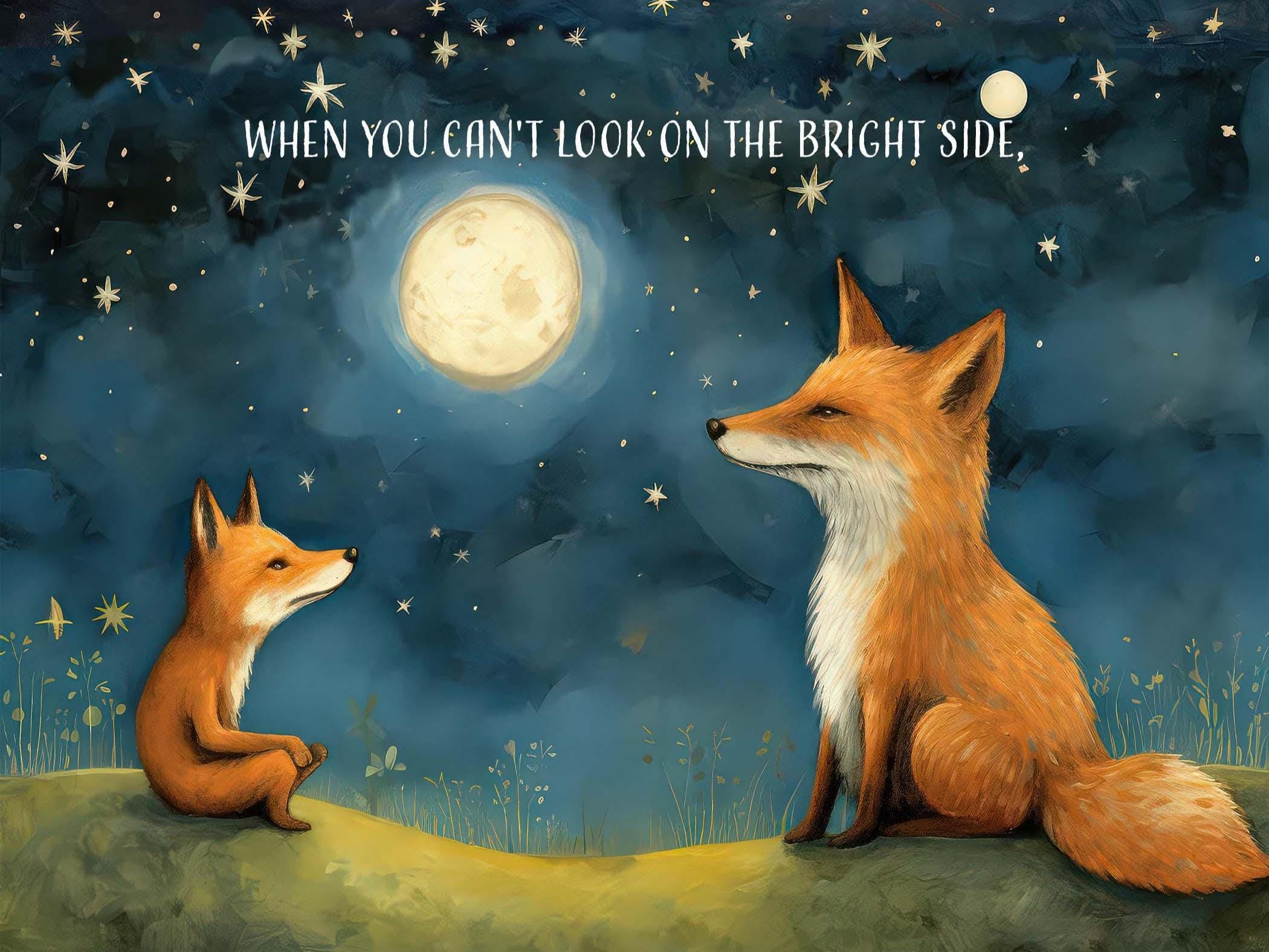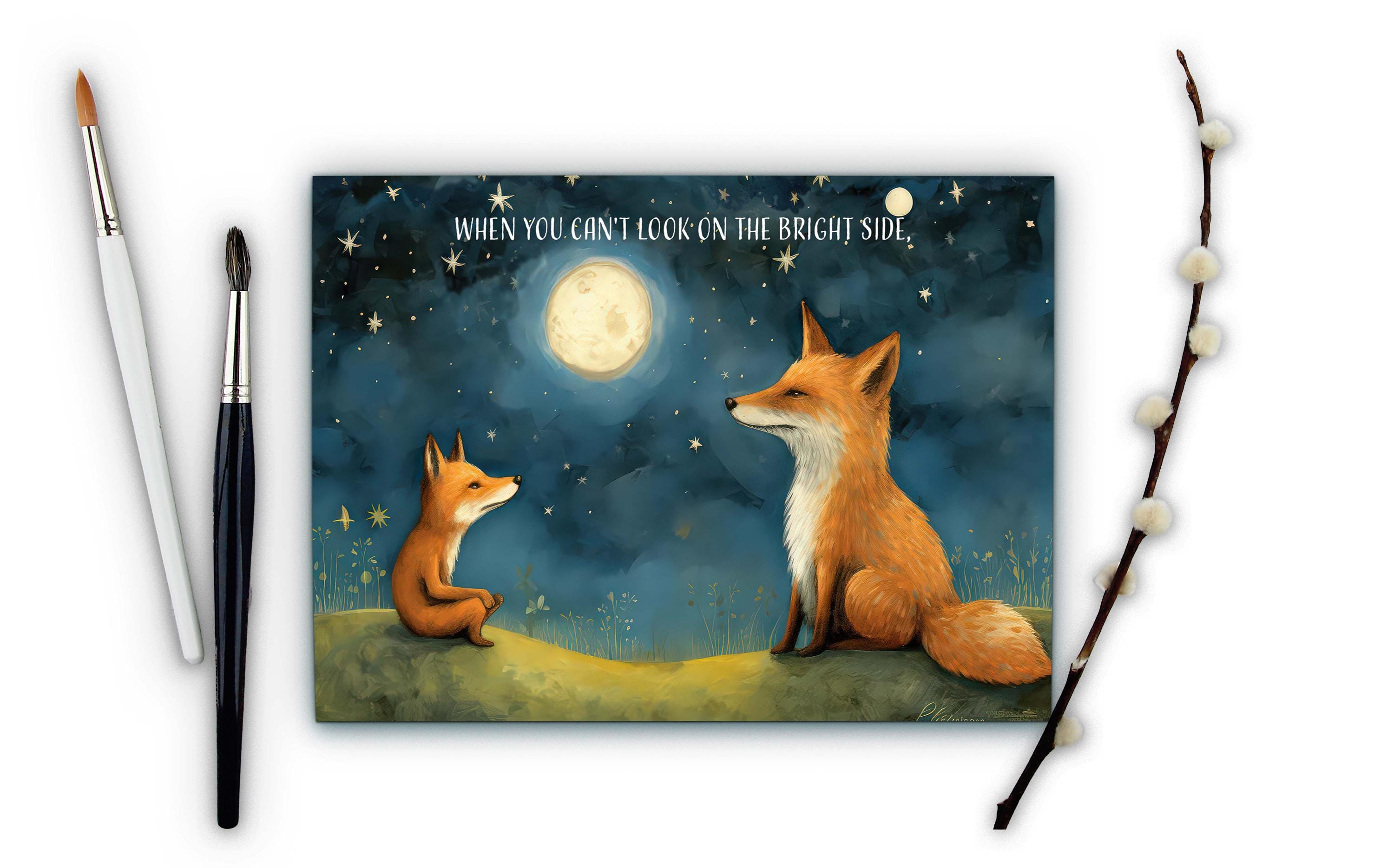A tender, moonlit moment captured in rich, comforting hues. On the front, a large red fox gazes gently at a smaller one, both sitting quietly beneath a dreamy night sky. A sign reads: "When you can’t look on the bright side…"