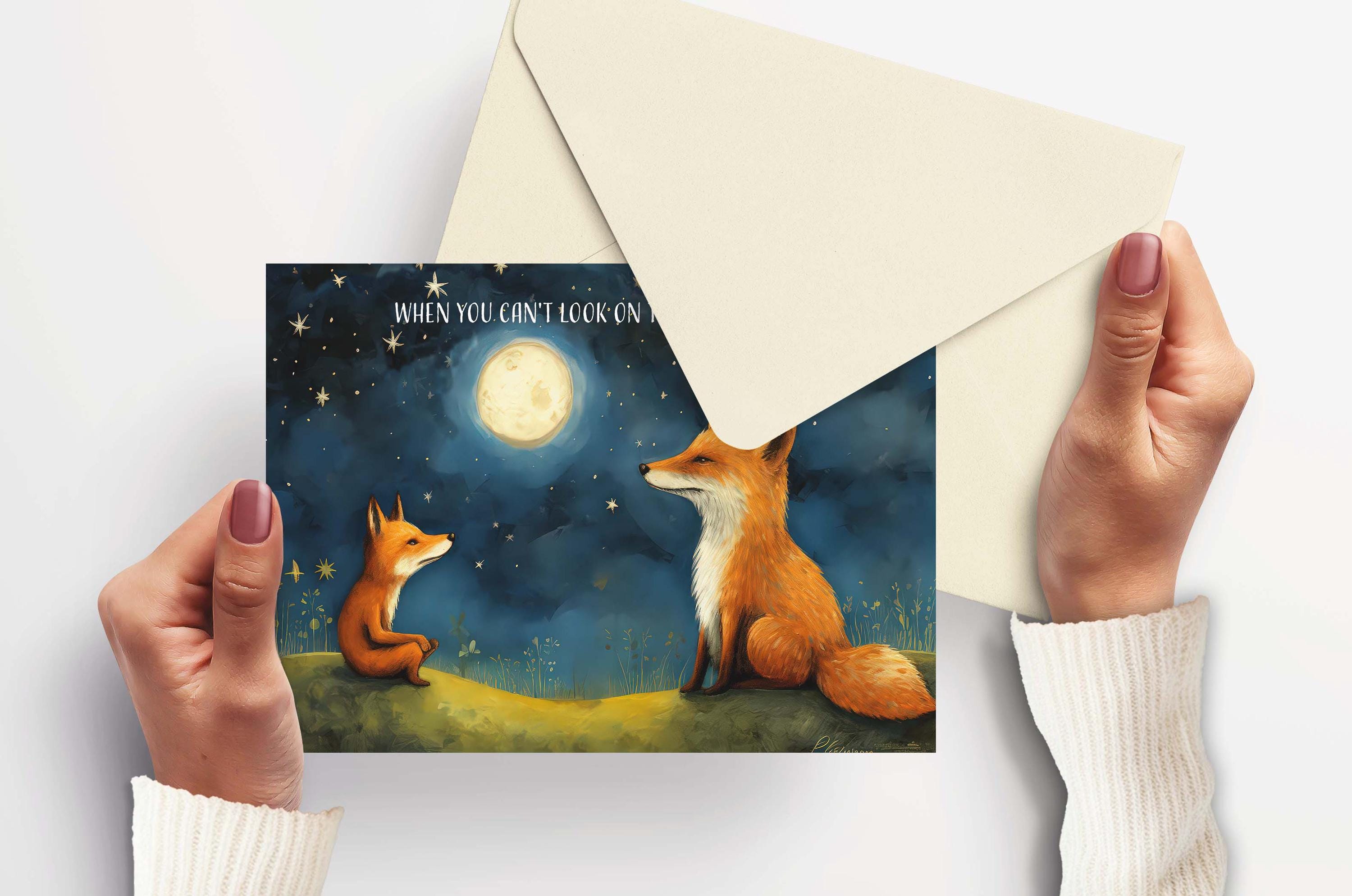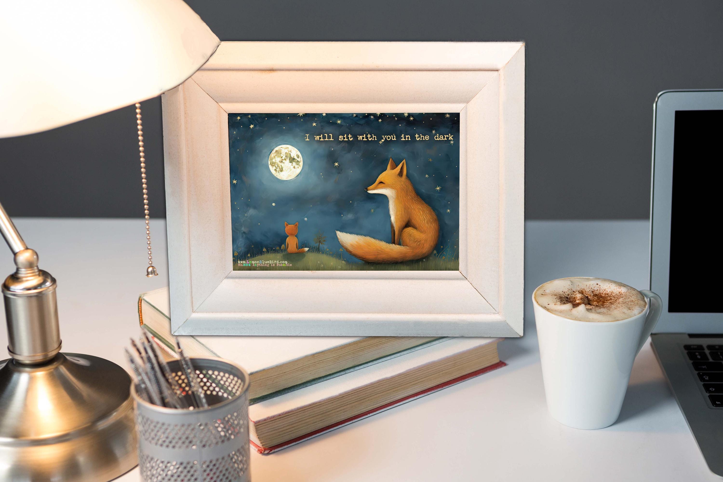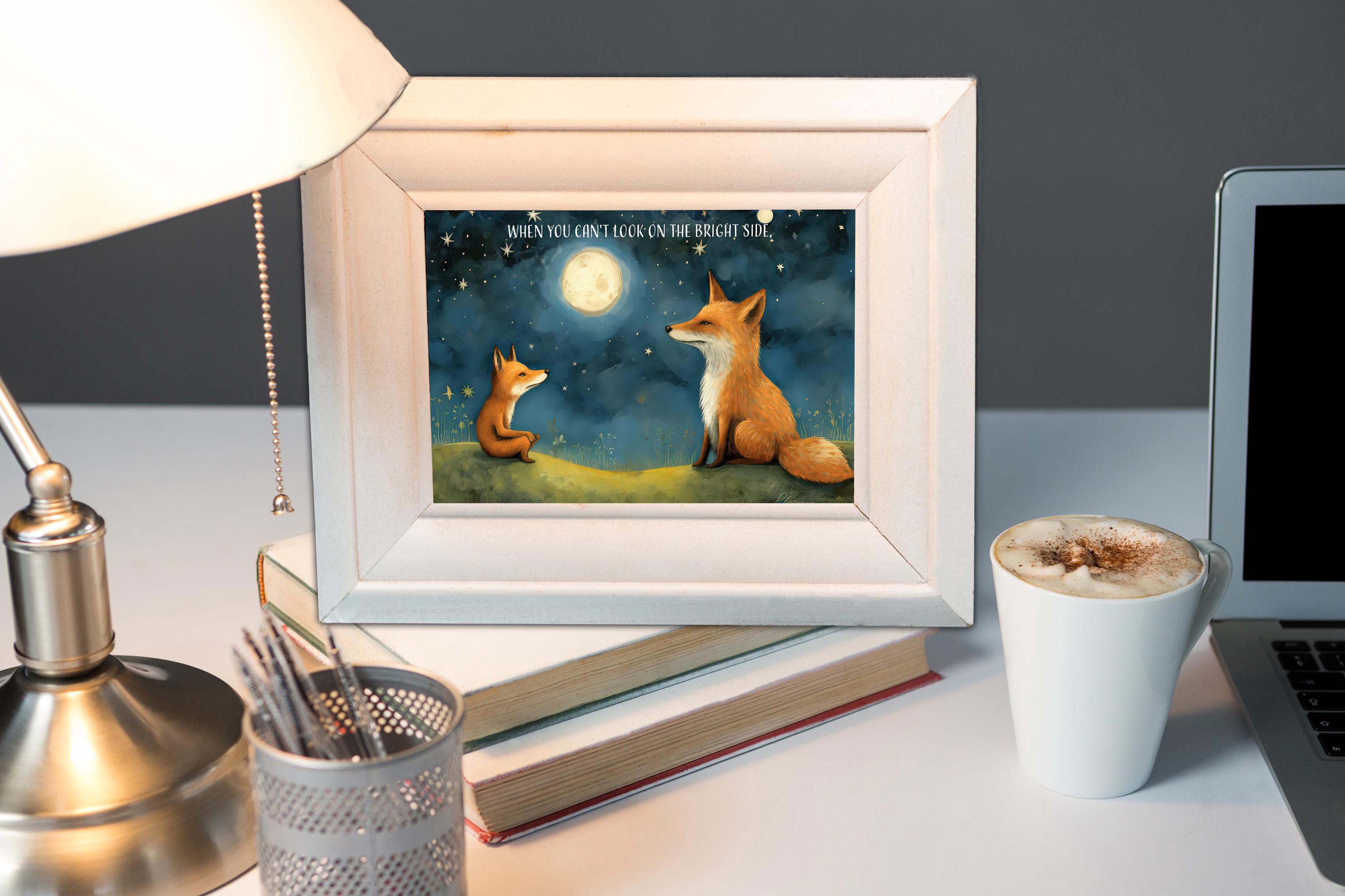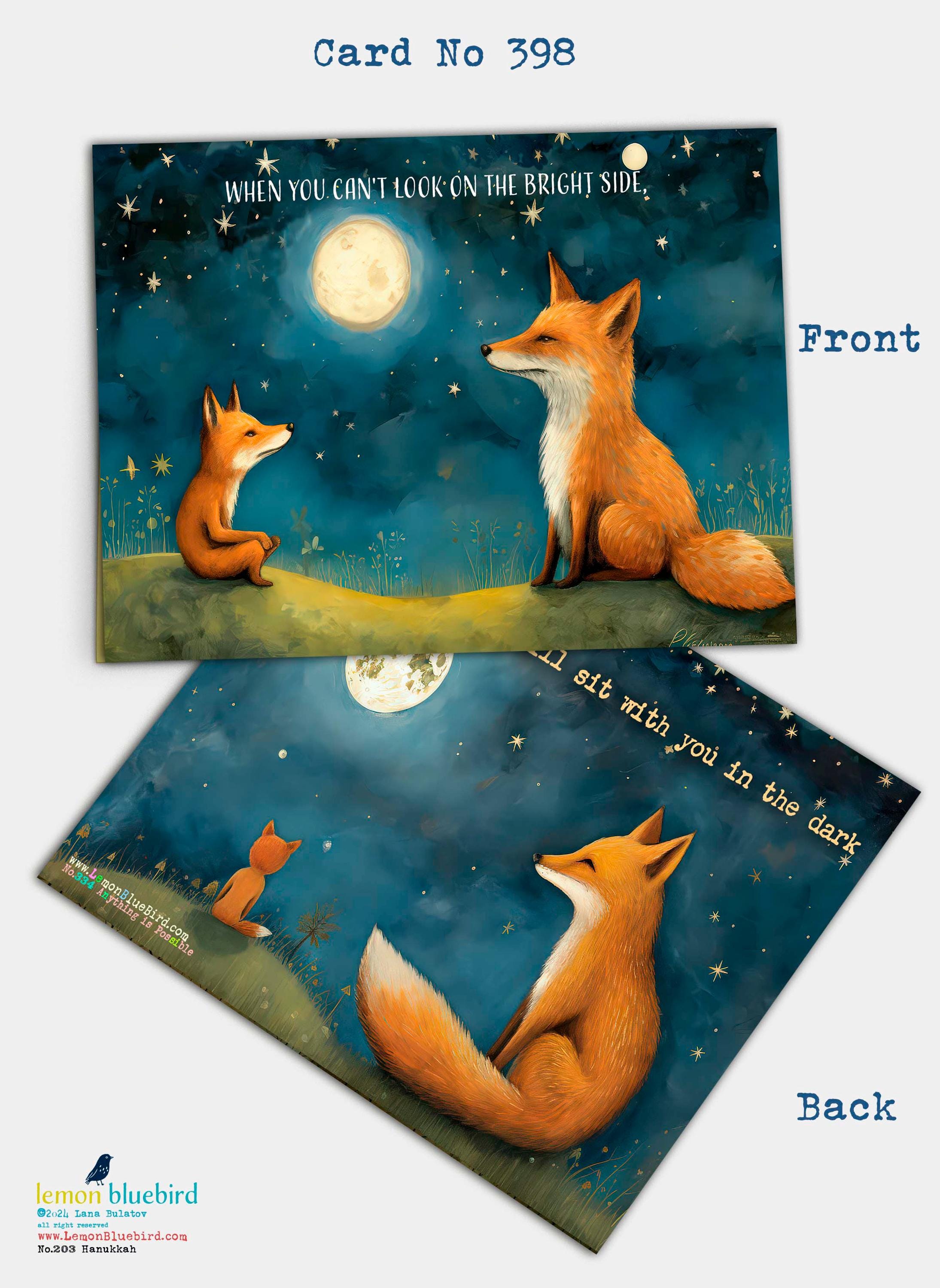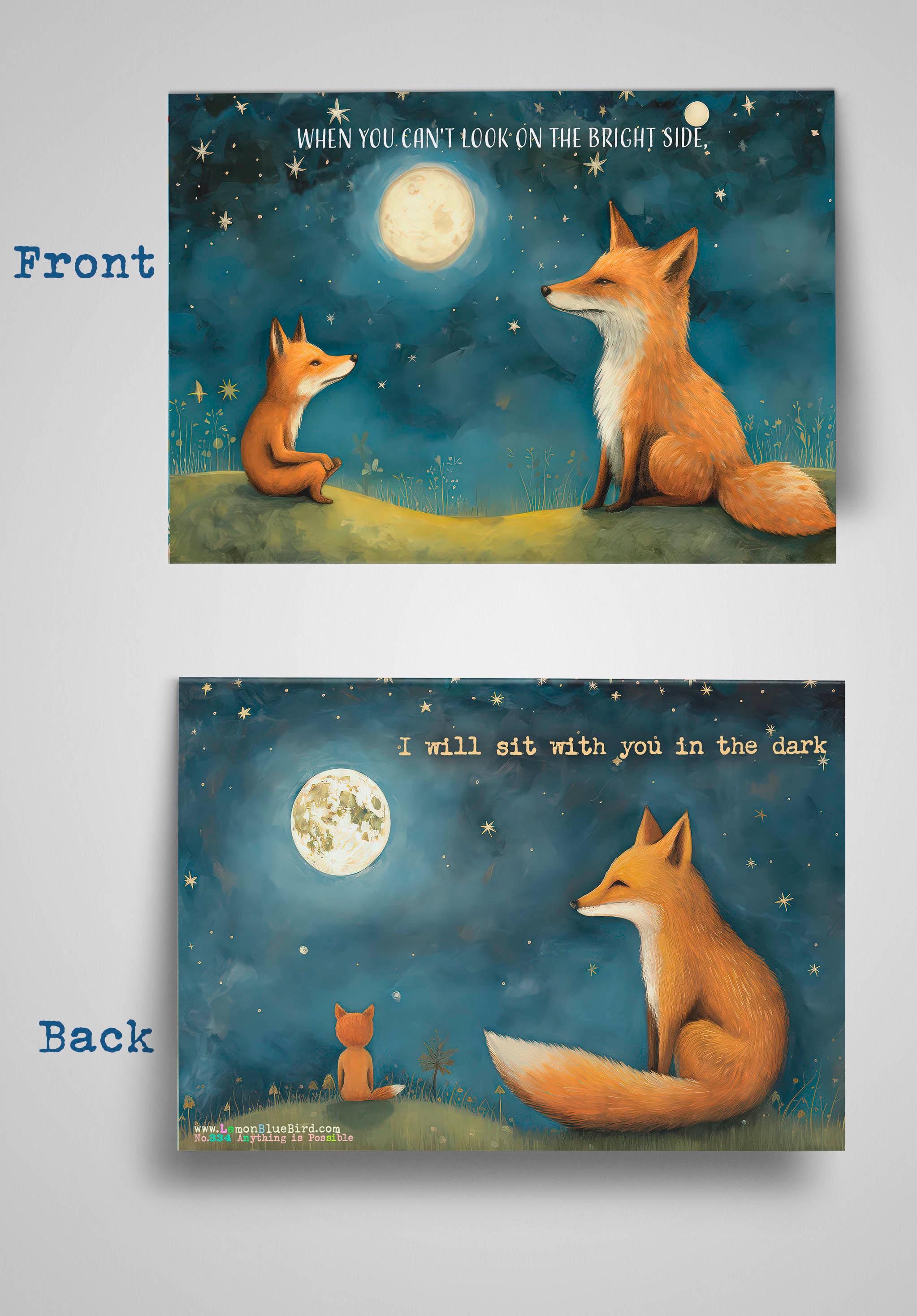 A tender, moonlit moment captured in rich, comforting hues. On the front, a large red fox gazes gently at a smaller one, both sitting quietly beneath a dreamy night sky. A sign reads: "When you can’t look on the bright side…"
