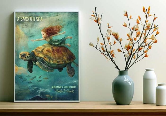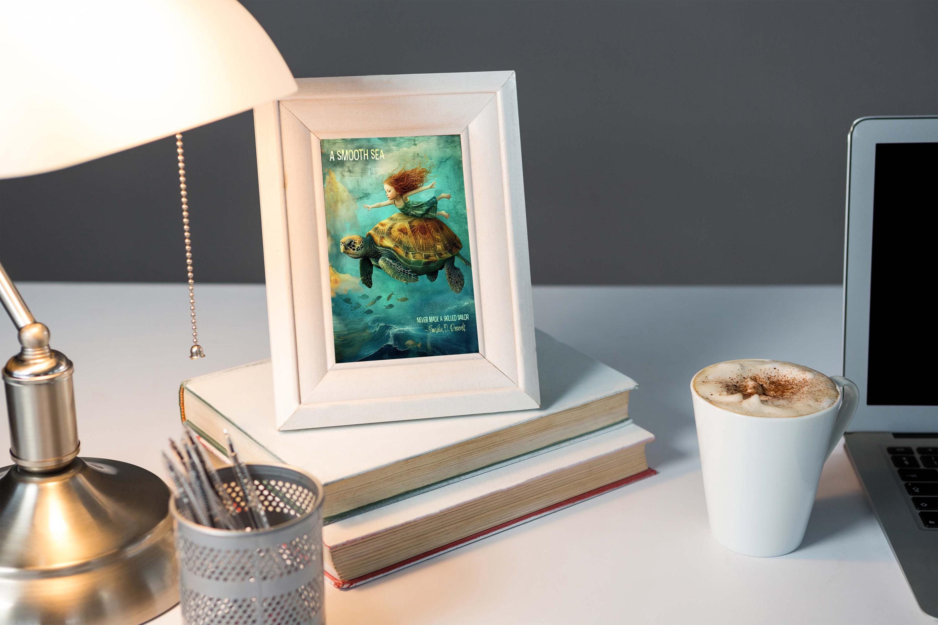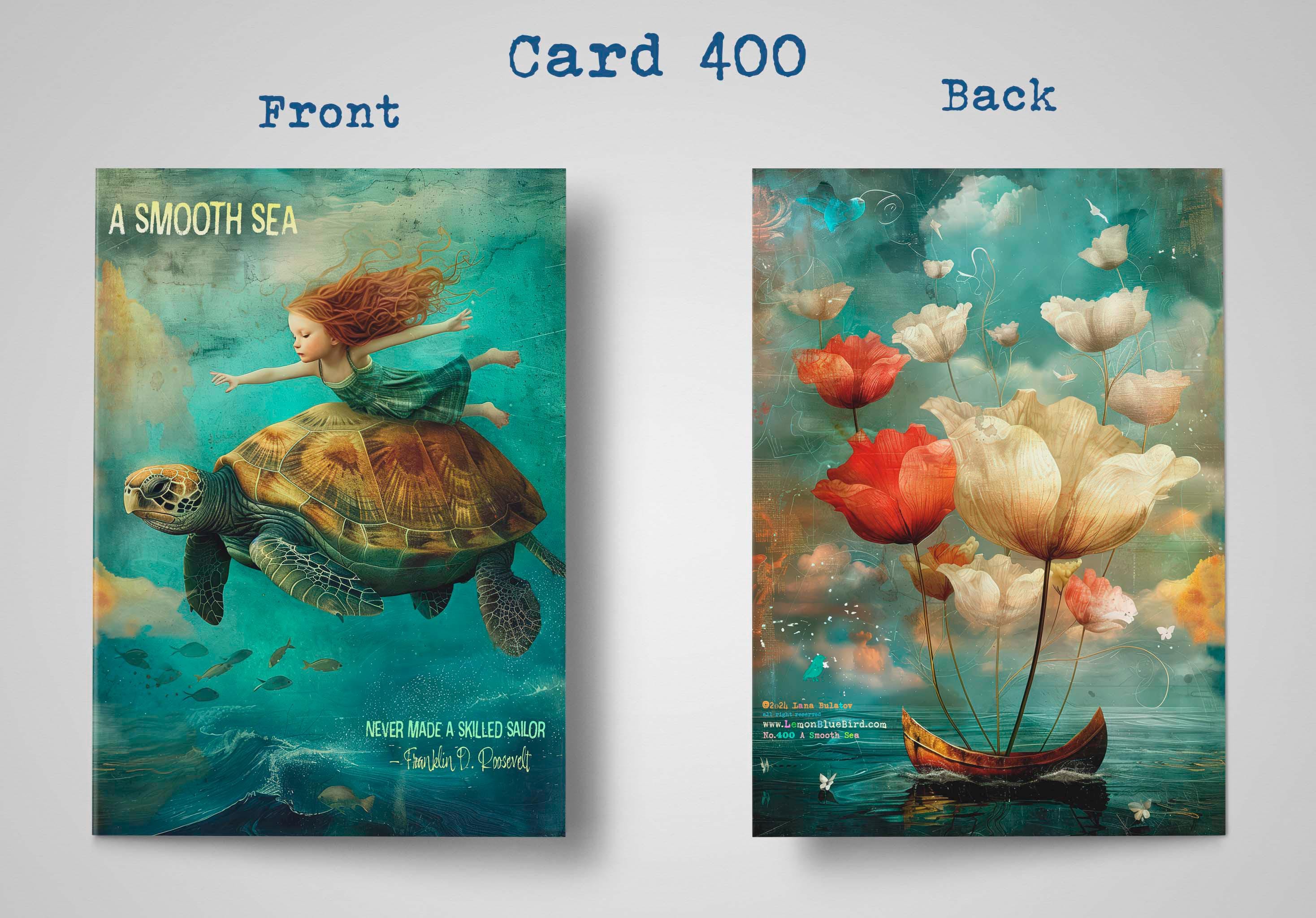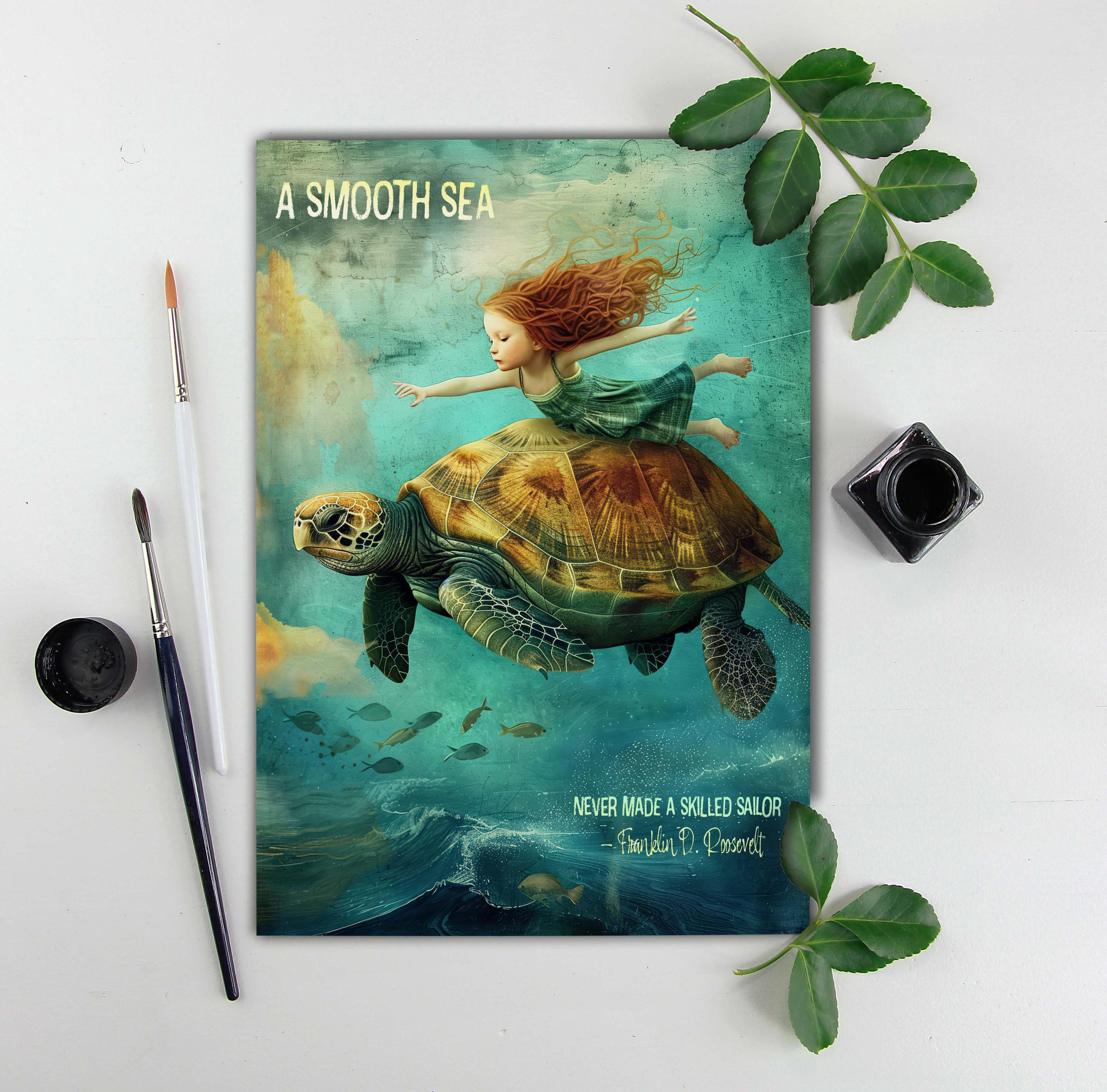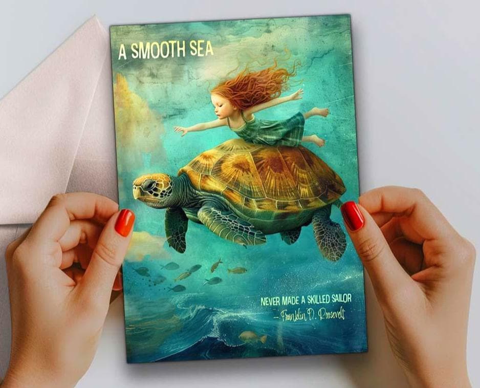 Celebrate courage and resilience with this whimsical greeting card, featuring a dreamy illustration in soothing shades of blue, green, and yellow. A tiny, brave girl balances atop a giant sea turtle as they ride across a stormy ocean. Her hair floats freely in the wind, arms stretched wide as she steadies herselfโgraceful and determinedโabove the swirling fish below.