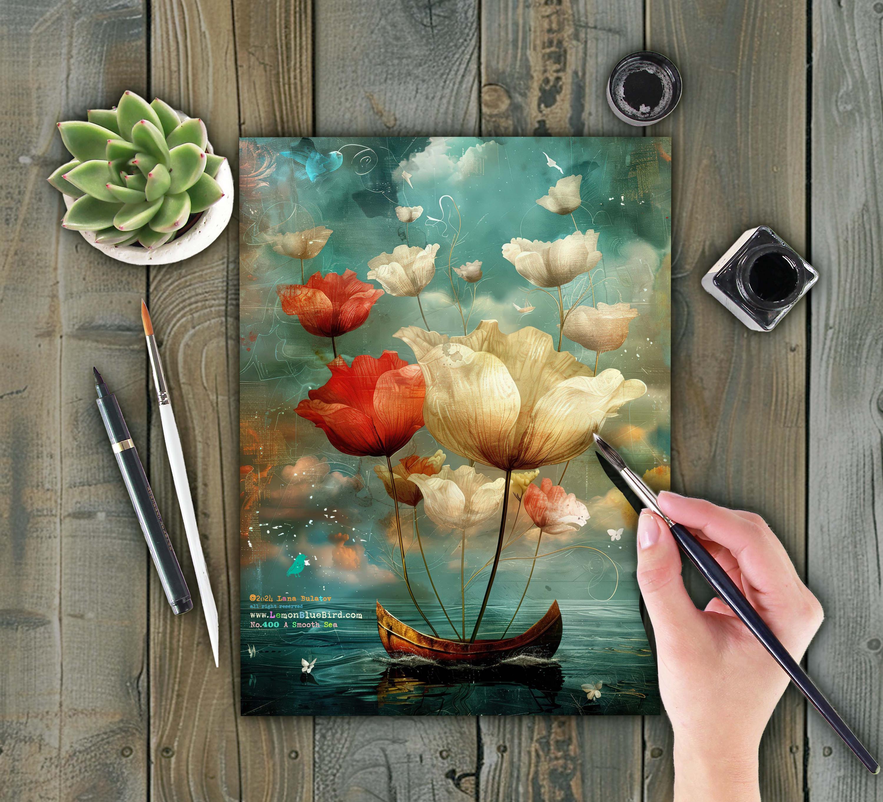 The back of the card offers a serene contrast: a calm ocean scene where a small boat gently floatsโand from it, giant flowers grow, reaching toward the sky. A symbol of hope, growth, and the beauty that blooms after overcoming lifeโs storms.