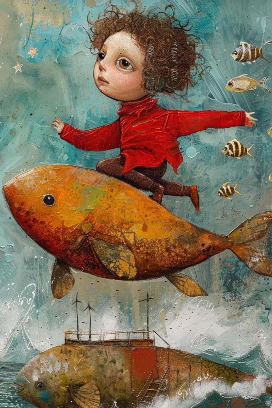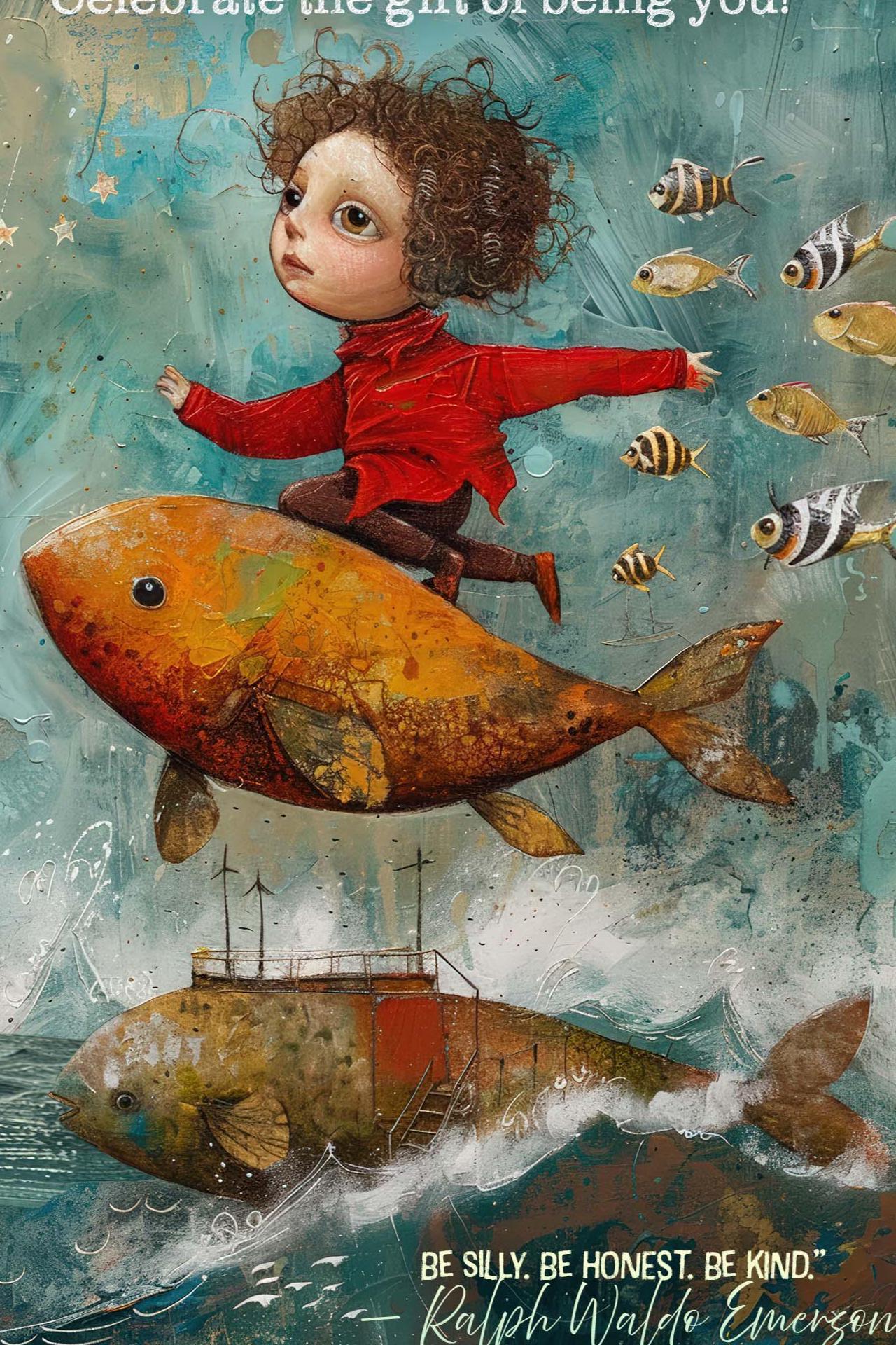A fearless, whimsical boy flies joyfully on top of a giant fish, soaring above the open ocean with wild hair and arms outstretched. Below him, a fish-shaped boat sails through the waves, full of motion and magic. A hurdle of stripy fish follows closely behind in playful formation.