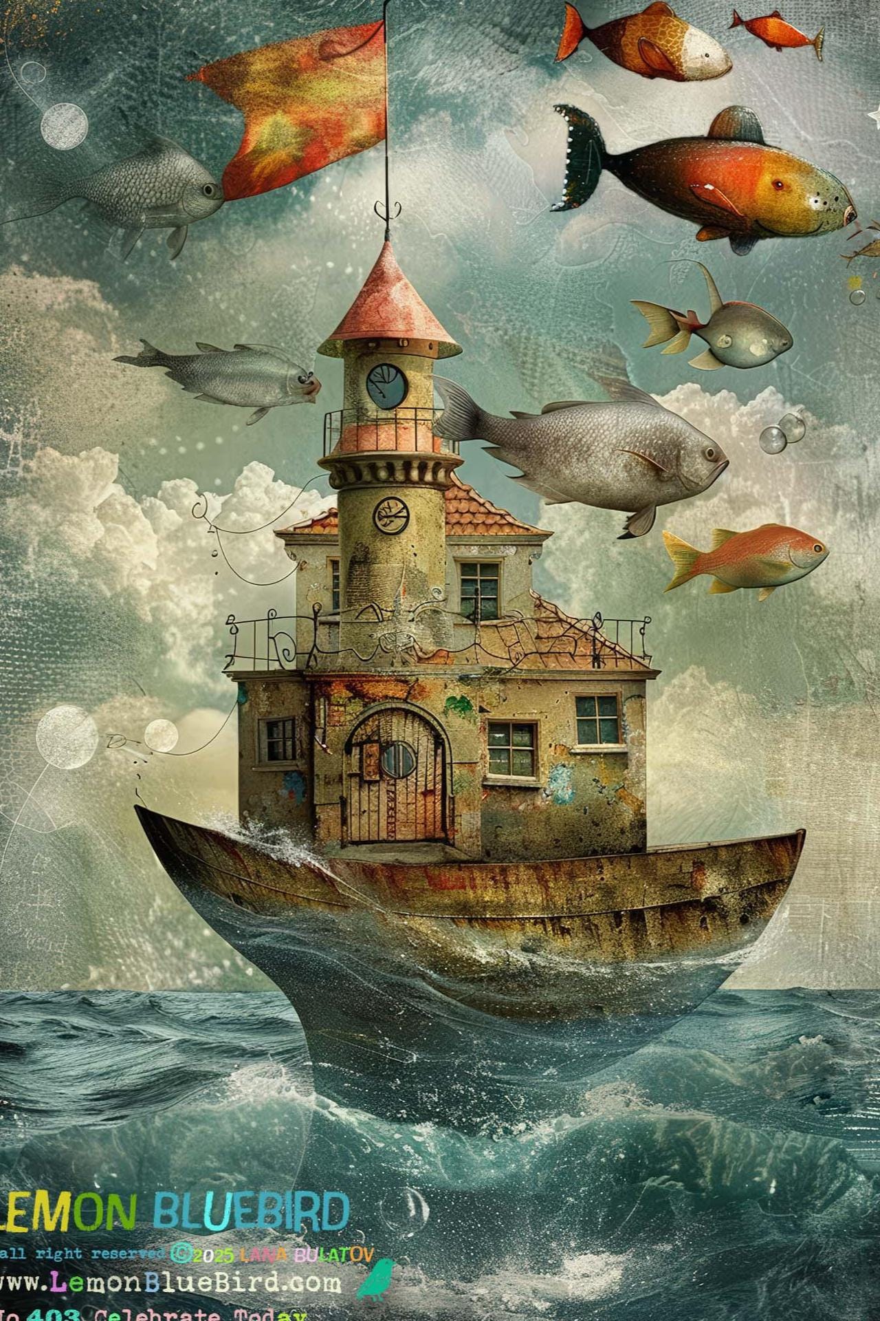 Inside the boat floats a magic castle, nestled like a secret world waiting for the boyโs return. Above, more whimsical fish leap and swirl through the air, as if lighting the way. The sea sparkles with motion โ rich in texture, depth, and wonder.