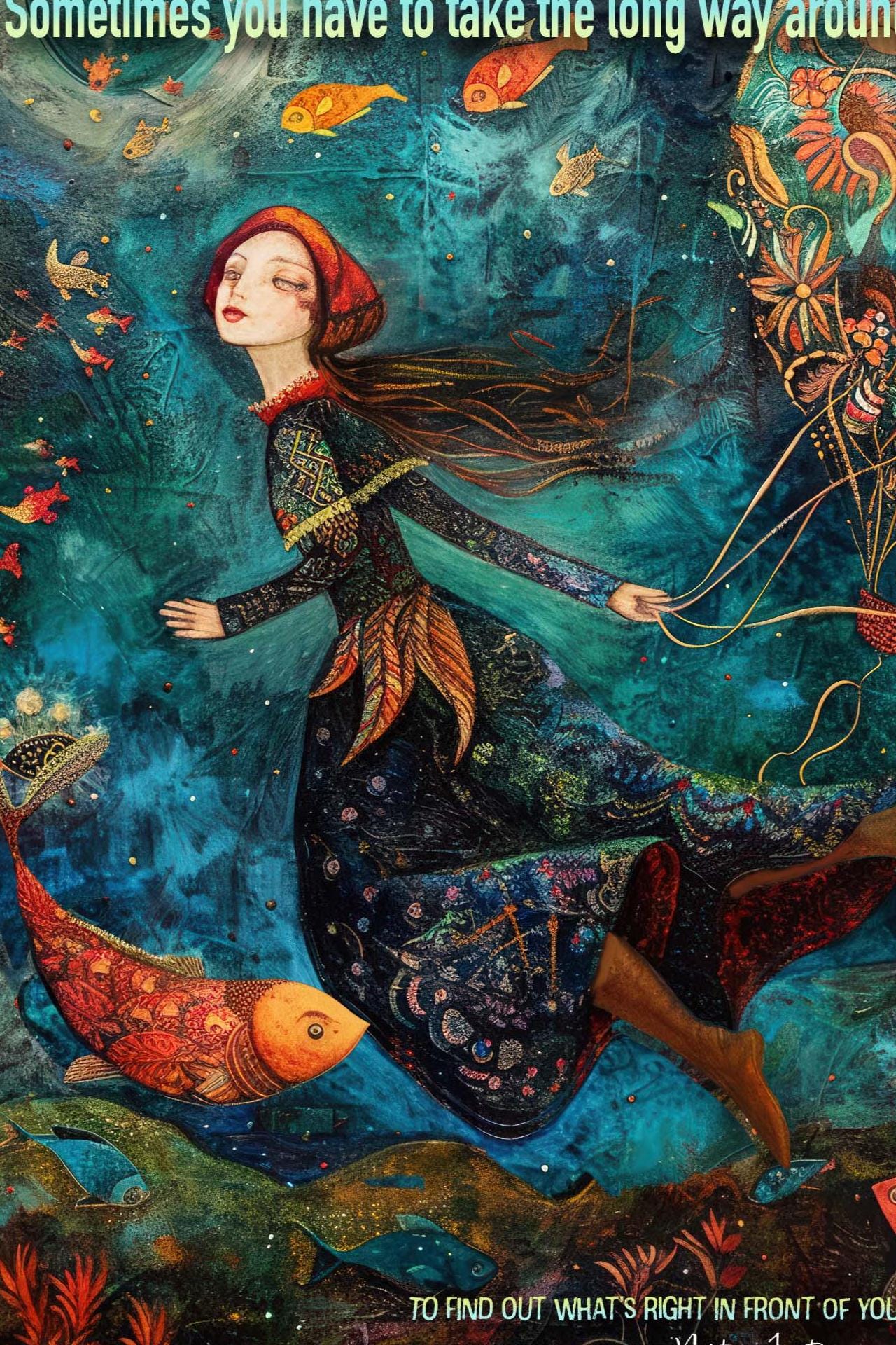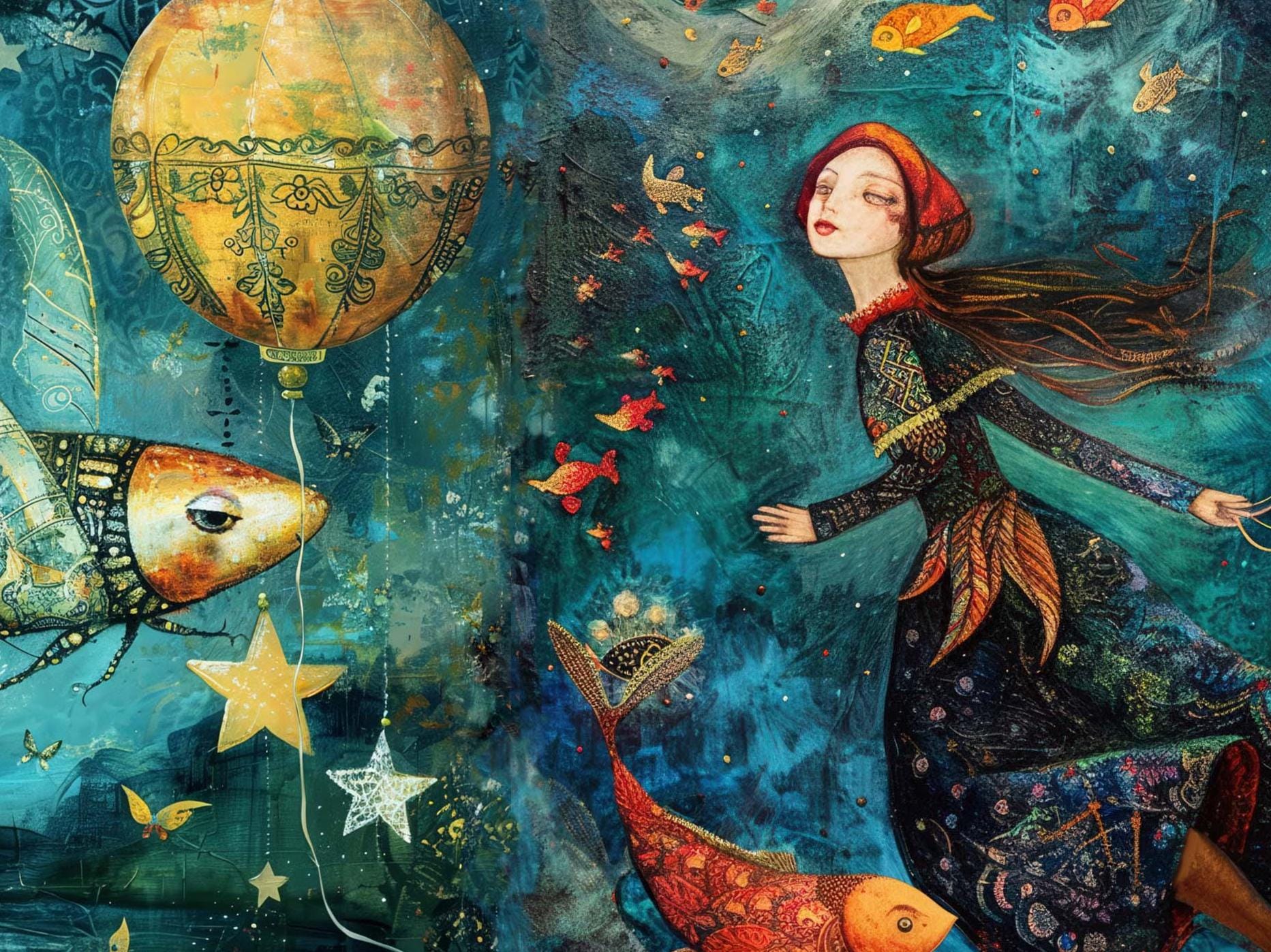 A richly textured, whimsical card awash in deep jewel tones—emerald, sapphire, amethyst, and ruby—captures a dreamlike journey through an enchanted sea. At its heart, a girl floats gently through magical waters, holding on to a vibrant, multicolored hot air balloon as luminous fish glide beside her. The ocean shimmers with quiet magic—sea creatures, drifting stars, and the gentle pull of possibility.