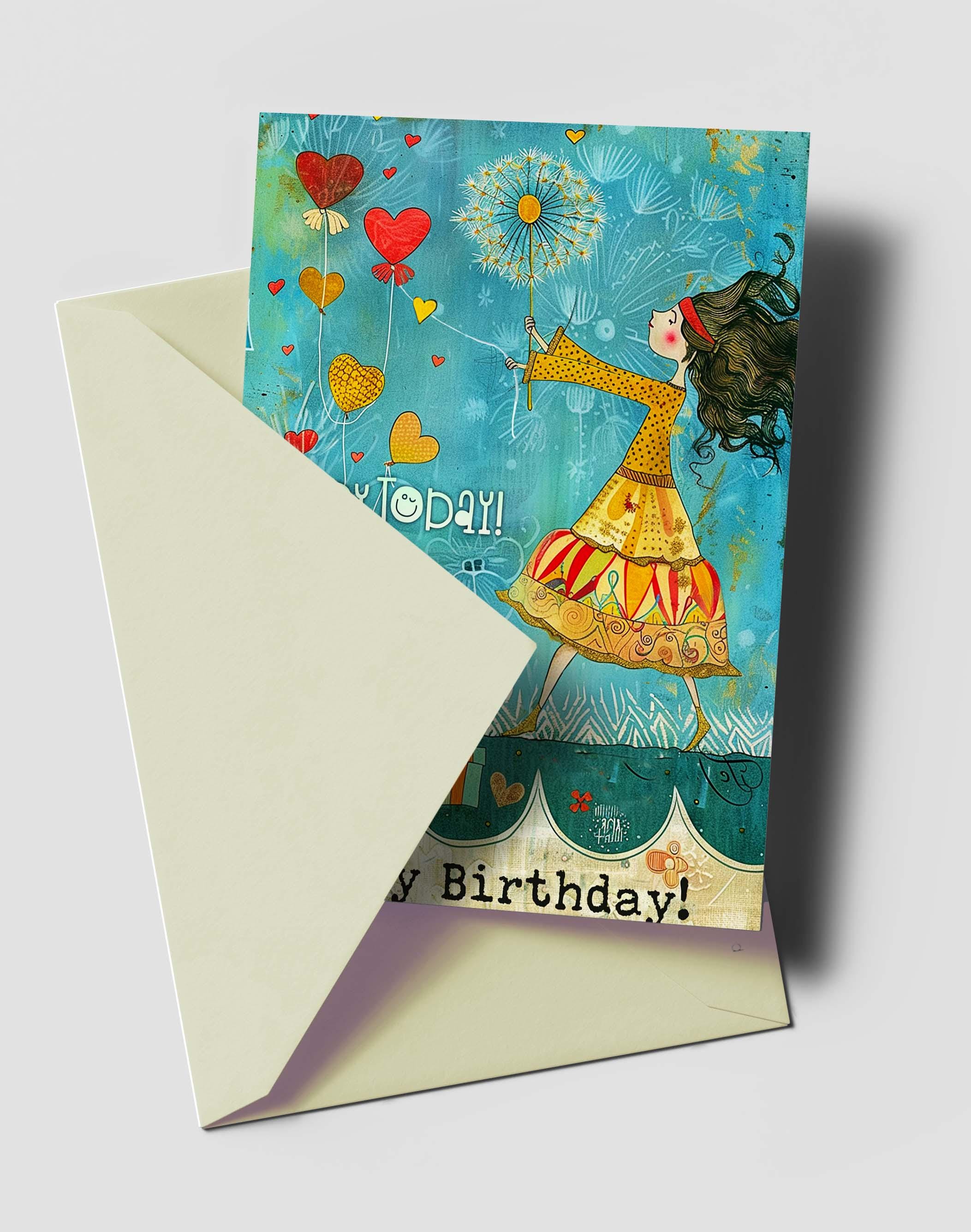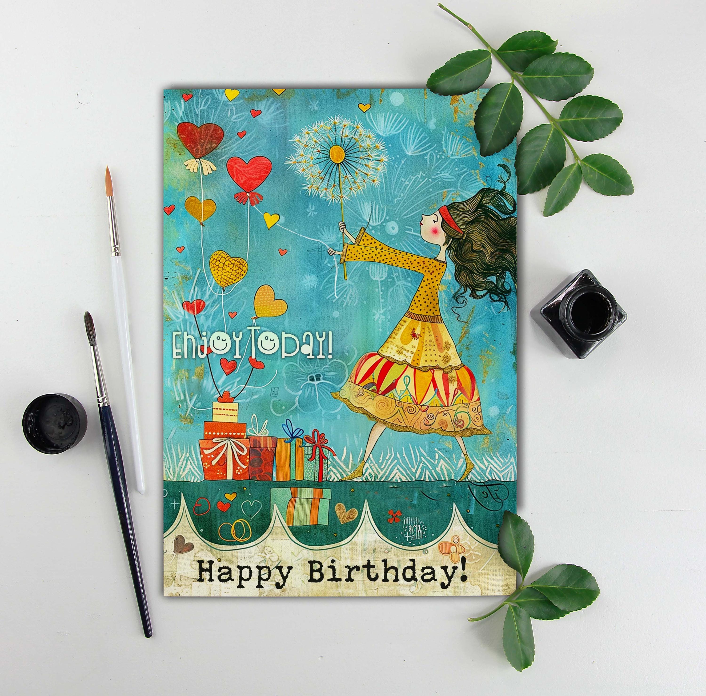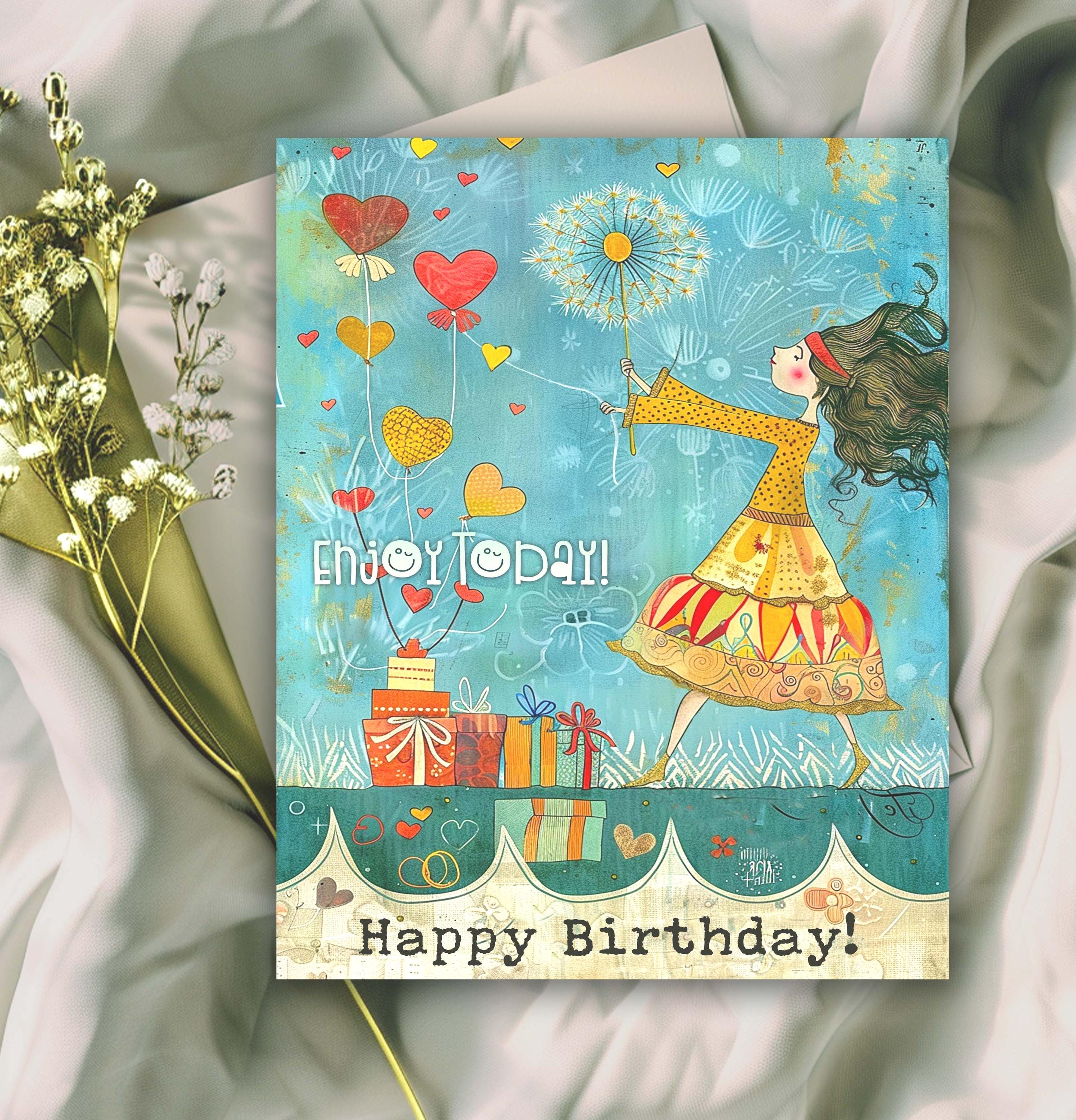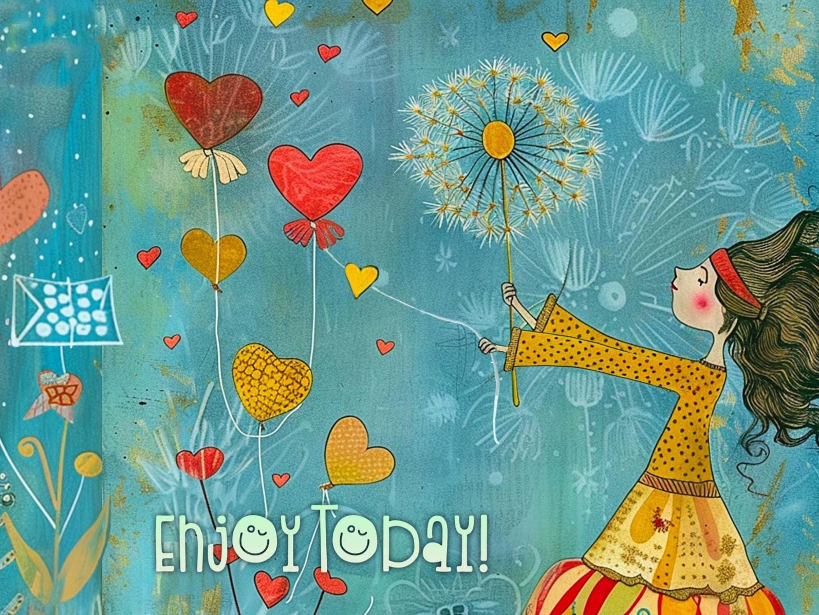 She holds heart-shaped balloons in one hand and a delicate dandelion puff in the other, ready to make a wish as the breeze swirls around her. A cheerful sign reads: "Enjoy Today!" โ the perfect birthday message full of joy and anticipation.