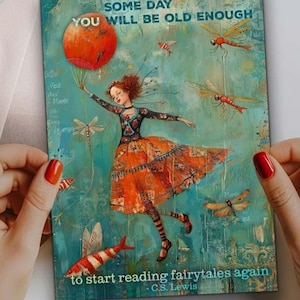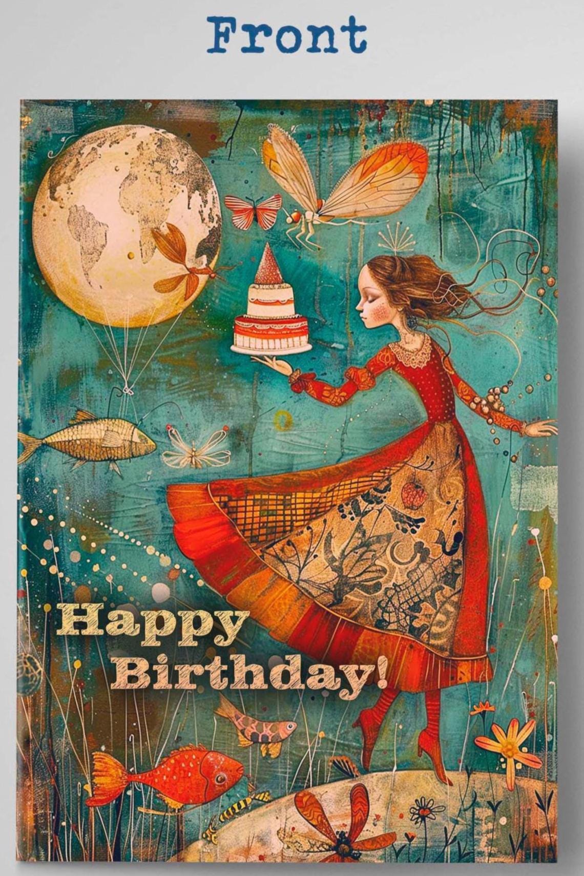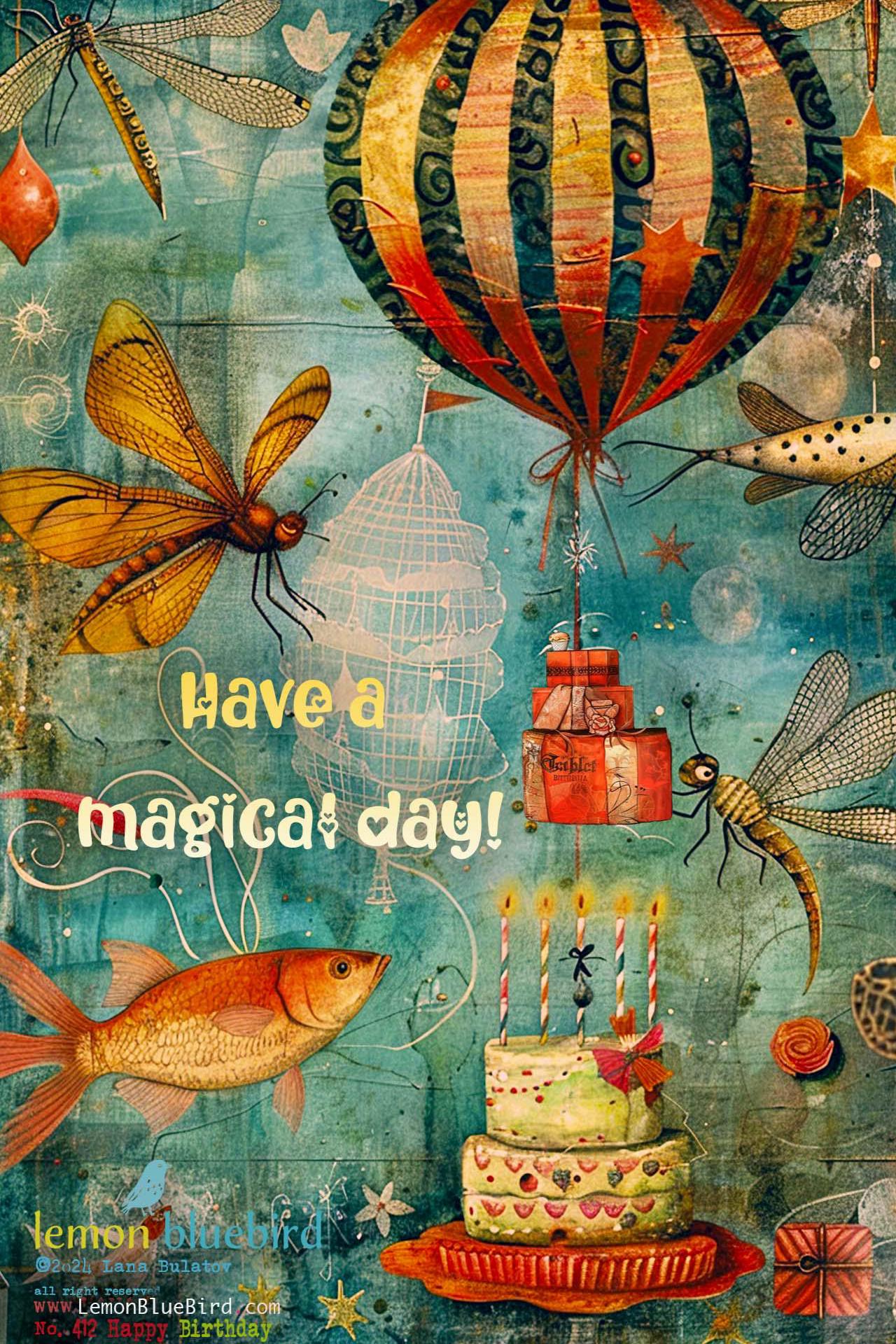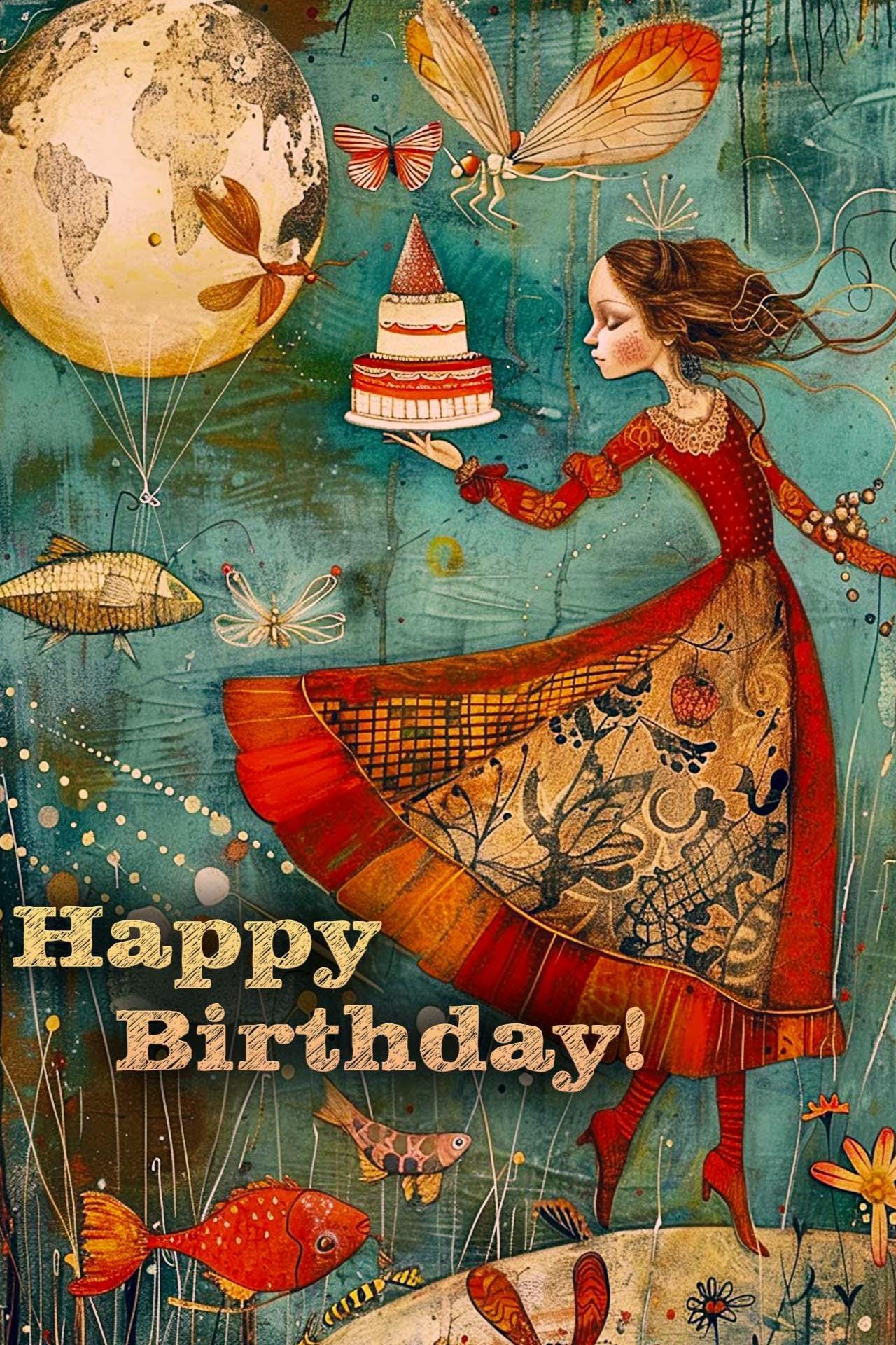Surrounding her are magical flying fish, colorful dragonflies, floating balloons, and even a cake โ all drifting weightlessly in a festive birthday dance. The sign reads: โHappy Birday! Have a Magical Day!โ in a charming, slightly quirky script that matches the whimsical feel of the artwork.