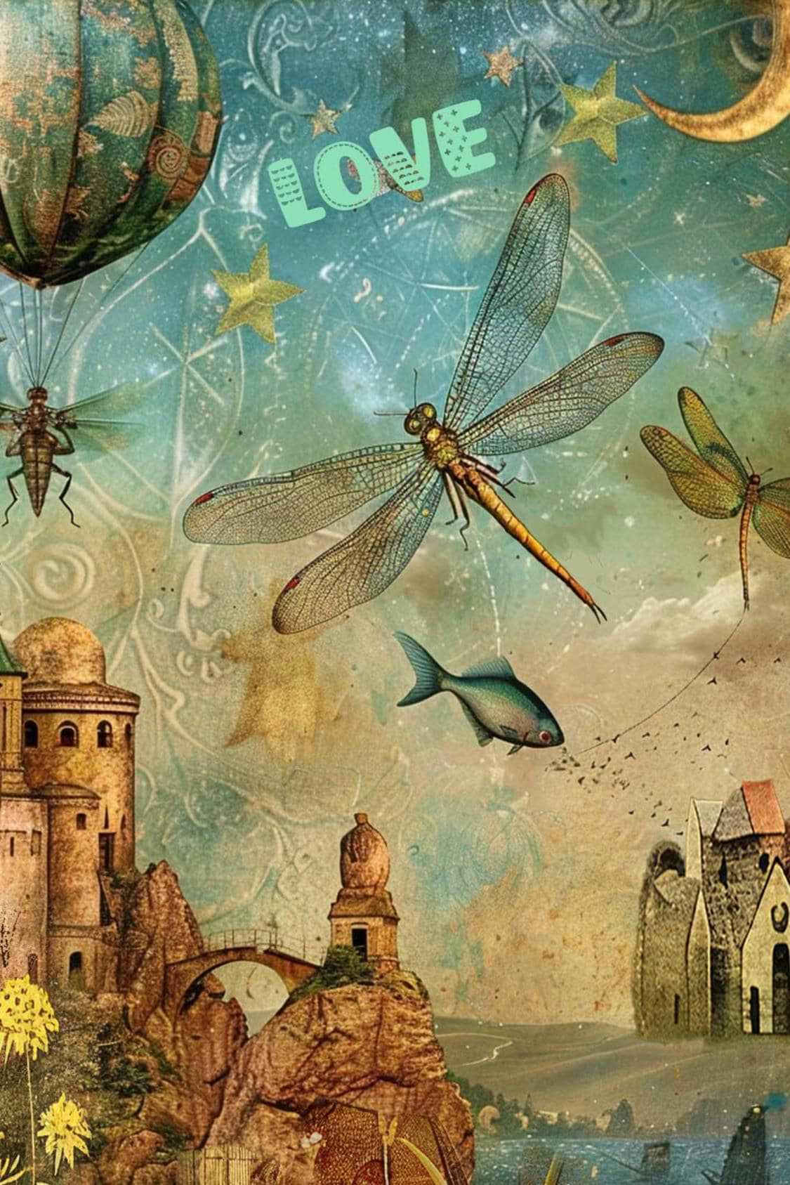 The back of the card continues the dream: the same old town rests quietly under the sky, with dragonflies, more flying fish, and even a whimsical fly floating gently in a balloon overhead. The air is filled with soft motion and surreal magic, like a story waiting to be told.