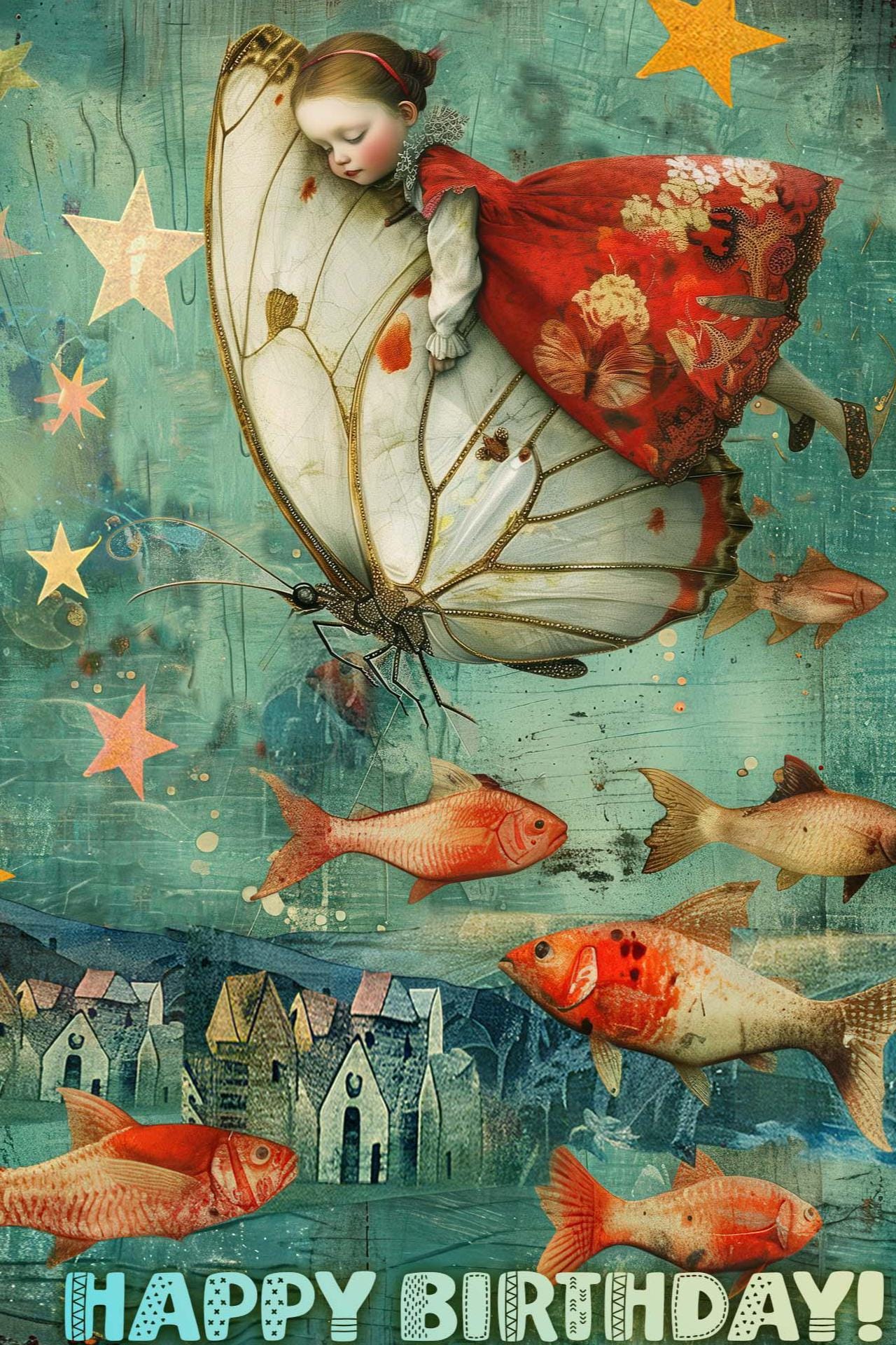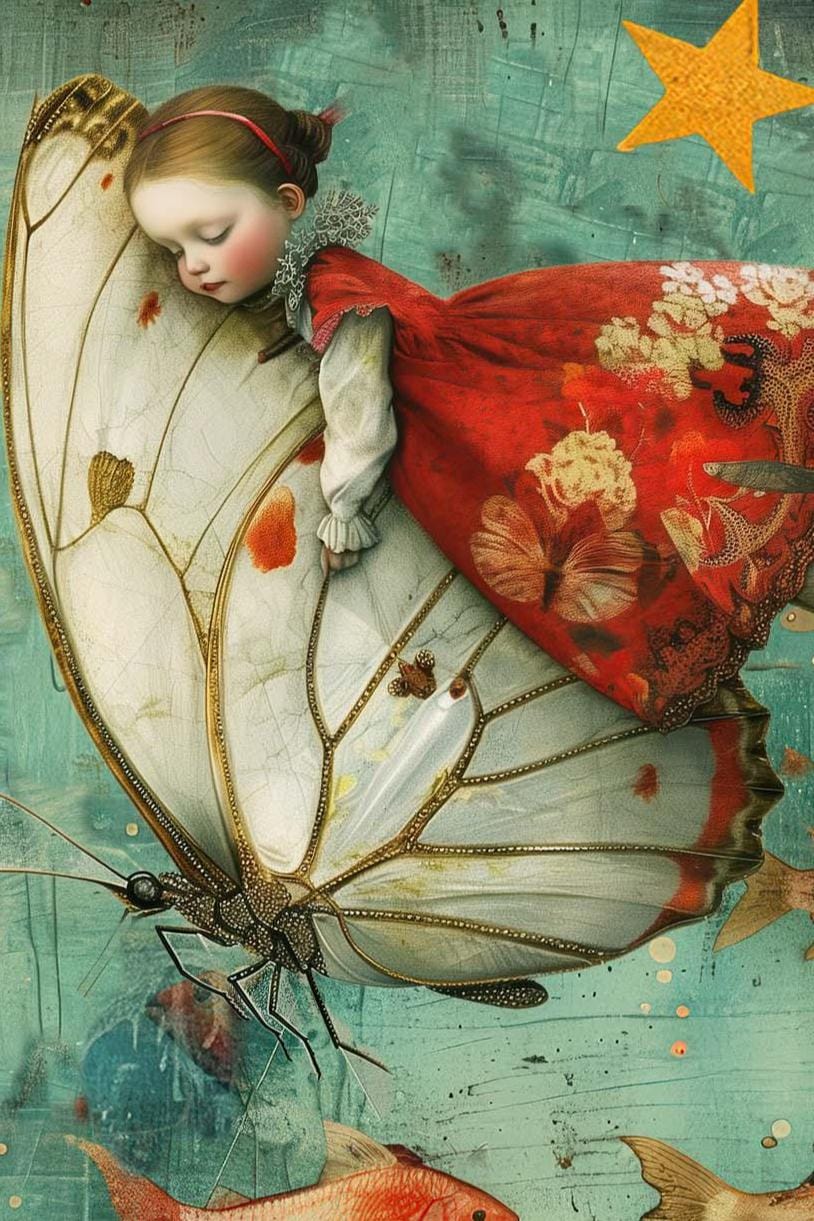 On the front, a little girl in a flowing red dress drifts peacefully through the stars, holding on to the delicate wings of a giant white butterfly. Her eyes are closed in sleep, lost in the beauty of the dream. Below her, a flock of red fish soars through the air, gliding silently over an old town bathed in moonlightโescorting her through the night like guardians of her imagination.