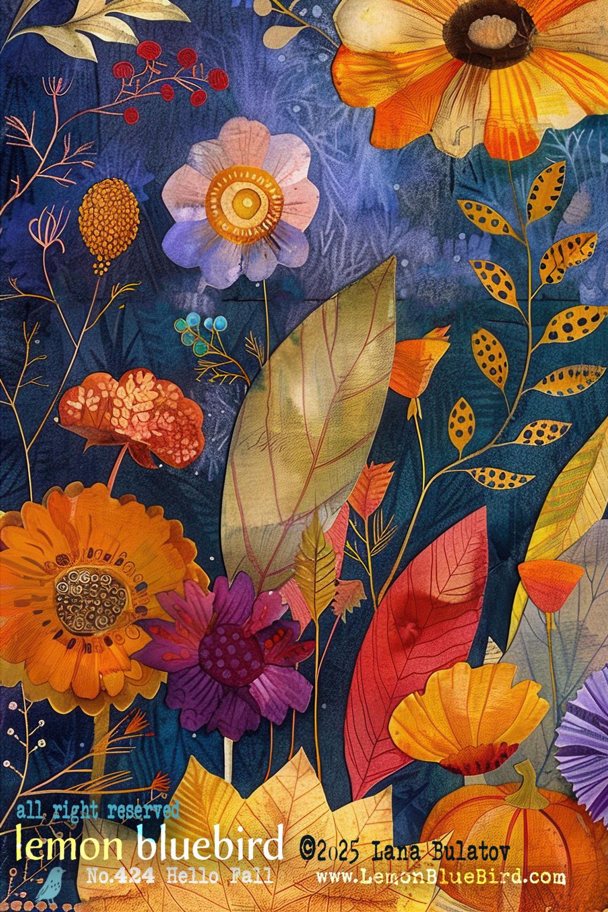 Backs side blooms a bright, enchanted garden of whimsical flowers in rich fall huesโswirls of magenta, glowing orange, fiery red, deep gold, and whimsical purples. The background bursts with energy, magic, and the cozy chaos of autumn.