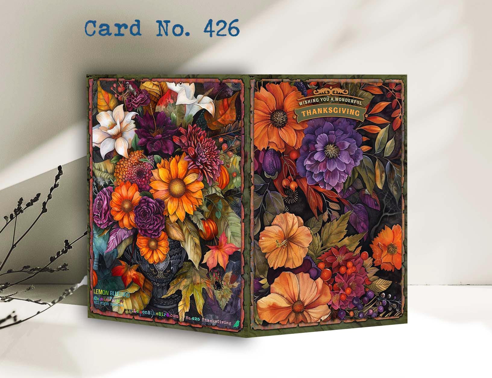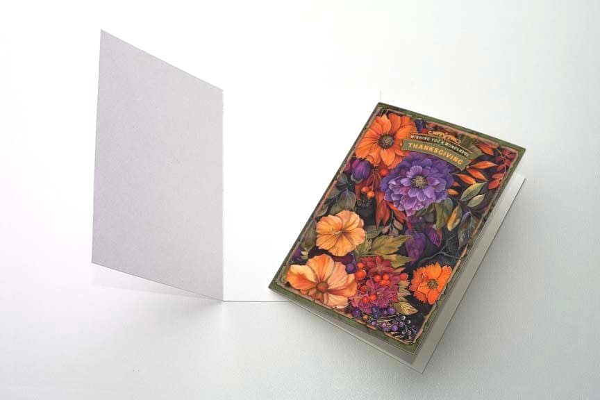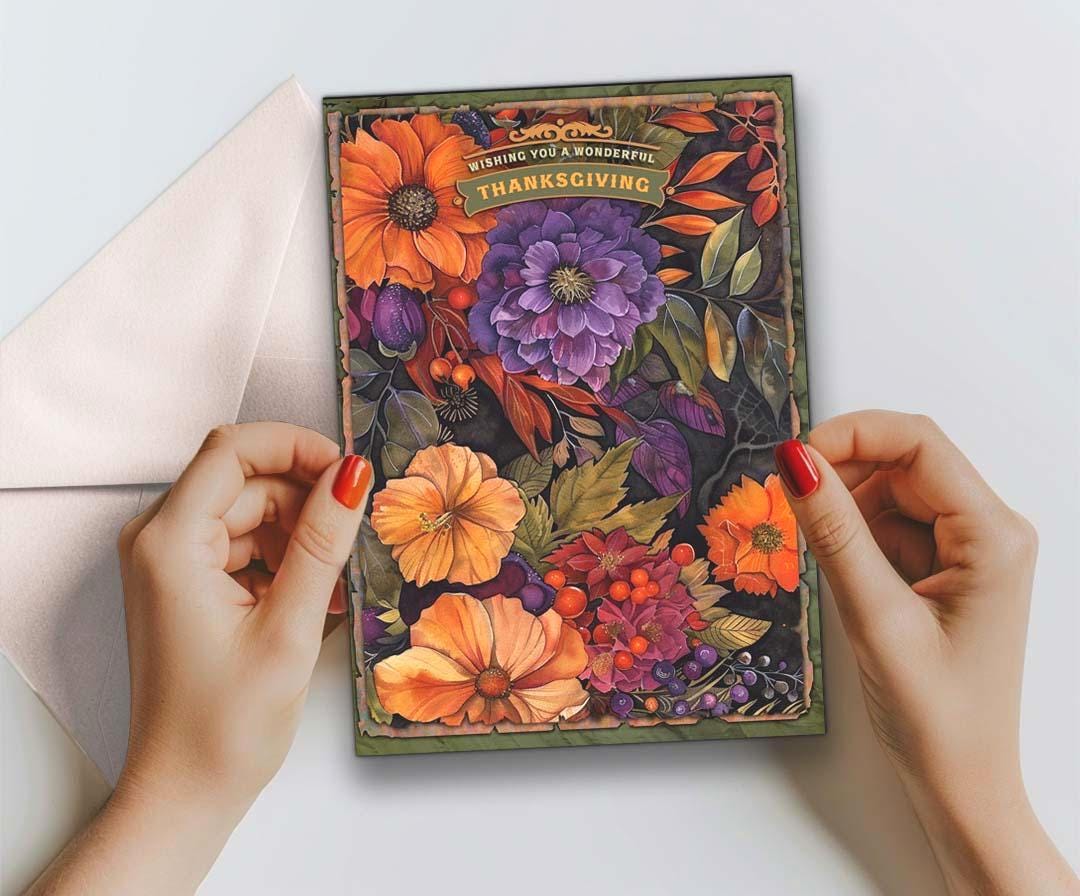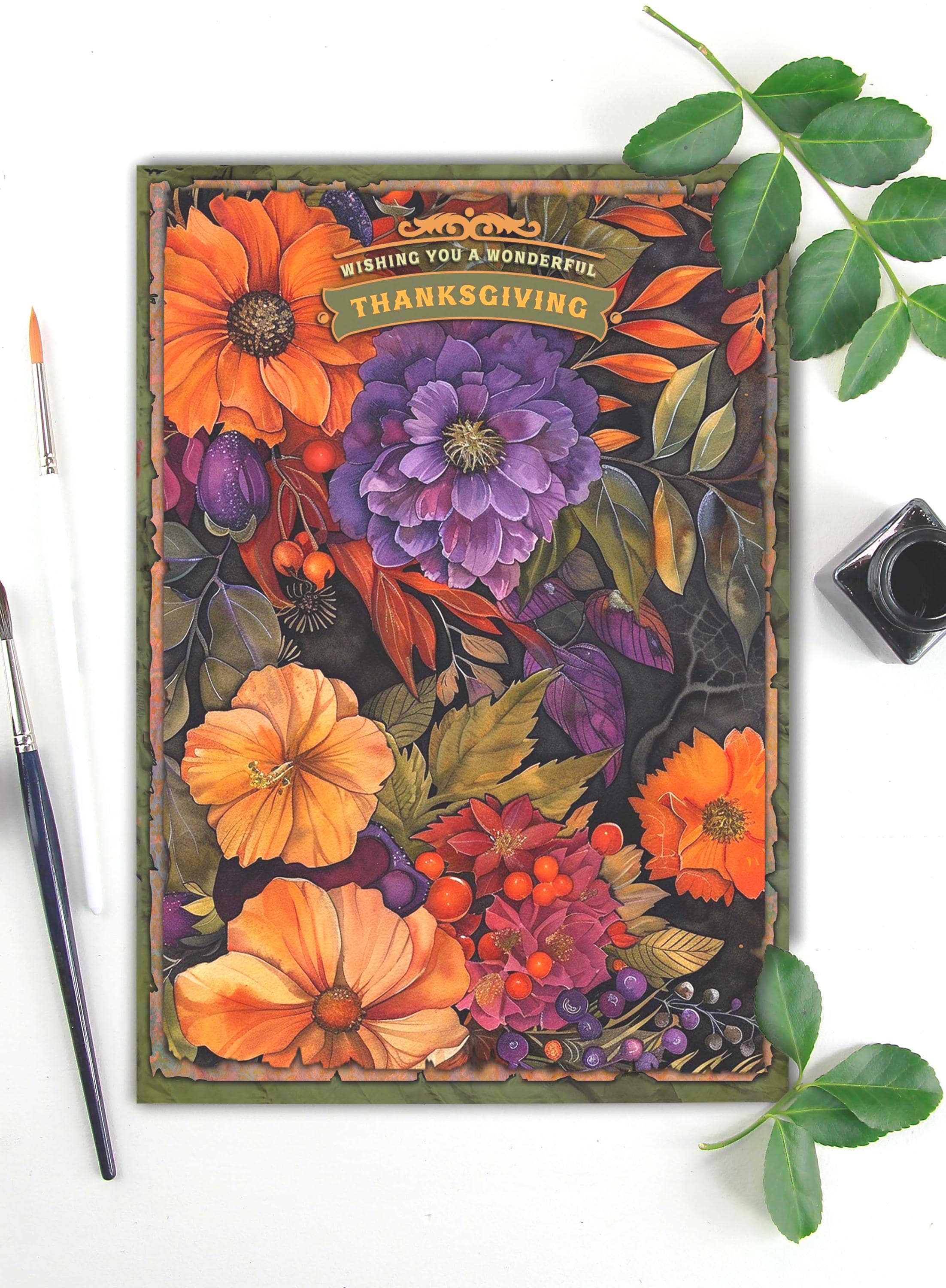 The back side of the card continues the celebration with a seamless cascade of jewel-toned florals and colorful fall leaves wrapping the edges, creating a rich, full-circle design that feels both joyful and refined.