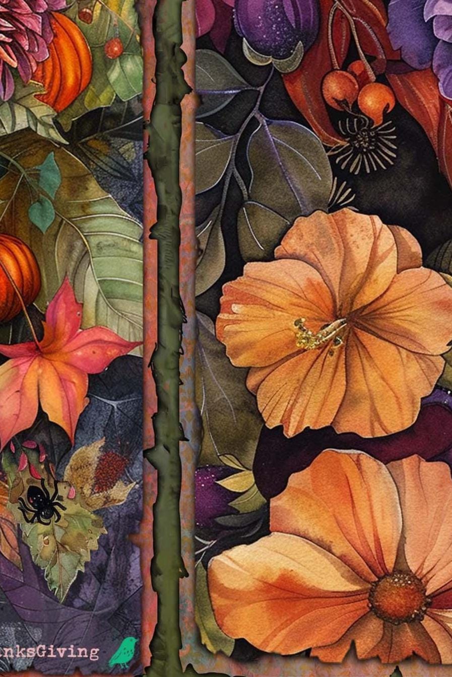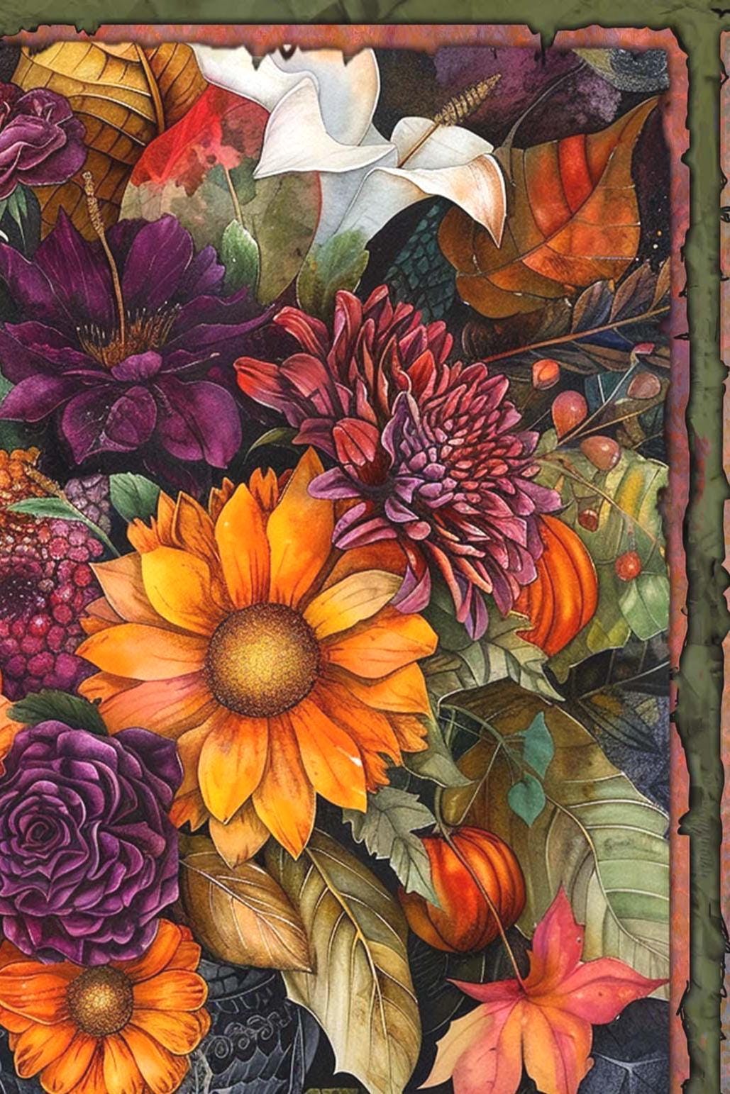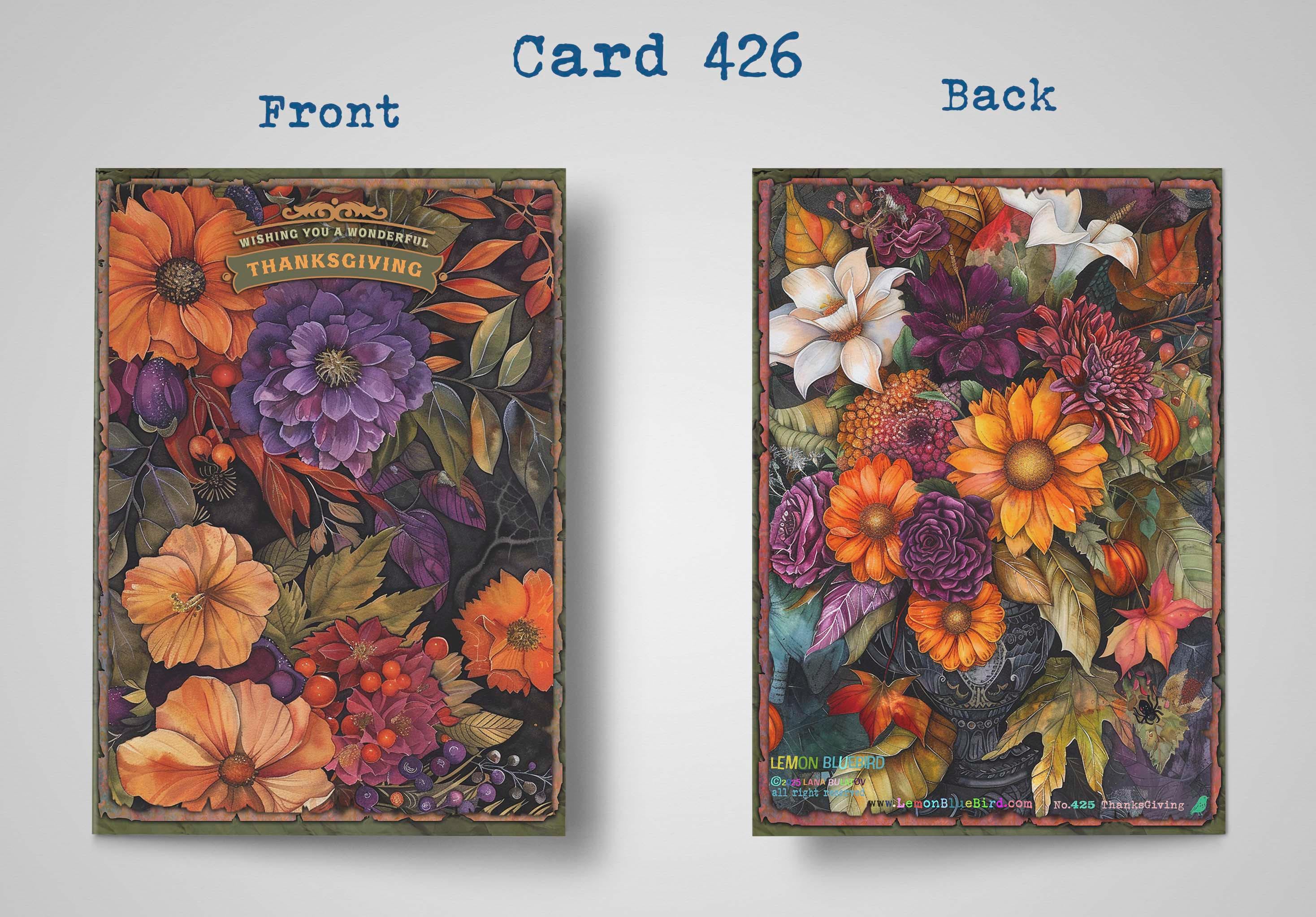 The back side of the card continues the celebration with a seamless cascade of jewel-toned florals and colorful fall leaves wrapping the edges, creating a rich, full-circle design that feels both joyful and refined.