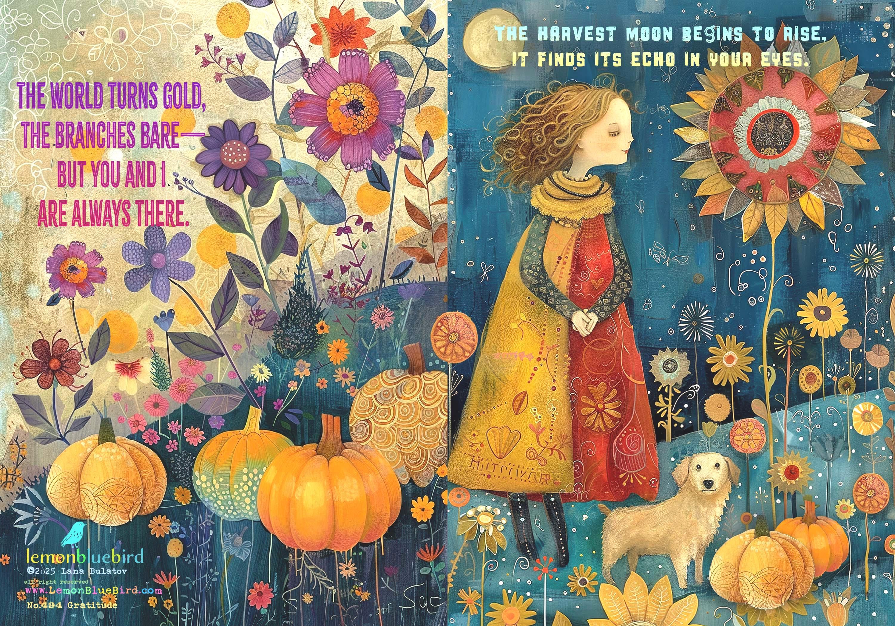 On the front, a girl and her faithful dog share a quiet moment beneath a glowing harvest moon. The sky shimmers in soft blues and lavender, while golden leaves swirl around them in the crisp night air.