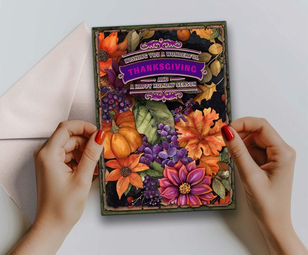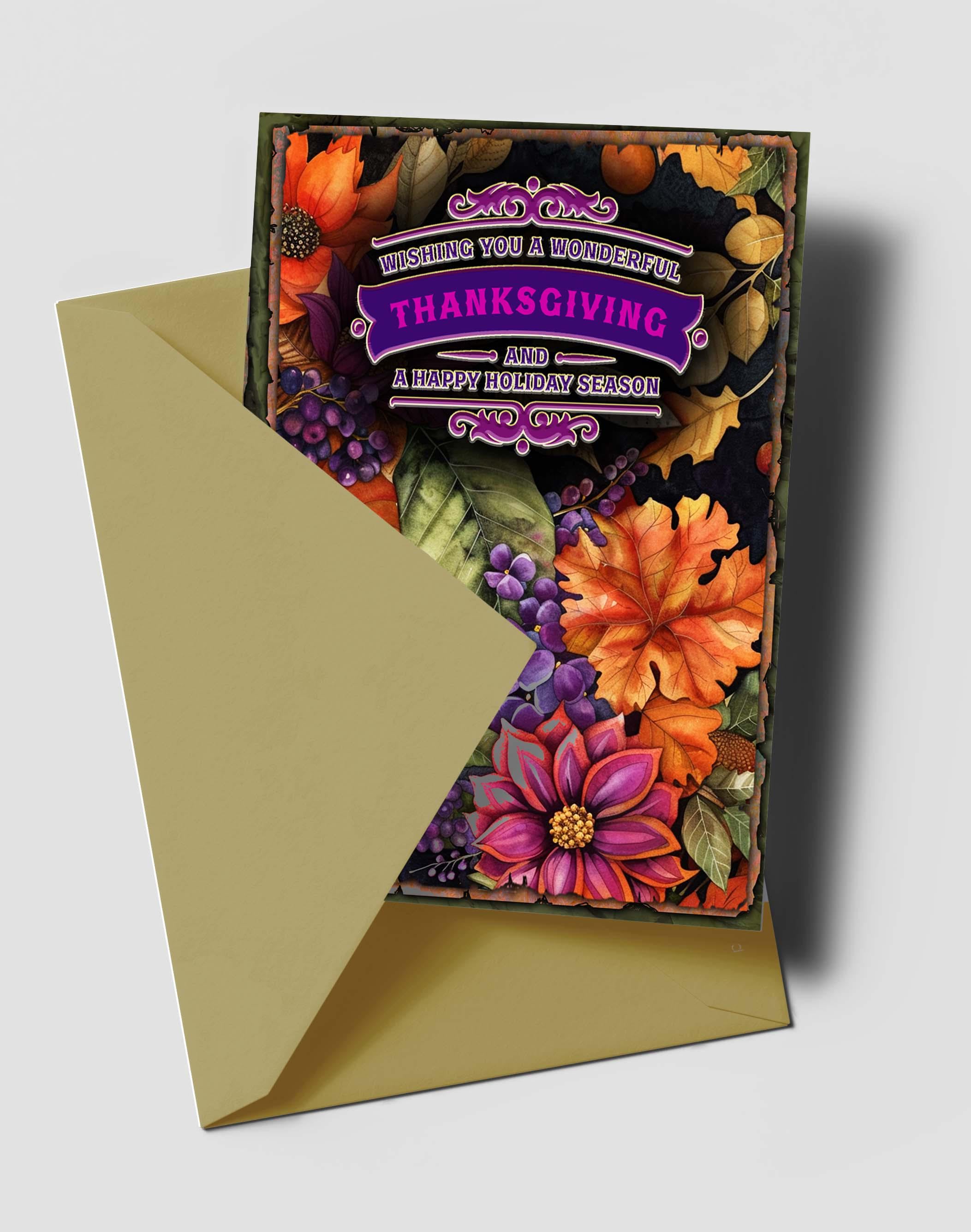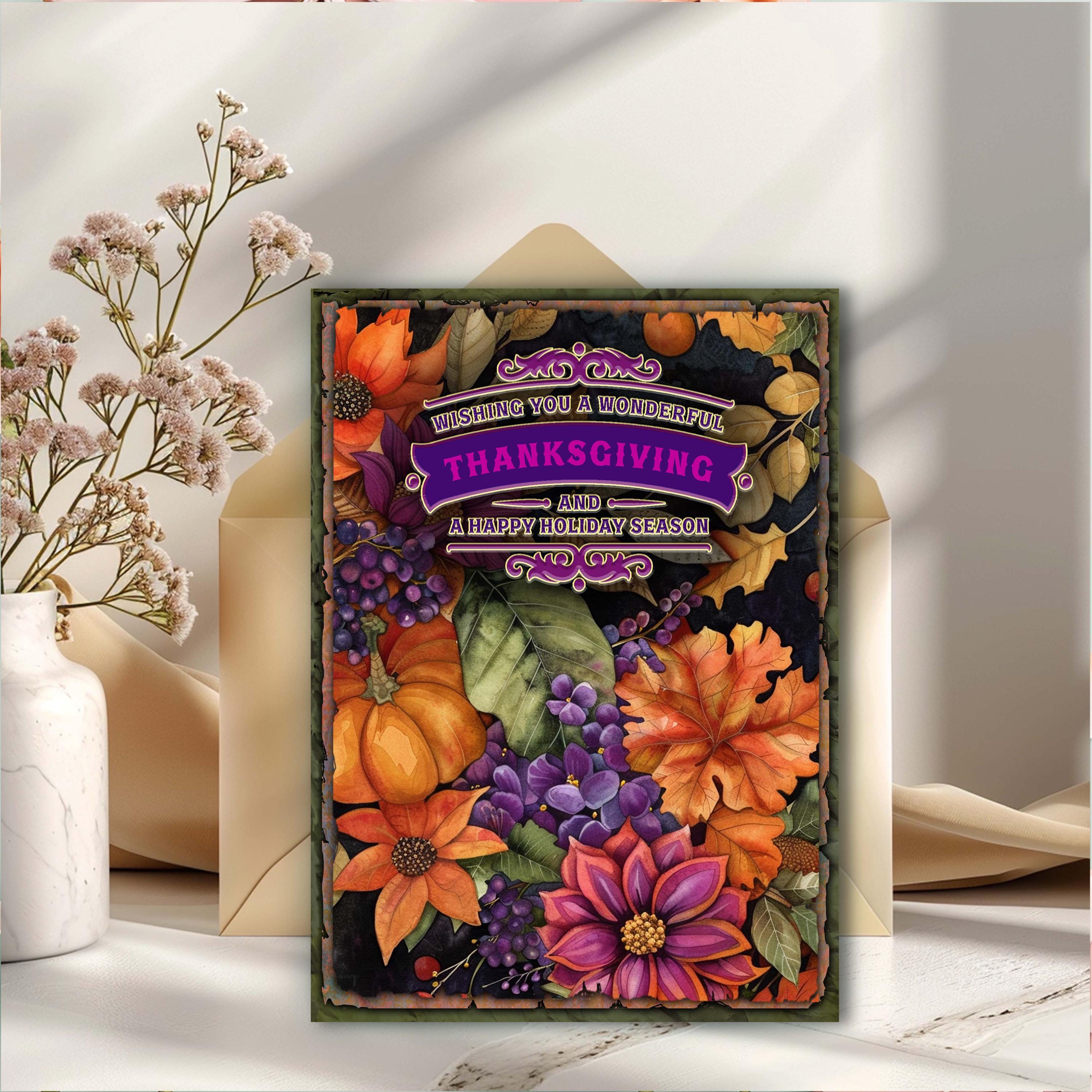 โคThis 5x7 folded, double-sided vertical Fall Thanksgiving Nature themed Holiday card is printed and delivered to you, featuring designs that extend seamlessly across both the front and back for a truly unique and artistic look.
